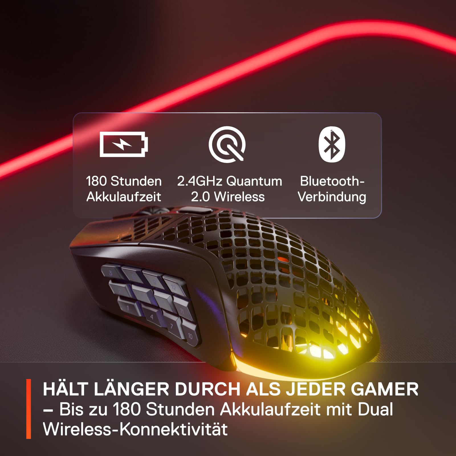 ["IMPRESSIVE RGB - The PrismSync RGB lighting with 3 zones shines in 16.8 million individually customizable colors","FEATHERLIGHT - The special surface with strategically placed openings reduces the weight to just 89g, allowing for lightning-fast gameplay","AQUABARRIER - The mouse's interior is protected from splashes, dust, and dirt thanks to the IP54 protection rating","18 PROGRAMMABLE BUTTONS - Execute the most complex rotations and access a variety of shortcuts with the 12 side buttons","OUTLASTS ANY GAMER - The lag-free Quantum 2.0 Wireless technology provides a 2.4GHz connection for gaming, additional Bluetooth 5.0 compatibility, and offers up to 180 hours of battery life"]