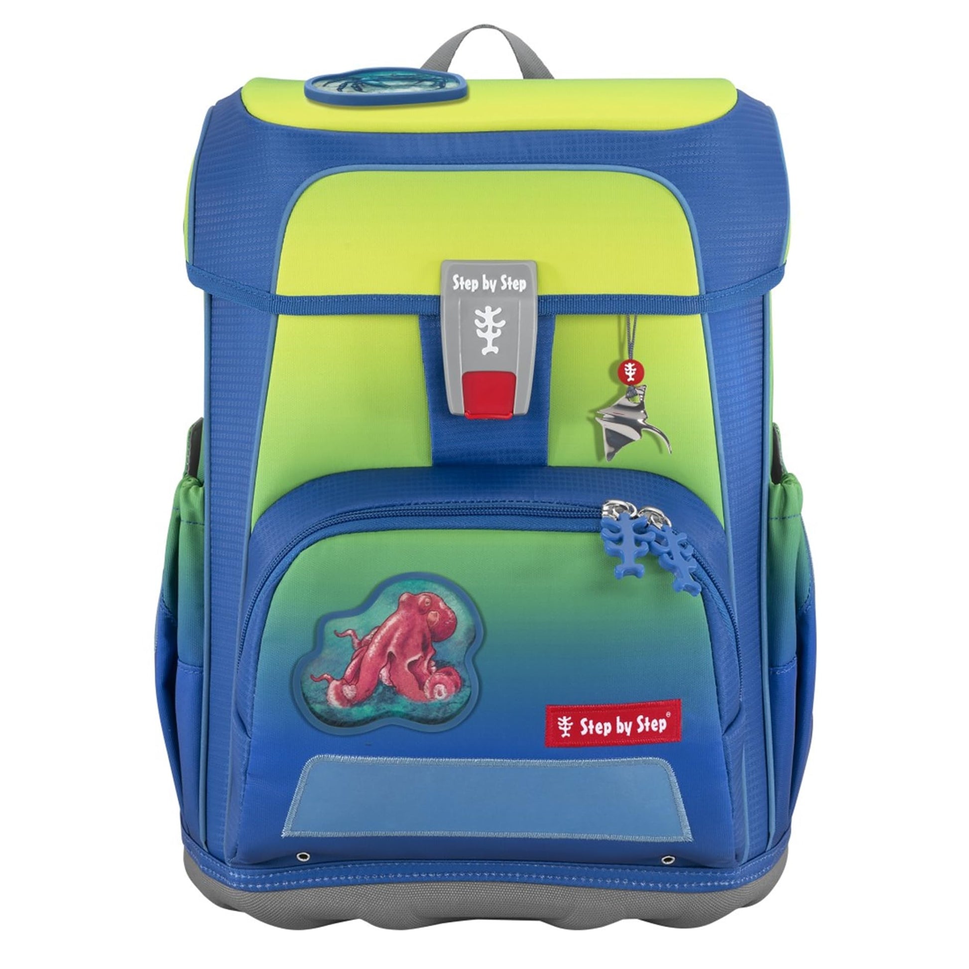 Step by Step school bag set, Cloud Ocean Red Octopus Pius, 5 pieces, yellow-blue Octopus design, ergonomic backpack with reflectors, height adjustable with hip belt, for 1st to 4th grade, 19L.