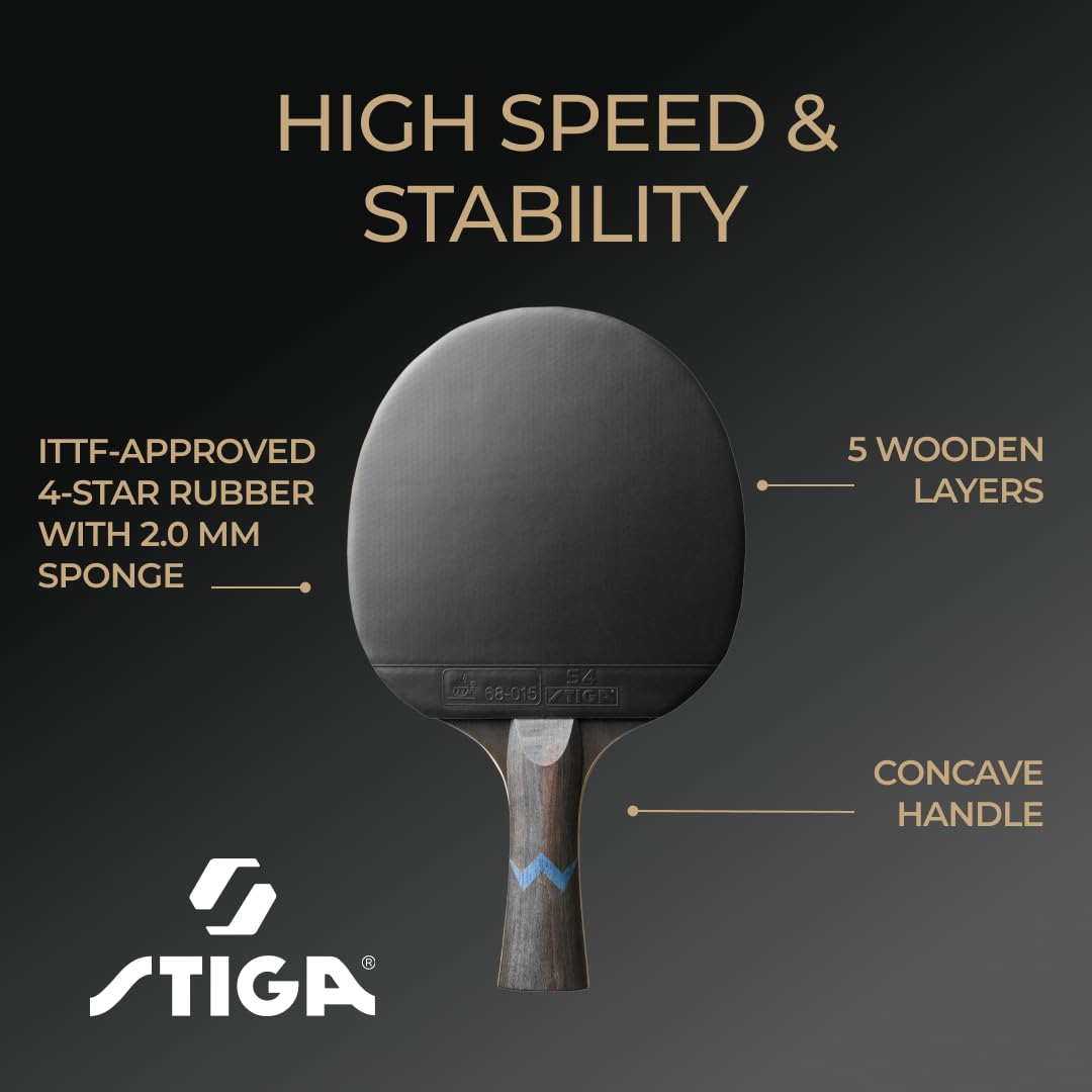 ["The Stiga Royal 4 Star Table Tennis Racket offers players looking for speed and control an optimal solution.","With a 5-ply wood frame, this racket is ideal for fast moves and precise shots.","The ITTF-certified STAR 4 rubber with 2.0 mm sponge provides outstanding ball feel and maintains control during play.","The ergonomic concave handle of the Pro Table Tennis Racket offers comfort and excellent grip for long playing sessions.","STIGA's Crystal Technology, an innovative surface treatment, enhances racket speed and maximizes your performance on the field.","Control: 46, Spin: 86, Speed: 92 - this racket offers a balanced ratio of control, spin, and speed.","STIGA Sports AB is a renowned company with years of experience in manufacturing table tennis products and a wide range of sports equipment for the whole family."]