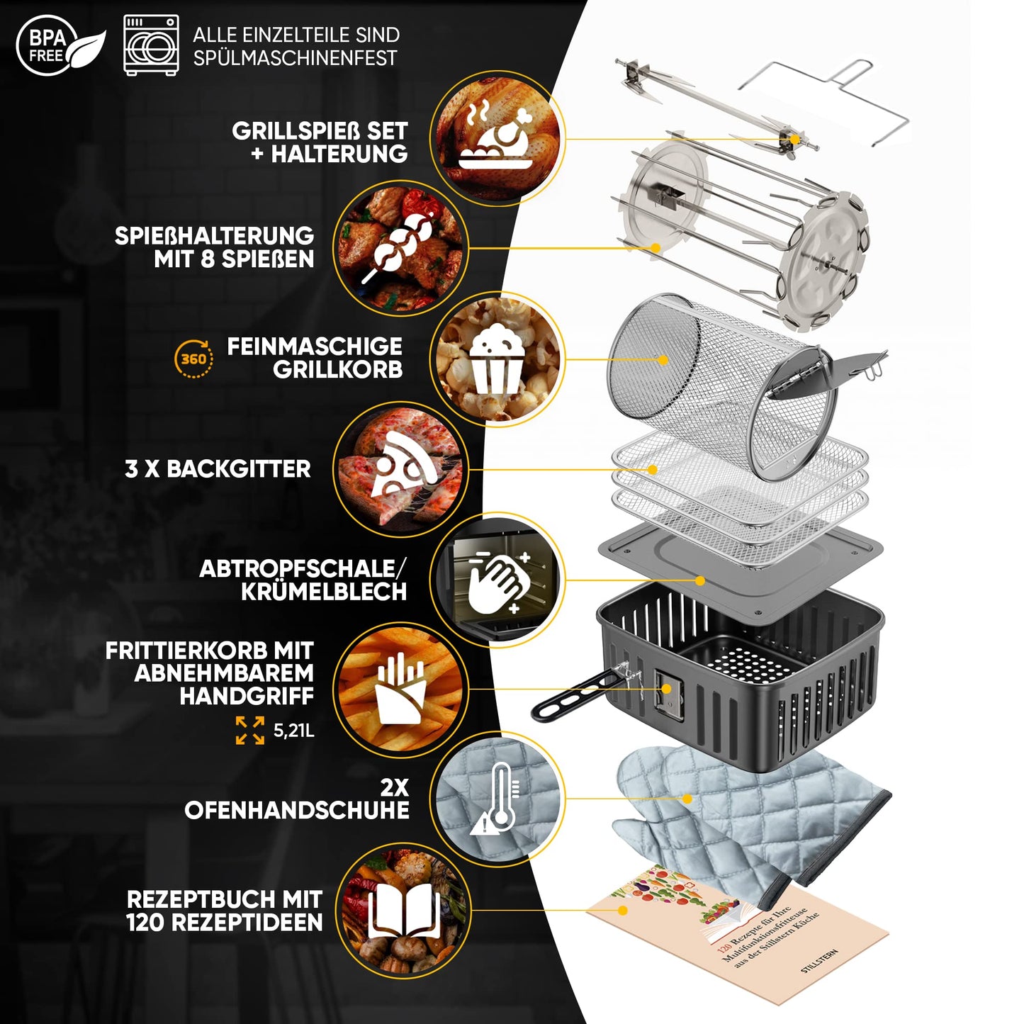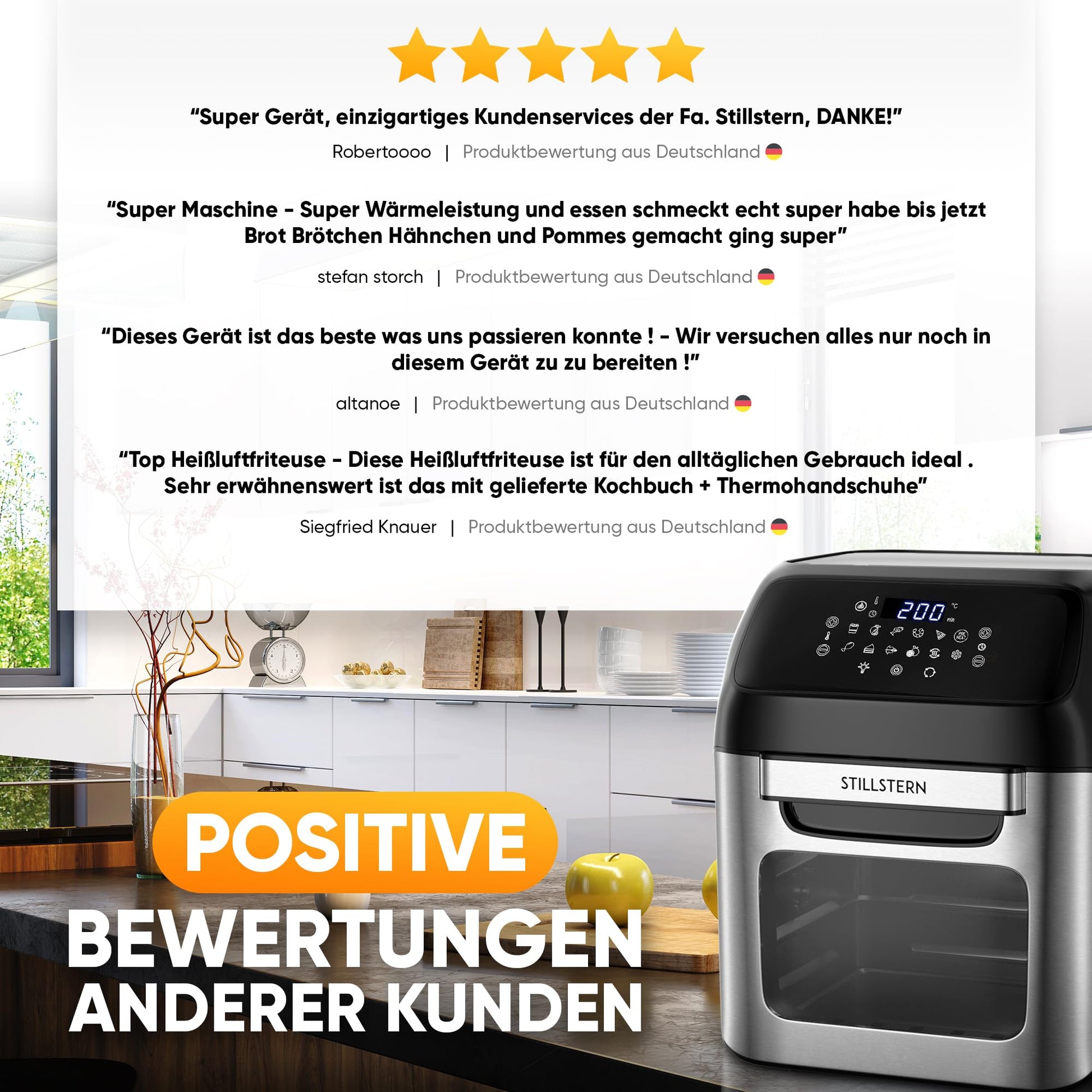 ["MULTIPLE AWARD WINNER - RATED 'EXCELLENT': The STILLSTERN Airfryer has been independently tested multiple times and received top ratings for its certified quality, easy operation, and versatile functions - perfect for daily use in your kitchen as an air fryer.","CERTIFIED SAFETY BY SGS: The XXL air fryer from STILLSTERN has been tested by the independent testing institute SGS and carries the GS seal - for certified safety and maximum reliability in your kitchen. Perfect for healthy frying with an XXL air fryer.","VERSATILE PROGRAMS AND EASY USAGE: Whether it's fries, chicken wings, dehydrating, baking, or keeping warm - with 12 automatic programs, you can easily make any dish with just a touch of a button. This air fryer includes a recipe book with 120 delicious ideas to get you started.","CRISPY ENJOYMENT - WITHOUT THE GREASE: Save up to 85% of fat thanks to innovative hot air technology. The PowerBoost function quickly brings this air fryer to 200°C - without preheating. For healthy, quick cooking with full flavor.","EASY CLEANING: All accessories such as the frying basket, basket, or baking grid of this air fryer are non-stick coated and dishwasher safe - for maximum hygiene with minimal effort.","SMART DISPLAY AND SHAKE FUNCTION: Large LED touchscreen with intuitive operation. Thanks to the shake function, you can open the door at any time - the program will automatically continue when you close it. Ideal for seasoning or flipping in your air fryer.","SAVE ENERGY - 64% MORE EFFICIENT THAN AN OVEN: Quick to heat up, precise temperature control, and energy-saving. This XXL air fryer saves electricity and costs - the ideal solution for sustainable cooking in everyday life.","POWERFUL AND EFFICIENT: With 1800 W power, 360° circulation, and even heat distribution, your dishes turn out crispy on the outside and juicy on the inside - energy-efficient, fast, and reliable, just as you would expect from a modern XXL air fryer.","GERMAN CUSTOMER SERVICE AND WARRANTY: Two years manufacturer's warranty plus 30 days money back guarantee. Our German service team is available 365 days a year - with lifelong support directly from the STILLSTERN service center."]