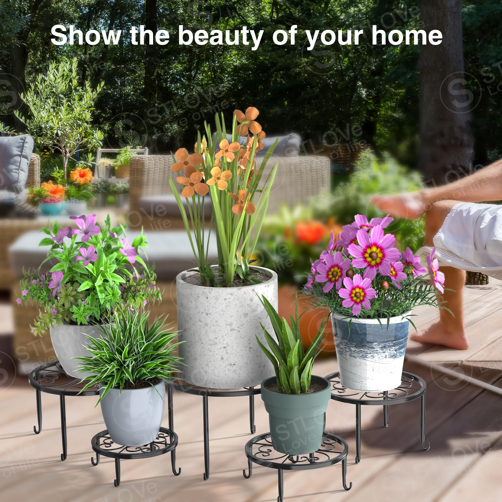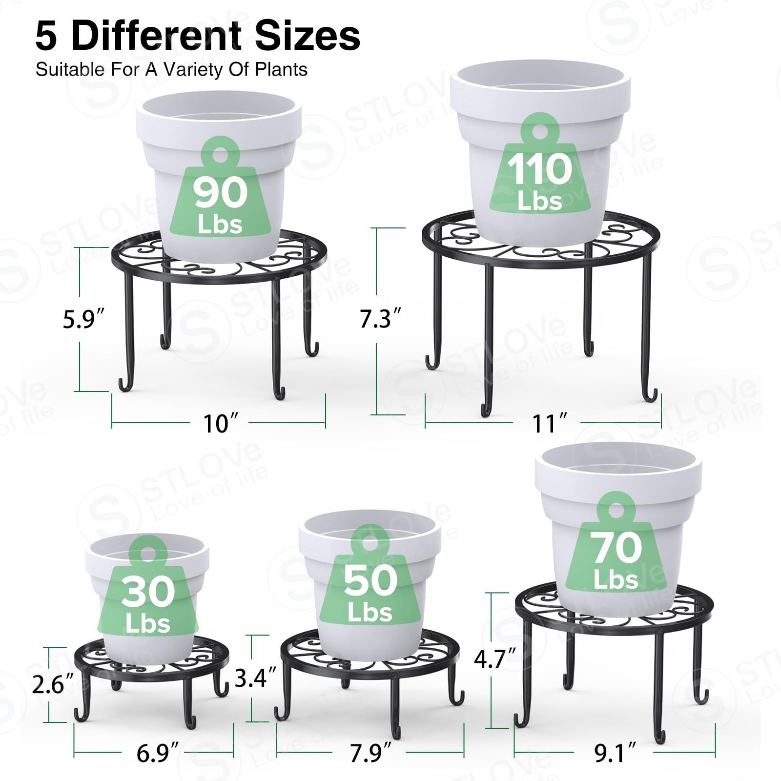 ["šŸŒ“ć€Multiple Sizes怑Our plant stands include 5 metal plant stands (7.1/7.9/9.1/9.8/11 inches) made of high-quality metal and designed with four support points. Plant shelves can carry loads of up to 110 lbs, perfect for small to medium-sized plants, making the plant layout more artistic and well-proportioned.","šŸŒ“ć€Stable and Rust-Free Durability怑This plant stand is made of metal, durable and smooth to improve its stability and balance. The surface of the pot stand is coated with an anti-rust coating to ensure durability without rusting. The legs are curved to avoid shocks and pressure points.","šŸŒ“ć€Floor Protection怑The metal plant stand has four support points, the curved four-legged stand base has a large contact area with the floor and will not scratch your floor. Plant supports keep potted plants at a certain height above the ground to protect the floor and carpet from moisture and mold, while also allowing plants to receive more sunlight and air to grow properly.","šŸŒ“ć€Wide Application怑Various sizes of plant stands to hold any plant you like. You can place plants, potted trees, vases, and even trash cans. In addition, it can be used in kitchens, parties, pet feeding, etc. The advanced texture makes your pots and home more stylish.","šŸŒ“ć€No Installation Required怑Metal plant stands can be used directly and conveniently stored. The top of the plant stand with a beautiful floral pattern adds a decorative touch. This is a gift that will surprise someone who enjoys gardening for any occasion."]