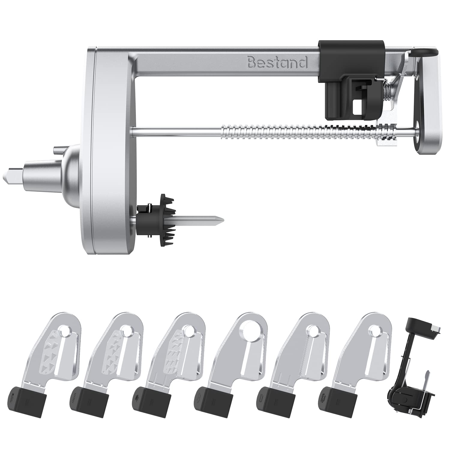 ["Spiralizer attachment fits all KitchenAid stand mixers.", "6 quick-change blades and one spare peeling blade included: 3 spiral blades (medium, fine, and extra fine), 3 slicing blades (large core slicing, small core slicing, and thin slicing), 1 peeling blade.", "All blades are dishwasher safe on the top rack, and the spiralizer can be wiped with a warm, damp cloth.", "We provide high-quality, durable metal construction for long-lasting use. All parts are easy to pack up and organize in their own storage case.", "We stand behind the quality of our spiralizer attachment and are happy to offer you a 1-year manufacturer's warranty and 7 x 24-hour online customer service at no extra cost."]