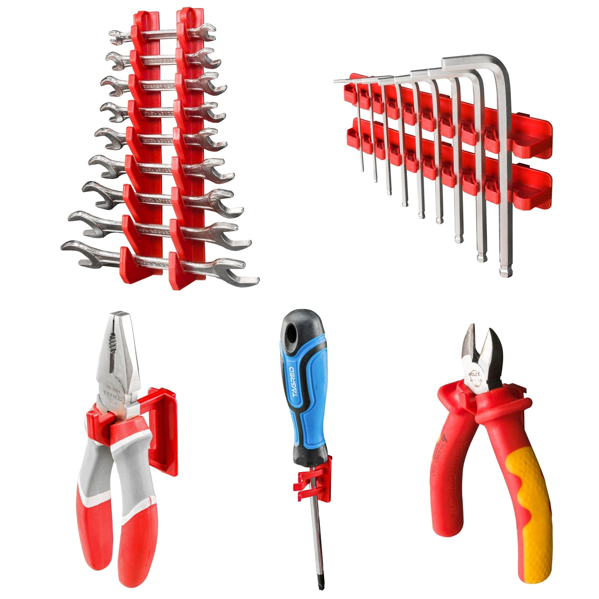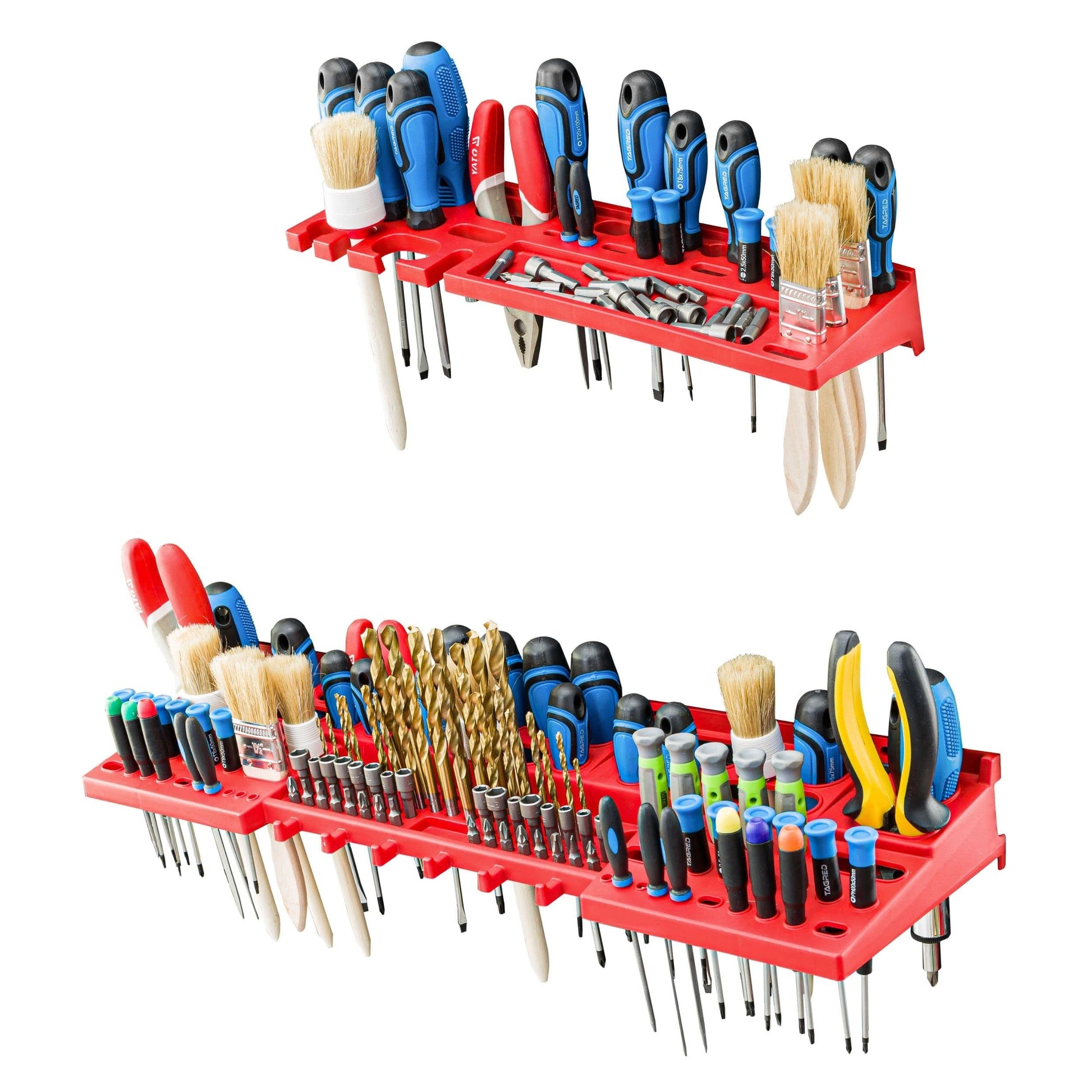 ["STORAGE SYSTEM MADE OF ROBUST PLASTIC - The polypropylene used is resistant to extreme temperatures, chemicals, and mechanical damage - ideal for any workshop","EASILY EXPANDABLE THROUGH MODULAR DESIGN - The storage system can be customized by adding more wall plates, tool holders, racks, or containers to the existing space","VERSATILE USE - The tool wall can be mounted in the garage, basement, garden shed, or office directly in the production hall; great addition to a workshop shelf","ORGANIZATION IN TOOLS AND LESS STRESS - The pegboards and attached holders and bins create space for all tools and small parts, allowing easy access","A PERFECT GIFT - The tool wall is a perfect solution for any DIY enthusiast or hobbyist looking to finally tidy up their tool shelf and get an overview of their own tools"]