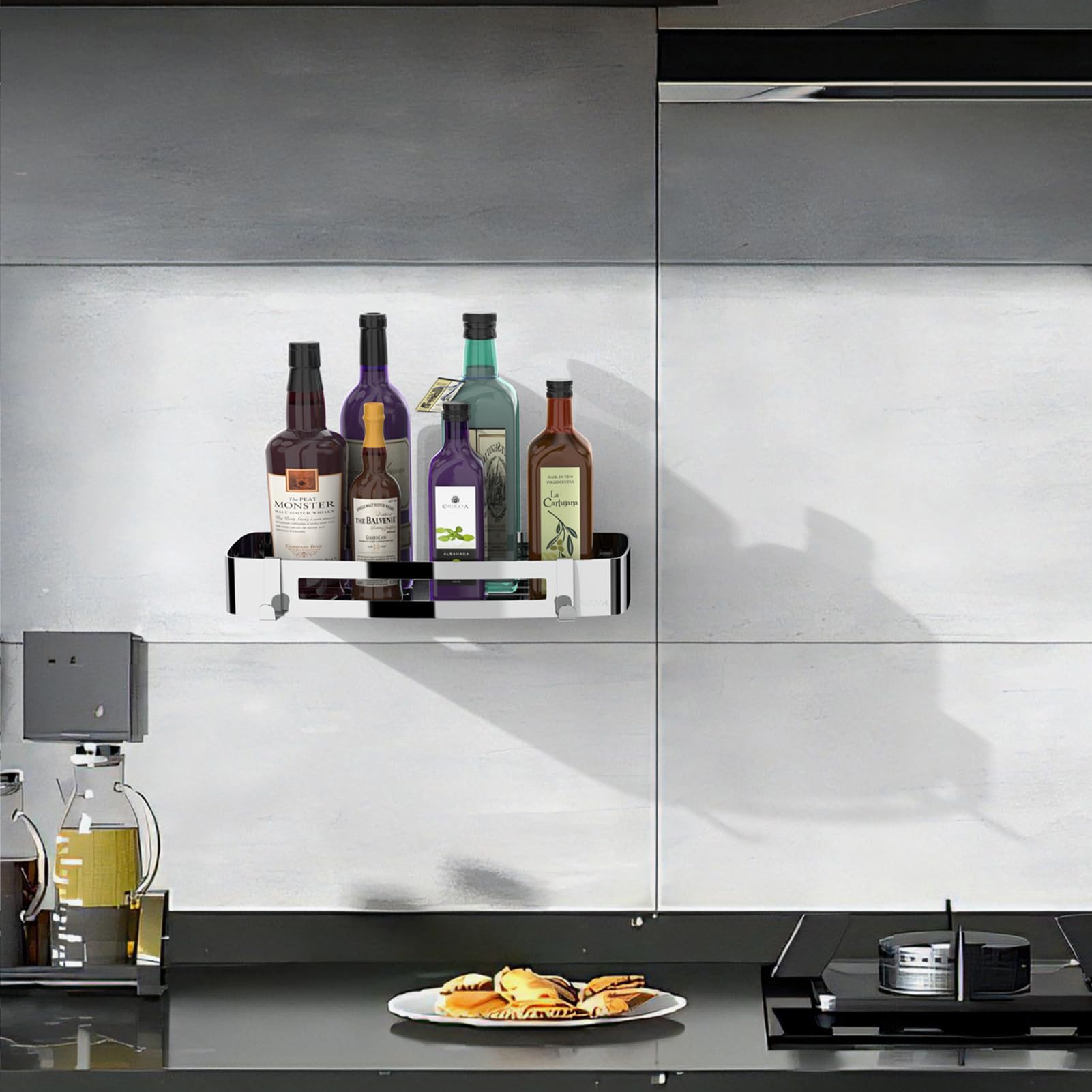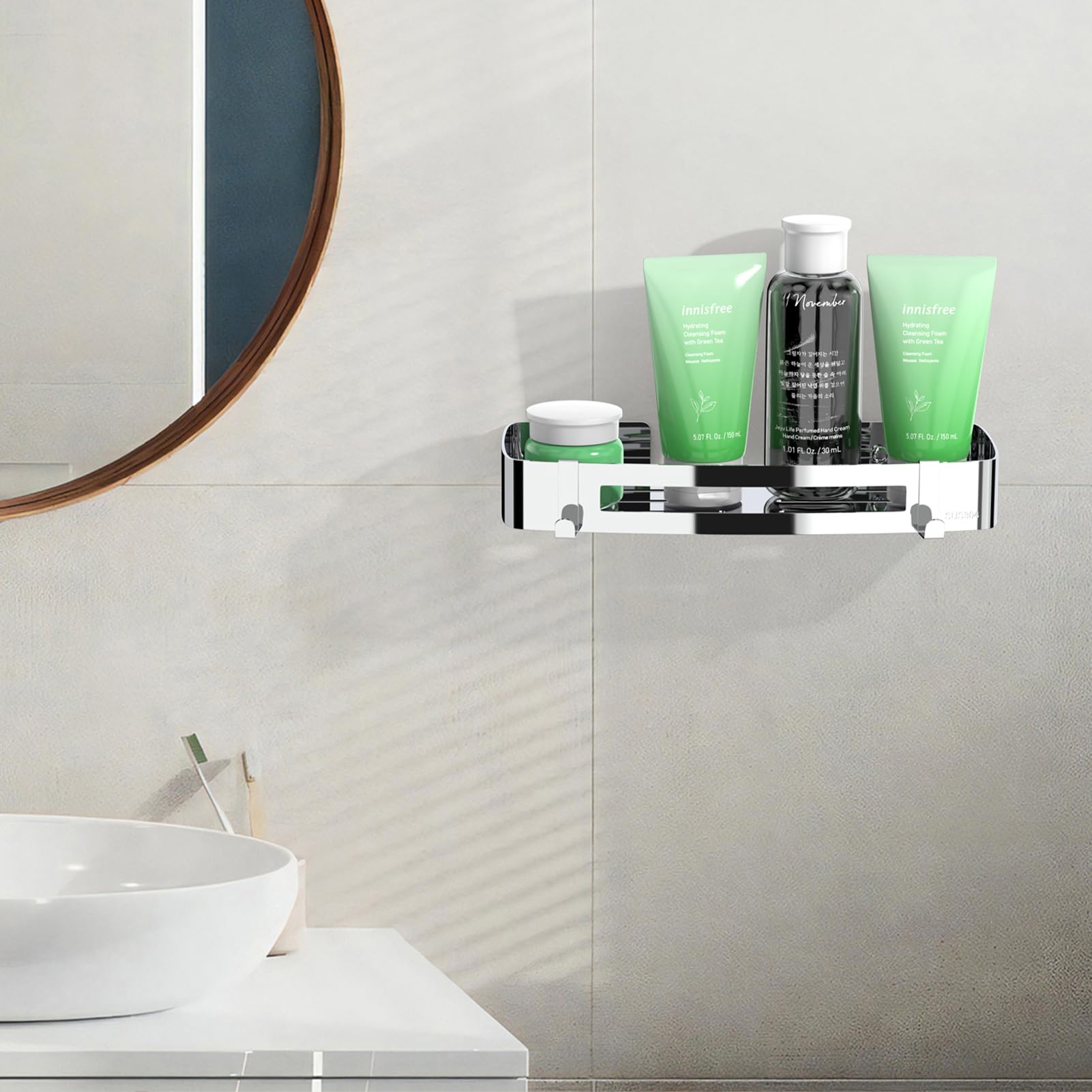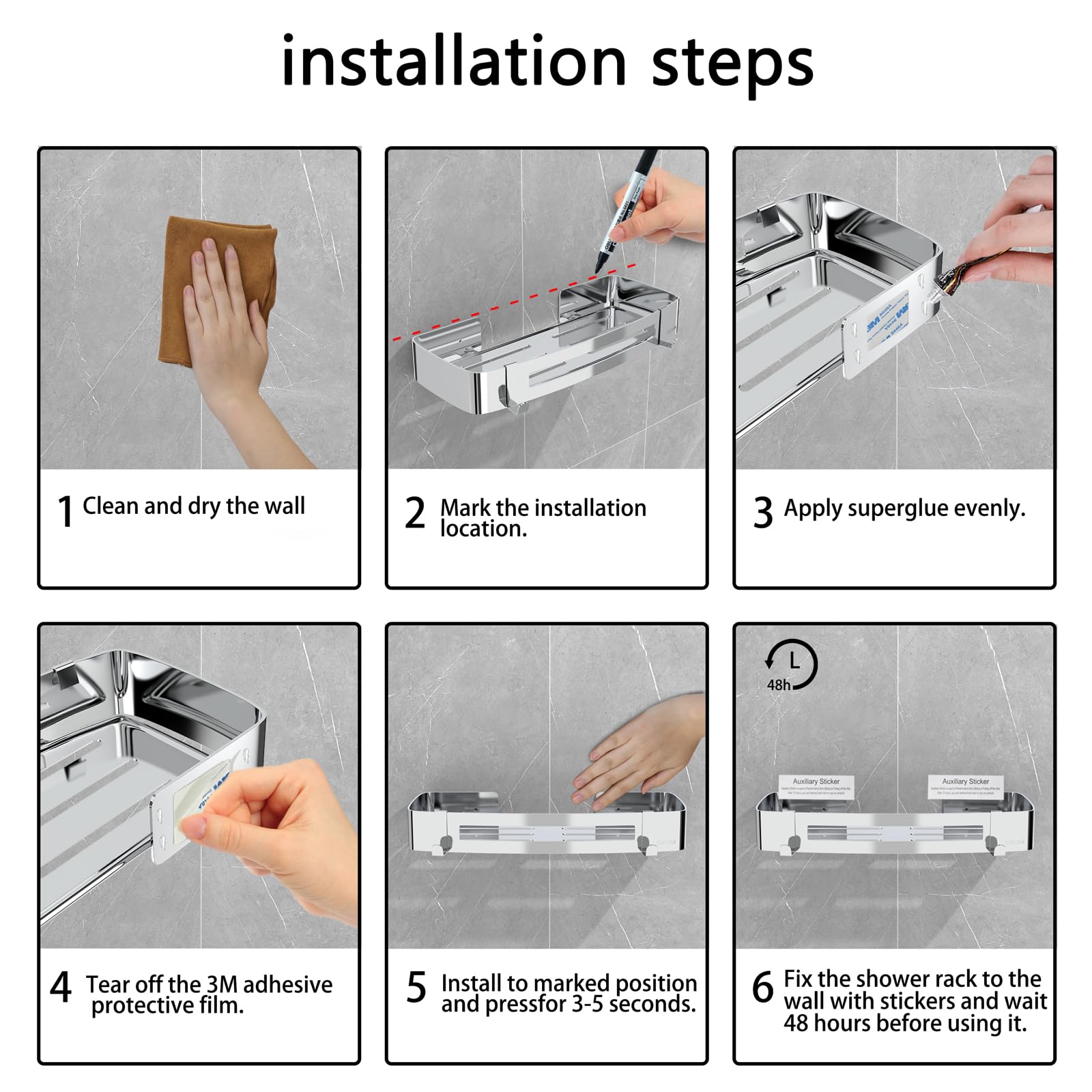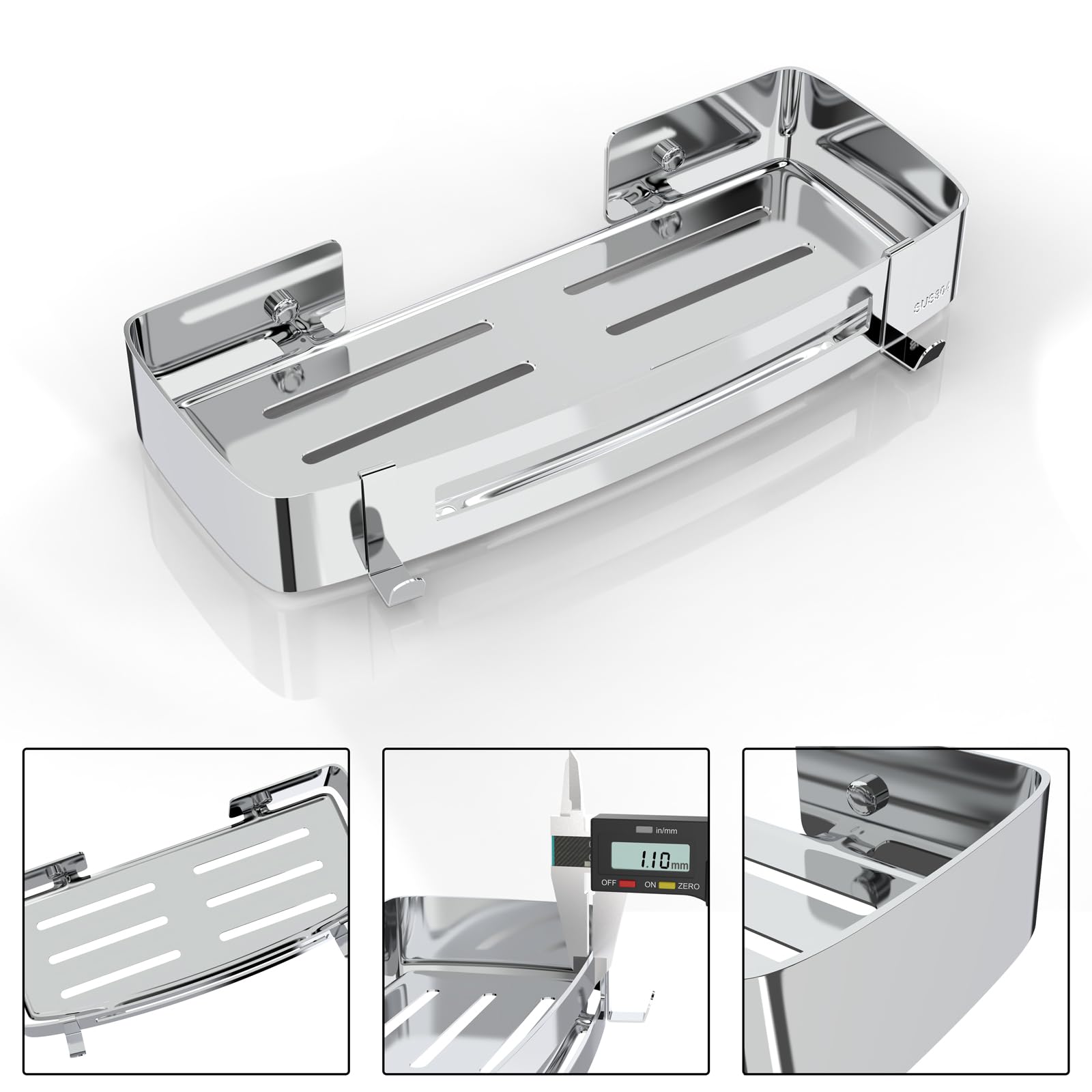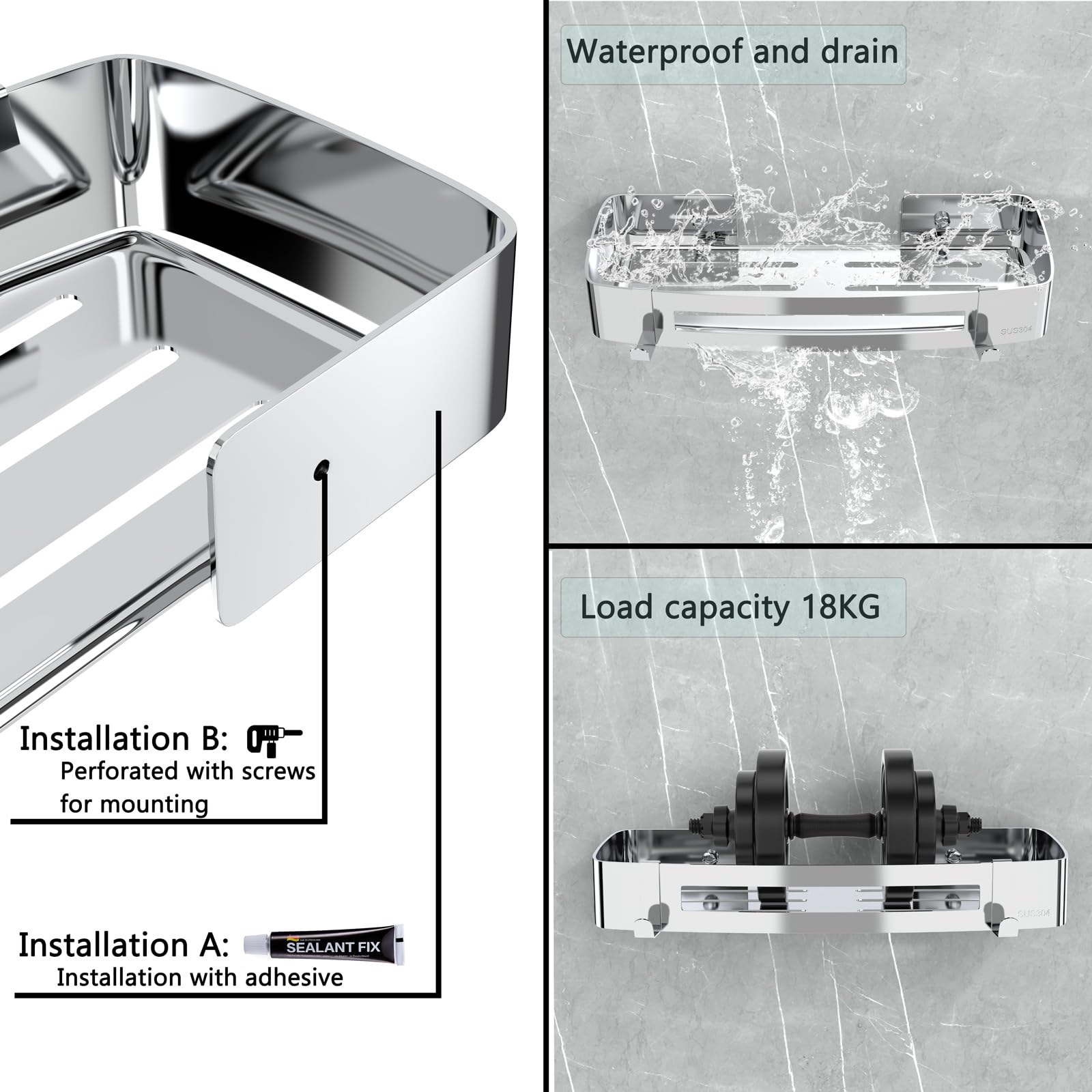 ["【304 Stainless Steel】The shower caddy is made of high-quality SUS 304 stainless steel, thick and wear-resistant, with a high-quality design, stylish and beautiful, rustproof, scratch-resistant, corrosion-resistant, and can remain intact for many years even in wet environments.","【Drain Hole Design】The shower shelf has a hollow design, which not only looks beautiful but also effectively prevents water accumulation and keeps it dry, preventing items on the shelves from breeding bacteria.","【Two Installation Methods】① No drilling (no surface damage): You can use the included instant glue to securely attach the shower shelf to the wall. ② Drilling required: If you want to install it on uneven walls, we also provide drilling accessories.","【Large Capacity】The size of the shower shelf without drilling is: 30×12.5×4.5 cm, the shower shelf can hold 18 kg, and the shower caddy provides enough space for your toiletries. The flat bottom and reinforced fence prevent items from slipping. 2 hooks on the bottom for hanging towels or bath balls.","【Buy with Confidence】We promise a 30-day money-back service and replacement quality assurance. If you have any questions, feel free to contact us. We will respond to your email within 24 hours."]