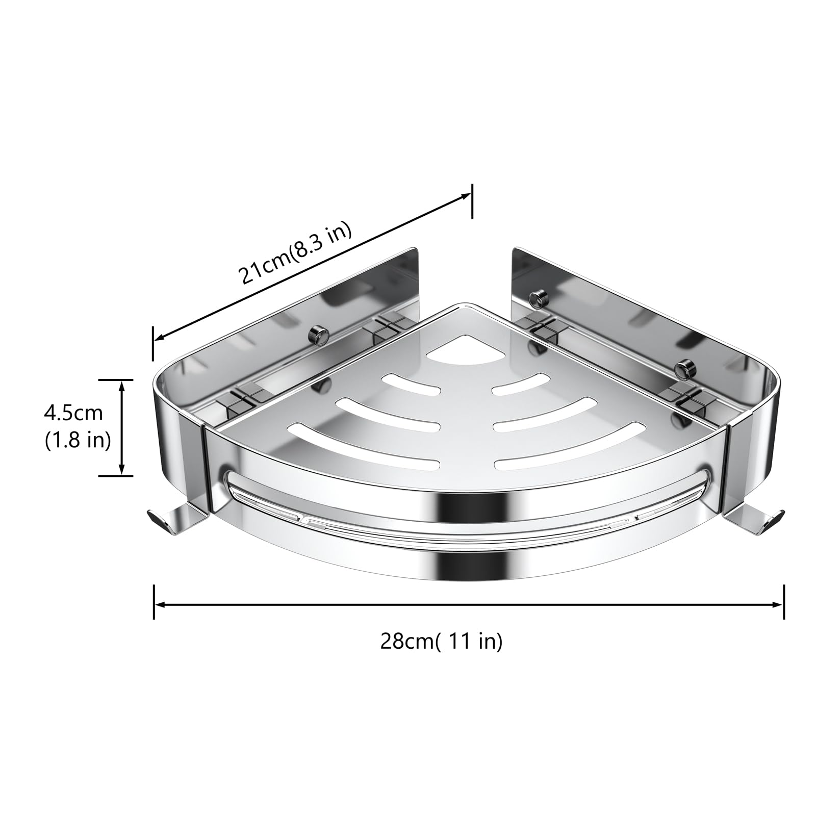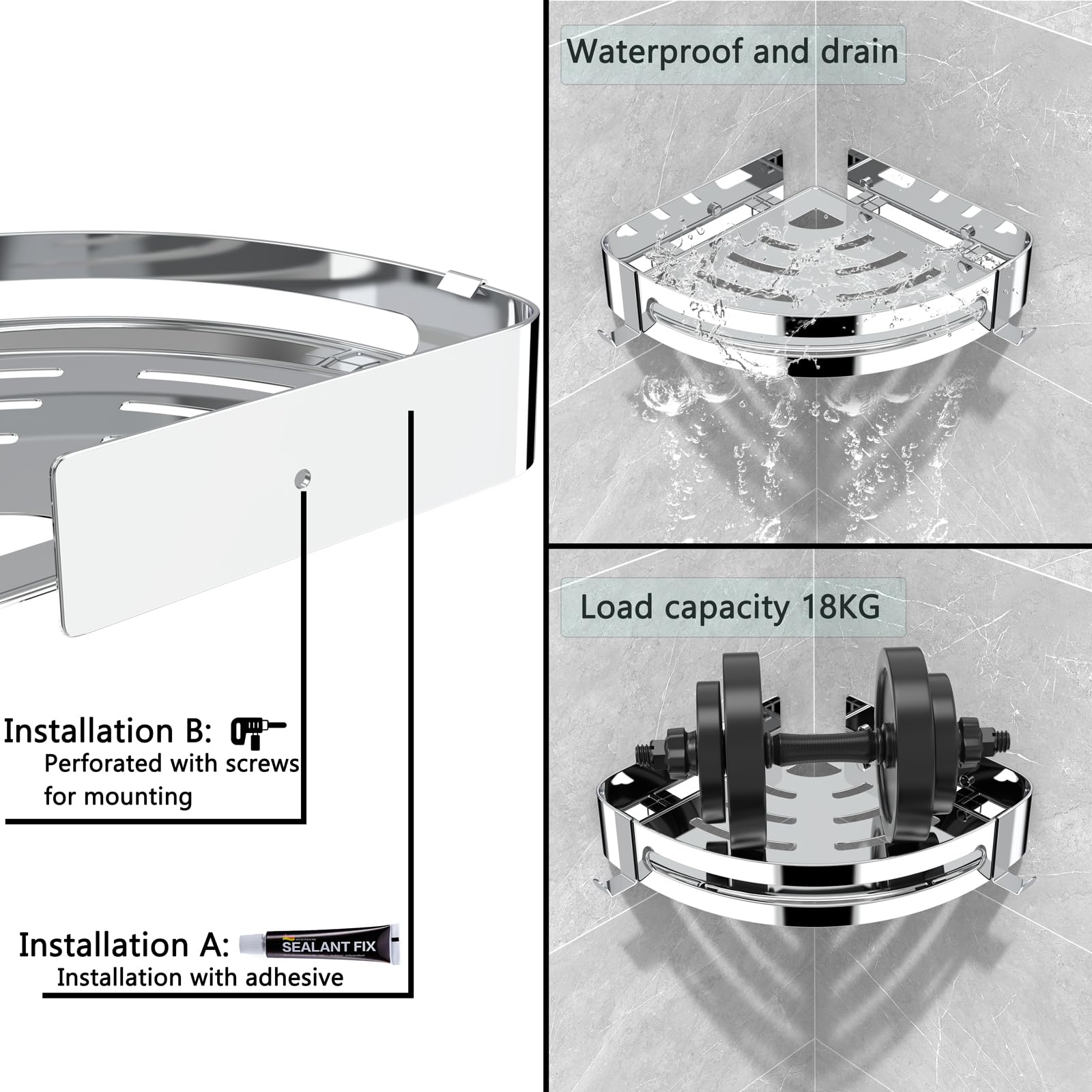 ["Waterproof and rustproof. Shower shelf is made of high-quality SUS 304 stainless steel, which is easy to clean, rust-resistant, scratch-resistant, and durable.","Drain hole design. The bathroom shelf has a hollow design, which not only looks beautiful but also effectively prevents water accumulation and keeps it dry.","Two installation methods.① No drilling (no surface damage): You can use the included instant glue to securely attach the shower shelf to the wall. ②Drilling required: If you want to install it on uneven walls, we also provide drilling accessories.","Large capacity. 28.5 x 21 x 4.5 cm, the shelves can hold 18 kg and the shower shelf provides enough space for your toiletries. The flat bottom and reinforced fence prevent items from slipping around.","Buy with confidence. We promise to provide 30-day money-back service, replacement quality assurance. If you have any questions, feel free to contact us, we will respond to your email within 24 hours."]