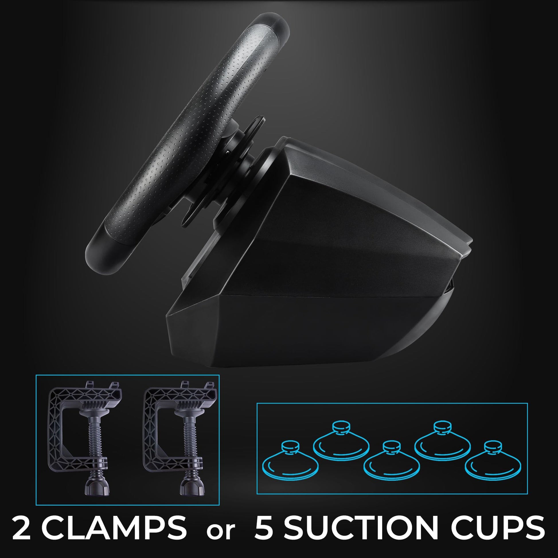 ["Compatible with Xbox Series X/S; PS4; Xbox One (this product is not PS5 or PC compatible)","Manual gear shifter; Wide pedals with footrest system and gas; brake; and clutch pedal; Dual vibration motor only in sequential mode via shift paddles; Shift paddles +/-.","270° steering angle; Sensitivity adjustment (3 levels of sensitivity); Gamer headset compatible.","Suction cup or clamp mounting system for simulation seats.","Fully programmable; compatible with all racing games on PS4 and Xbox (Gran Turismo 7, Forza Motorsport 7, Forza Horizon 5, Project Cars 2, F1 2020, Need for Speed, Dirt, WRC, Grid, V Rally 4, Gear Club 2, GTA V...) This product is not PS5 or PC compatible"]
