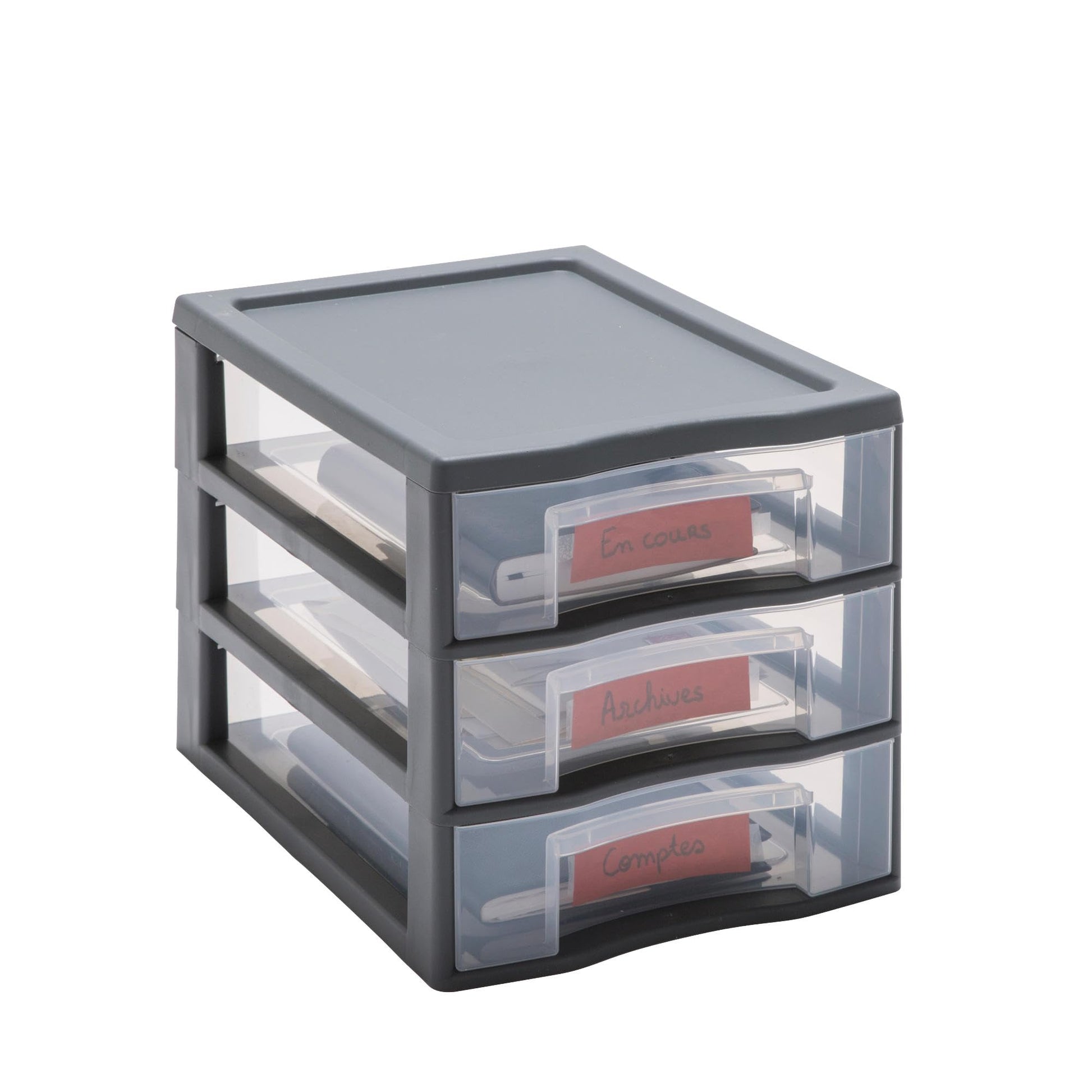 SUNDIS Day Tower, plastic drawer unit, grey, 3 transparent drawers for A4 paper, height 25.5 cm, stackable, great for desk, classroom, documents, accessories.