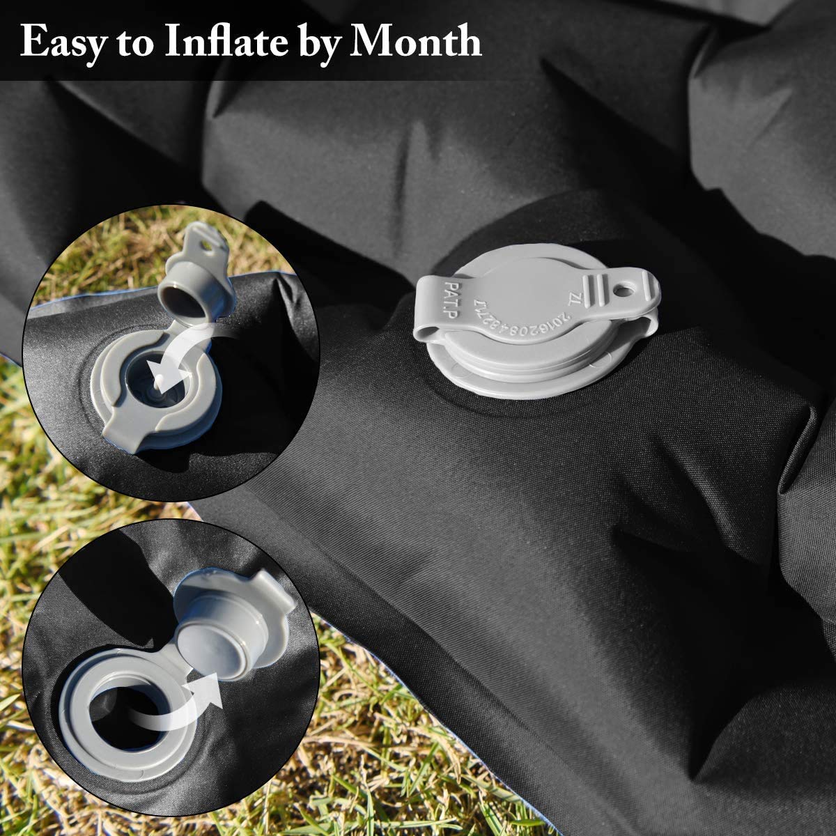 ["【Quick Inflation】The camping mat inflates super quickly with 5-6 full breaths and deflates in seconds through the air valve. The large one-way valve on this mat prevents it from emptying between breaths. (Air pump not included)",