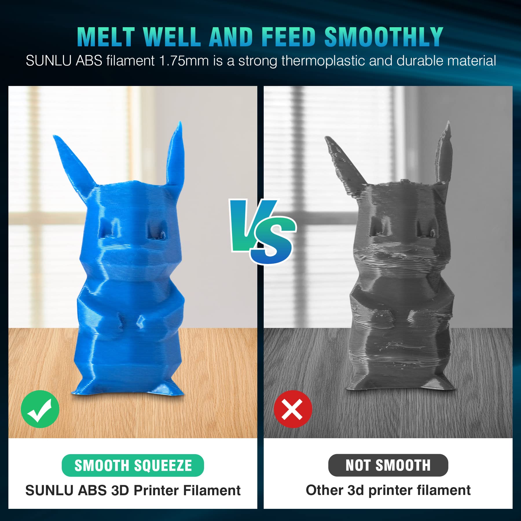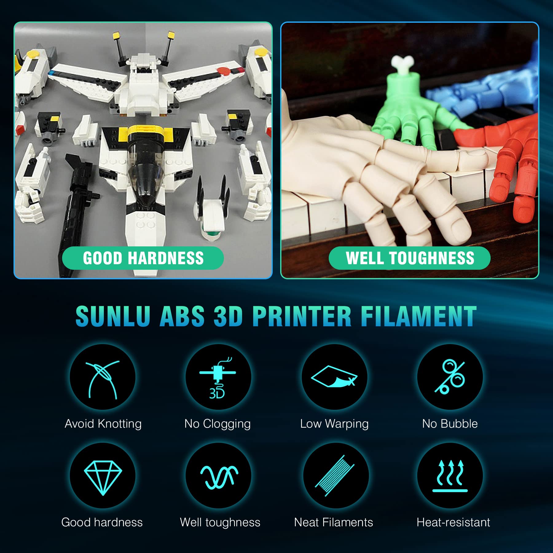 ["①【High Strength】SUNLU ABS Filament provides excellent tensile and flexural strength, effectively resisting cracks and breaks under tension.","②【Impact Resistant】SUNLU ABS filament is designed to withstand drops and rough handling, ensuring long-lasting performance in various applications.","③【High Heat Resistance】Our ABS Filament maintains its structural integrity even at high temperatures, making it ideal for demanding environments.","④【Smooth Printing Experience】SUNLU ABS Filament 1.75mm is engineered for easy extrusion, resulting in fewer clogs and a more reliable 3D printing process.","⑤【Versatile Applications】SUNLU ABS filament is ideal for producing parts for cars, electronics, and household items in 3D printing.","⑥【Post-Processing Friendly】SUNLU ABS can be easily sanded, painted, or glued, allowing for a professional finish on your 3D printing projects.","⑦【Low Shrinkage】Minimizes deformations during cooling, ensuring precise dimensions and a clean finish with SUNLU ABS 3D printer filament.","⑧【Good Layer Adhesion】Ensures strong bonds between layers for improved structural integrity when 3D printing with SUNLU ABS Filament 1.75mm.","⑨【Minimal Odor】Produces very little odor during printing, suitable for indoor use without any discomfort when using SUNLU 3D printing filaments.","⑩【Vacuum Packaging】SUNLU 3D printer filaments are vacuum-sealed to keep them moisture-free and maintain quality from the factory to the printer."]