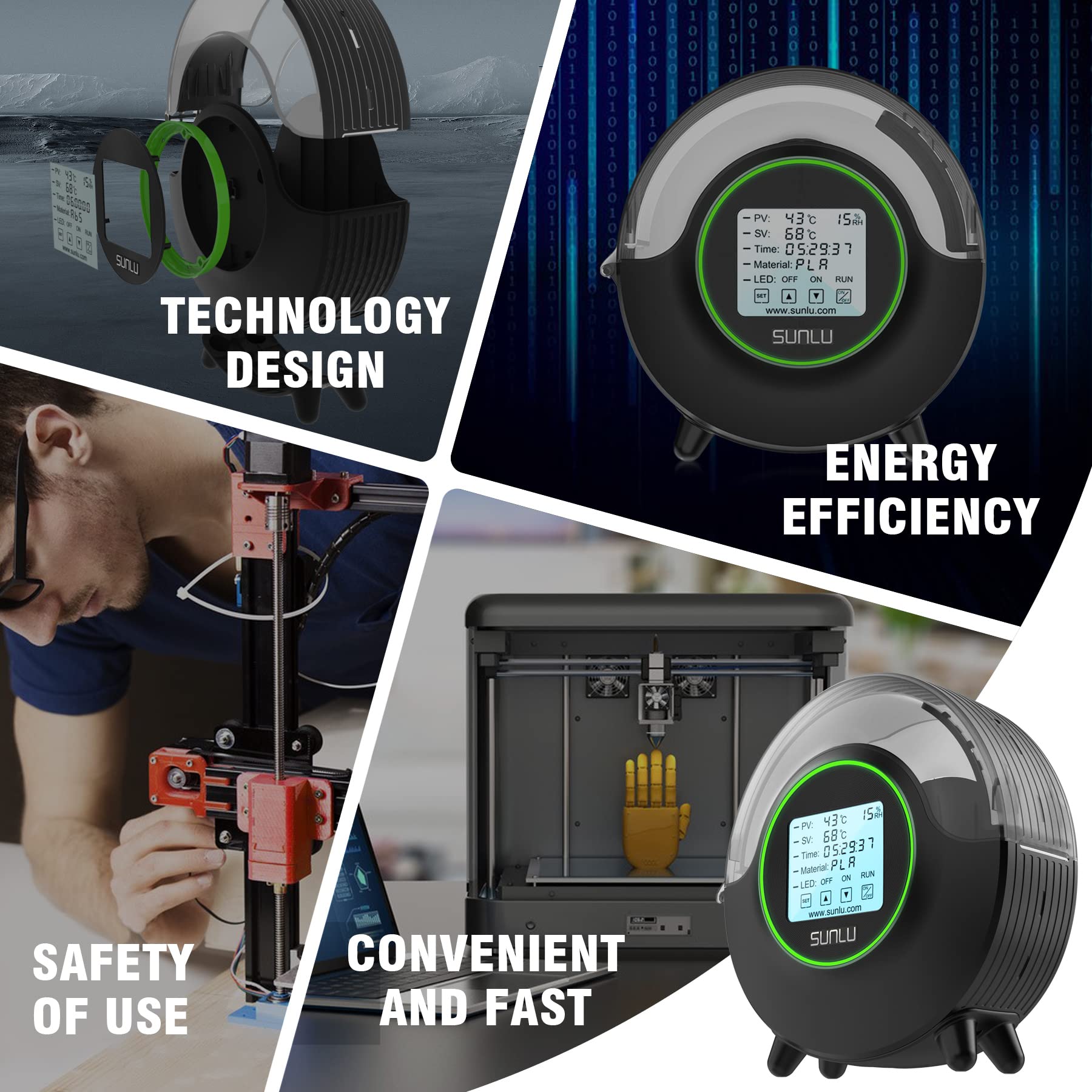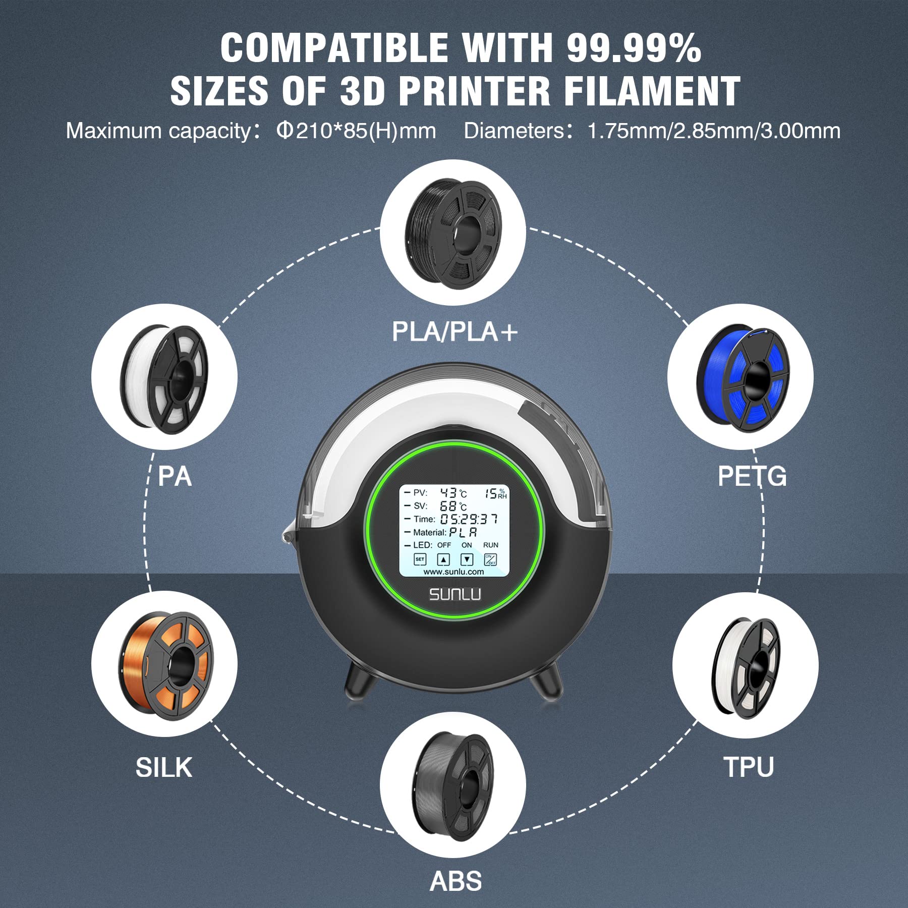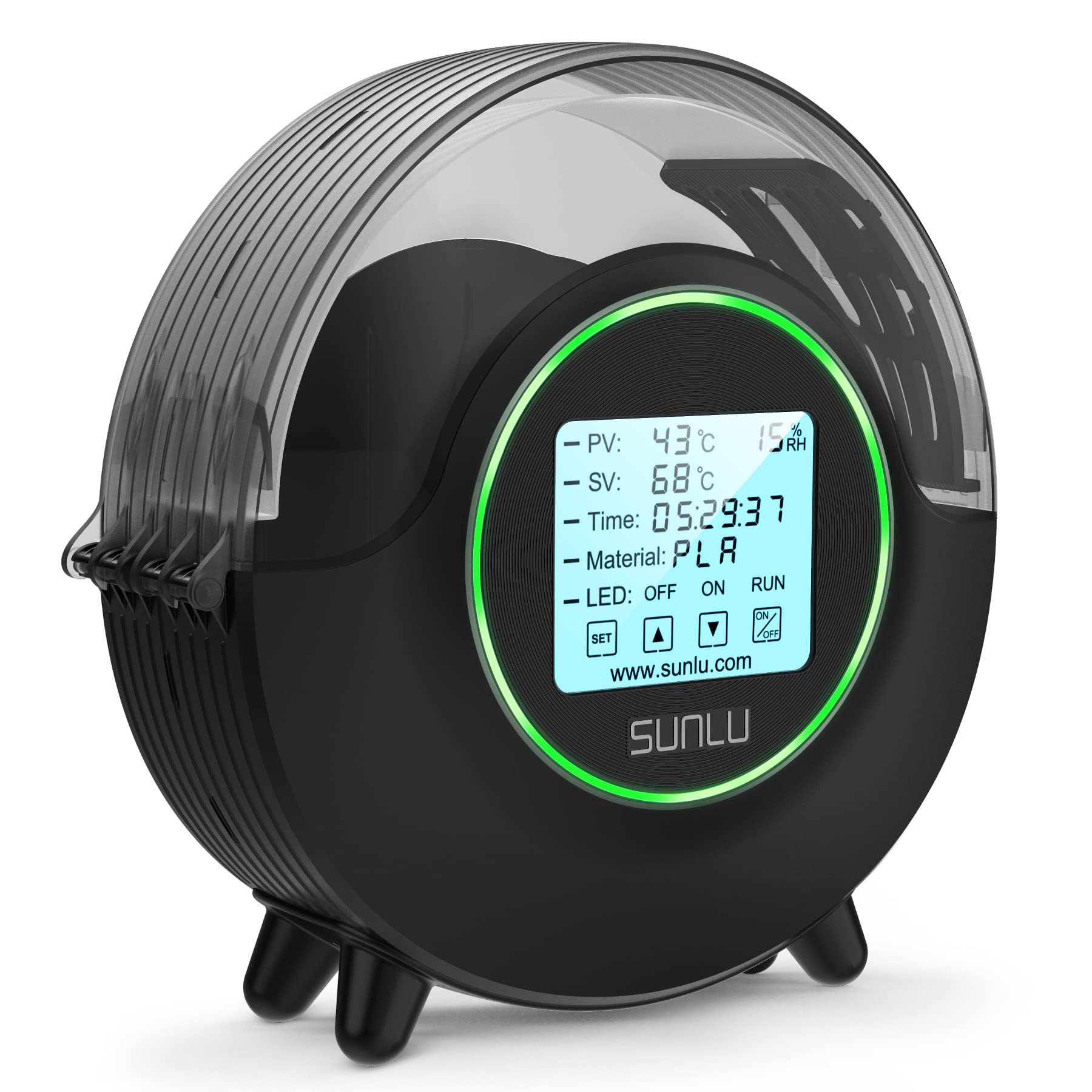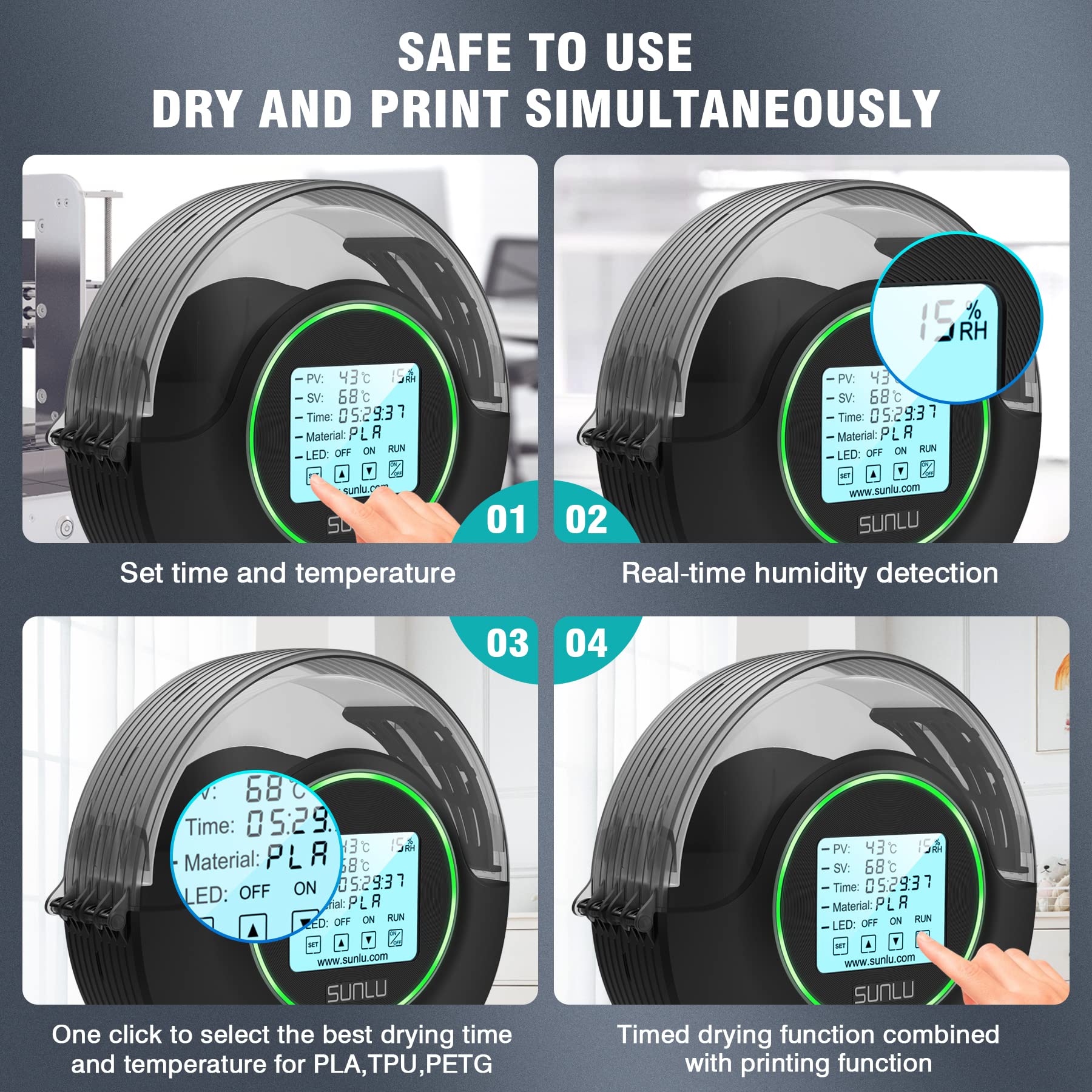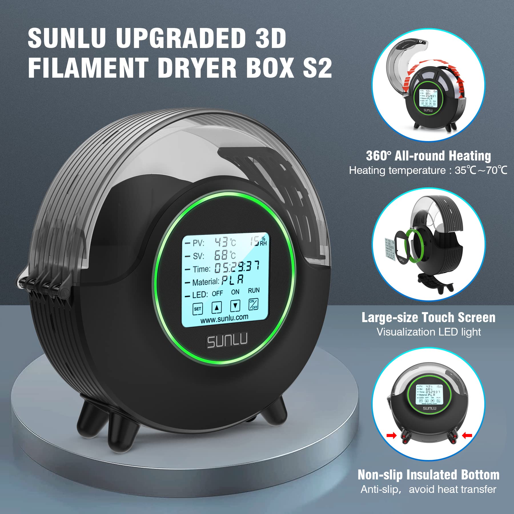["①【360° Quick and Even Heating】SUNLU S2 Filament Dryer Box is made of environmental-friendly PC plastic and equipped with double heating elements, heating temperature range: 35-70℃, the efficiency of filament drying is increased by 30%, effectively removing filament moisture. The new version of Filadryer S2 is evenly heated inside, time setting range: 1-99h, and drying time can be set according to filament moisture.","②【Large Touchscreen & One-Click Preset】Backlit high-end touchscreen: 3.42*2.87inch (8.69*7.29cm), precise operation and quick touch response, intuitively displaying various filament drying parameters in real-time. SUNLU S2 Dryer Box sets the best drying time and temperature for various 3D printing filaments PLA ABS PETG, simply click to quickly dry the filaments, easy to use.","③【Exquisite Appearance & Humanized Design】Curved and curved design, the filament dryer has 4 non-slip support feet that elevate the distance from the ground to avoid heat transfer to other contact objects. The angle of the filament outlet is perfect for connecting with the 3D printer.","④【Real-time Humidity Detection】The Filament Dryer Box can detect internal humidity in real-time. You can adjust the corresponding drying parameters according to the current temperature and humidity to restore the filament that cannot be used due to moisture and improve printing effect. SUNLU S2 has significantly improved filament printing in an environment where humidity and temperature are not controlled.","⑤【High Compatibility & After-Sales Service】The SUNLU FilaDryer S2 Filament Dryer Box can be used as a spool holder. The bearings that hold the filaments are very stable and allow the filament to roll evenly. Compatible with 99% of 1KG PLA PETG ABS TPU PA PC 3D printer filaments. If you have any questions about SUNLU Filament Dryer Box, feel free to contact us."]