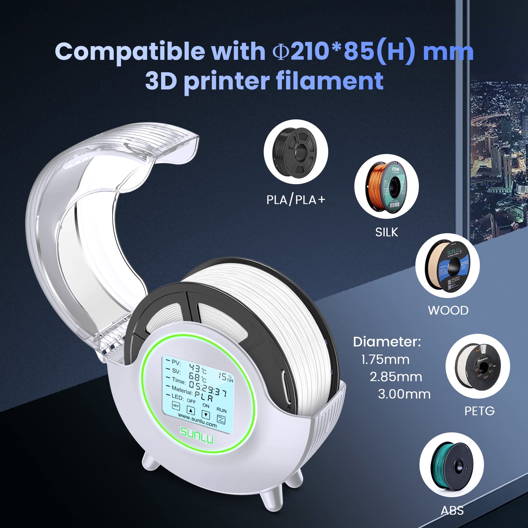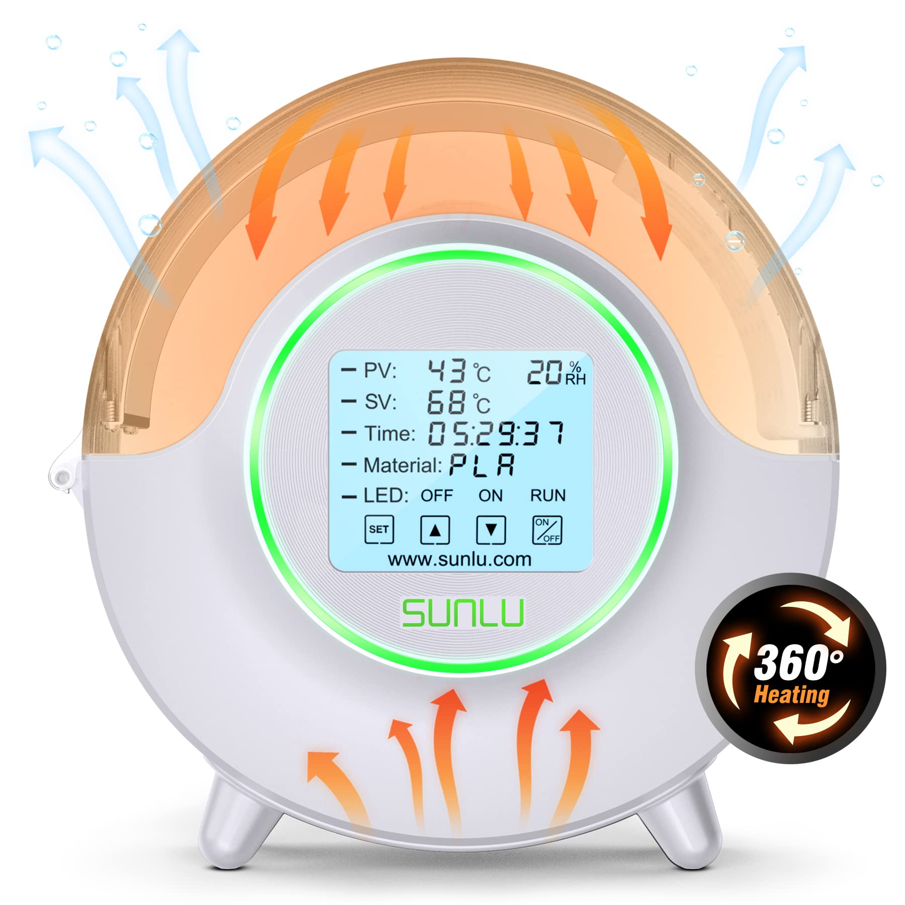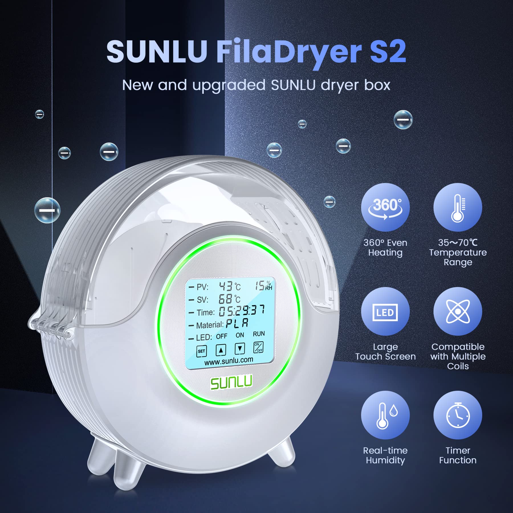 ["①【Newest SUNLU S2 Filament Dryer】The SUNLU S2 is equipped with a built-in fan for uniform heating and reducing moisture-related issues such as stringing and poor adhesion.","②【360° All-round Heating】With top and bottom heating plates, the SUNLU S2 3D filament dryer provides comprehensive, fast drying with an adjustable temperature range from 35°C to 70°C.","③【Large Touchscreen Display】The 3.42 * 2.87 inch large touchscreen allows for easy operation with one-button presets and switching between ℃ and ℉.","④【Real-time Moisture Monitoring】The integrated high-precision sensor displays the current moisture levels in the SUNLU S2 dryer box, allowing users to monitor the drying effectiveness.","⑤【User-friendly Operation】Our 3D filament dryer offers one-button recommended settings for different filaments, simplifying the drying process for effortless user experience.","⑥【Versatile Temperature Settings】The SUNLU S2 FilaDryer offers a temperature range of 35°C to 70°C for different filaments and drying needs.","⑦【User-friendly Design】SUNLU S2 dryer features a stable multi-arc design and non-slip feet. The elevated base can prevent heat transfer to the surface of other objects.","⑧【Improved Print Quality】The SUNLU S2 dryer ensures consistent print quality, preventing layer shifting, stringing, and poor adhesion for precise prints.","⑨【Increased Compatibility】SUNLU S2 3D printer filament dryer box is compatible with 1.75mm, 2.85mm, 3.00mm filaments and various types such as PLA, PETG, TPU, ABS, PA, and PC.","⑩【Sturdy and Reliable】SUNLU filament dryer box is built with high-quality materials for long-lasting durability and consistent drying performance over an extended period."]