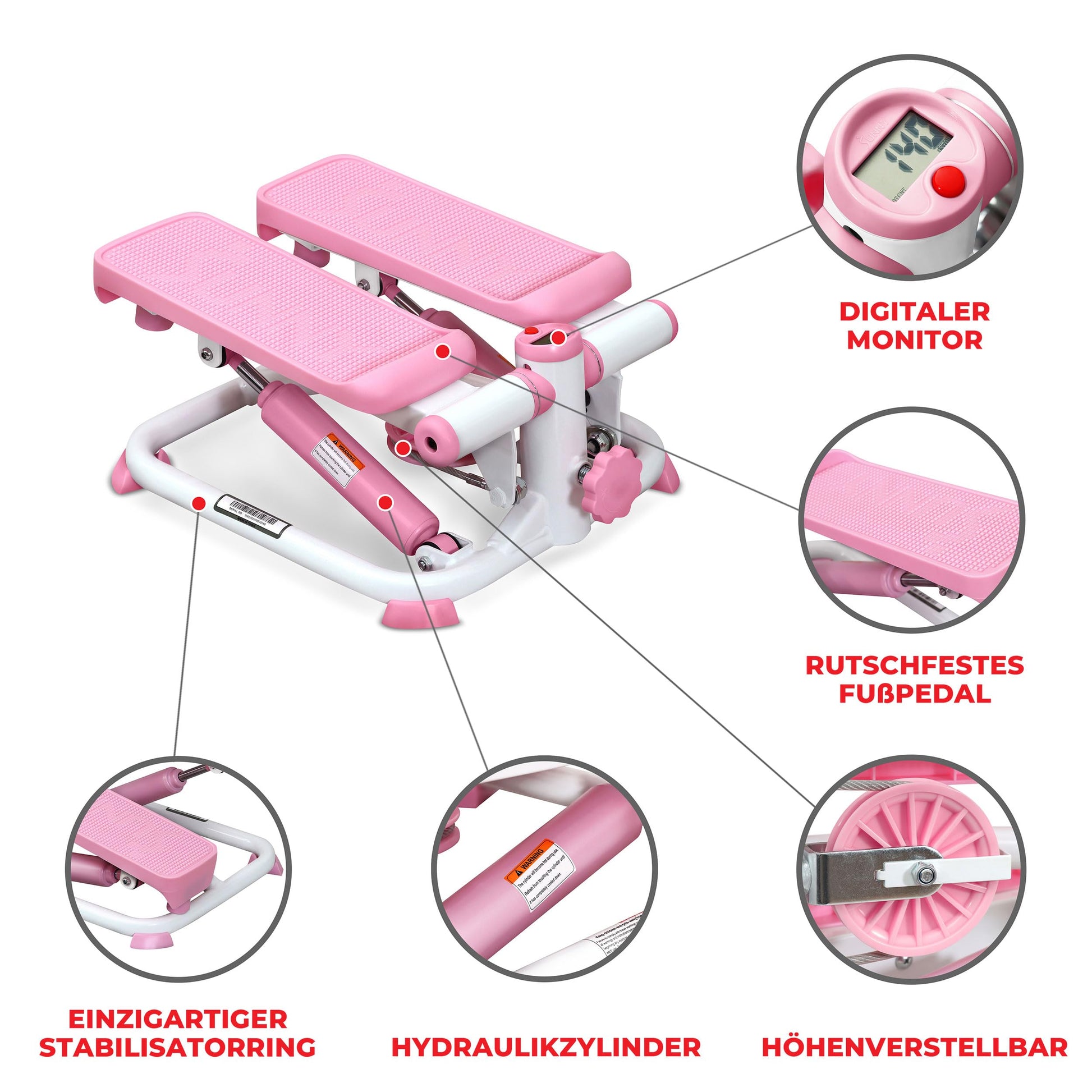 ["【ORIGINAL PINK STEPPER】The Sunny Mini Stepper for home workout now in a colorful Pink design. Achieve your cardio goals anytime, anywhere. With over 30,000 reviews and more than a million satisfied customers, it is a trusted choice.","【CORE & CARDIO TRAINING】 Strengthen your core, glutes, and legs with less impact and burn fat. Enjoy the high-resistance, intense training with Sunny's high-quality hydraulic system for a better cardio experience.","【TRACK YOUR TRAINING】Stay informed with the digital monitor tracking steps, time, and calories burned. Customize your training more effectively and adjust it to your goals.","【ADJUSTABLE HEIGHT INTENSITY】Use the height adjustment knob to easily switch between short, intense intervals and longer, even steps to adjust the intensity to your training needs.","【HIGH-QUALITY FRAME & REAL WEIGHT CAPACITY】Built with 2.5mm thick commercial steel, the Sunny Stepper offers exceptional stability and a certified weight capacity of 220 lbs. You are using a thoroughly tested, reliable training machine.","【QUIET AND SMOOTH】This stepper features an ultra-quiet hydraulic system. It delivers smooth steps without disturbing household members and is perfect for any time of day.","【ENHANCED STABILITY】The unique stabilizing ring at the base of the stepper ensures safe and stable stepping, providing additional security and a calming feeling during the workout.","【SPACE-SAVING & EASY STORAGE】This compact Sunny Stepper (42 x 33 x 35 cm) fits easily in small spaces and weighs only 7.2 kg, making it easy to move and store.","【100% PRE-ASSEMBLED】Straight out of the box and into training! The Sunny Stepper is ready to use immediately and can be easily stored after training due to its compact size.","【20+ YEARS OF EXCELLENCE】Sunny Health & Fitness, a US company, offers high-quality equipment and a commitment to excellence. Our dedicated US customer service team and certified trainers ensure an unparalleled FIT FOR EVERYONE experience."]