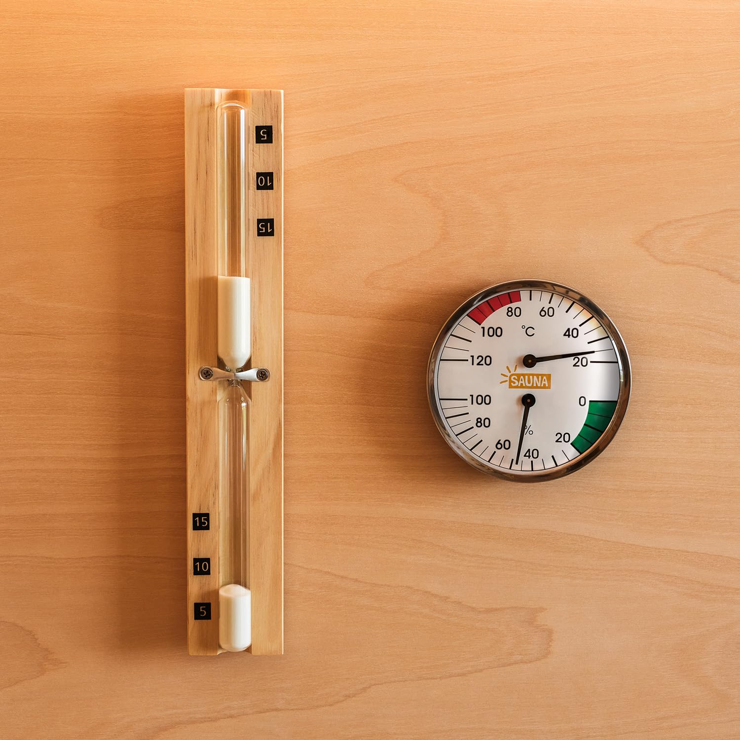 ["Infusion bucket: solid sauna bucket made of wood with plastic insert, Infusion bucket size: height: 4.6 inches, Ø 9.1 inches, approx. 4.1 liters","Infusion ladle: made of sturdy natural wood, with loop. Length: approx. 15.3 inches, Width: approx. 3.7 inches, Width of handle: approx. 0.7 inches, Depth of ladle: approx. 1.7 inches, Depth of handle: approx. 0.8 inches","Thermo- & Hygrometer: Climate gauge with Ø approx. 4.1 inches. With a scale of 0-248 °F temperature and 0-100% humidity","2x Sauna pillows made of light solid aspen wood, untreated, wave shape of support relieves shoulder and neck muscles","Sauna complete set for a successful sauna visit in the home sauna or as a gift set"]