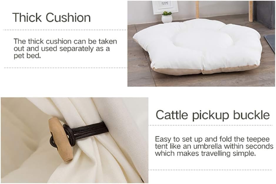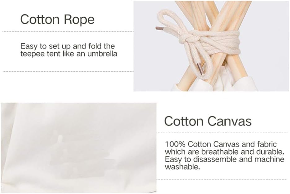 "Material: 100% cotton and breathable and durable fabric, easy to dismantle and machine washable. Configuration: 1xCotton tent + 10xPine pole + 1xPillow + 1xCotton rope + 5xPlastic tube + 1xBlackboard. Feature: The size of this teepee tent gives your furry animal a private atmosphere and provides endless fun. Occasion: Practical for anywhere, like living room, balcony, garden, etc. Ideal for sunbathing mat, nap and sleeping beds. Suitable for both indoors and outdoors. The thick cushion can be taken out and used separately as a soft pet bed. Thickly padded cotton mattress for a particularly soft and pleasant carrying feeling."