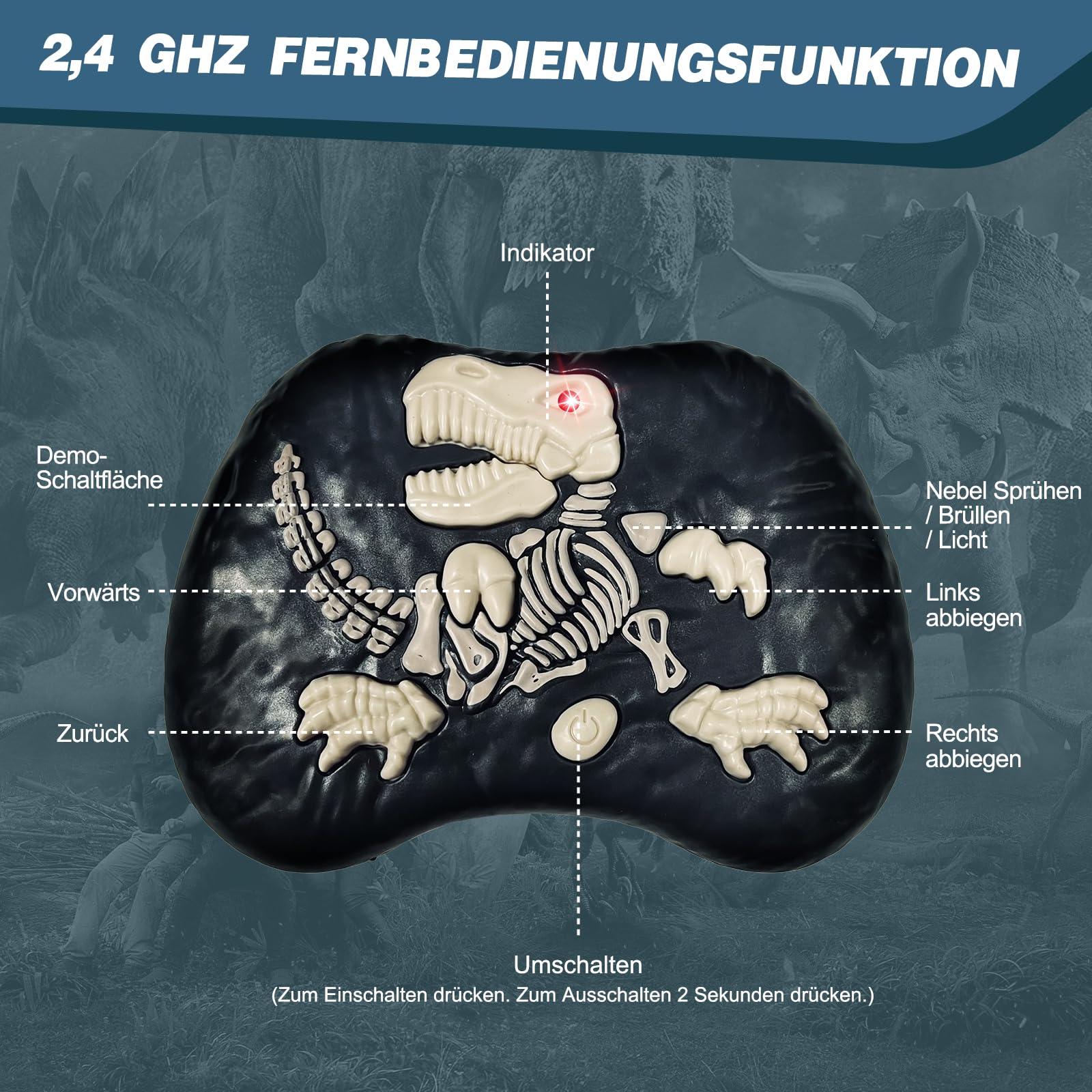 ["🦖【Multifunctional T-Rex Dinosaur Toy】 This new, improved RC dino can mimic the dinosaurs in the movie by walking, turning, growling, shaking its head, and wagging its tail, just like the real dinosaurs running before you. Specially enhanced spray, light, and roar functions as well as auto-demo functions allow for independent execution of various actions. Providing more fun and interactive play for kids."]