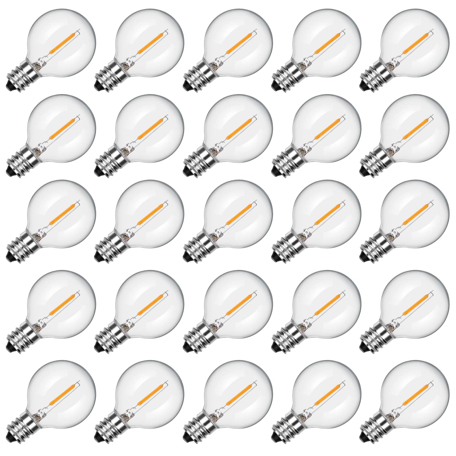 SUNSGNE G40 LED replacement bulbs 25 pack, Clear Globe Glass light bulbs, G40 patio lighting party garden wedding decoration, Fits E12/C7 base, 7 watts, Warm White.