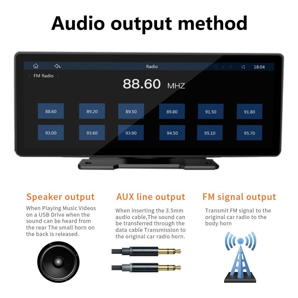 ["【Wireless CarPlay/Android Auto】: Connect your phone to your car stereo via Bluetooth and WLAN for wireless Carplay and Android Auto, allowing you to access music, navigation, messages, and other phone functions. It also supports voice control via Siri or Google Assistant without touching the screen.","【Bluetooth 5.0 / AUX / FM Transmitter】: The car audio receiver features Bluetooth 5.0 for clearer and more stable call and sound quality. The built-in microphone allows for hands-free calls and mobile music playback via Bluetooth. Supports FM transmitters and AUX cables. With built-in preset EQ and custom 16-band HD EQ with 12 adjustable frequency ranges, you can enjoy a variety of music styles and sound effects.","【9.3-Inch HD IPS Touchscreen】: Larger 9.3-inch anti-glare screen with 1024 x 600 resolution, supports two-way video split display. An upgrade of the HD Carplay screen, with higher sensitivity, a clearer and more colorful display that can capture the entire driving view, ensuring an excellent driving experience","【Suitable for all different types of vehicles】: Compared to the general 12V voltage setting for Bluetooth car radios, the operating voltage of this non-integrated car radio with navigation is 12-36V. It can be used in cars and trucks and is easy to operate without the need for disassembling the car. The screen car radio is suitable for most vehicles, such as cars, trucks, vans, buses, pickups, etc.","【Support for rearview camera】: The screen can support the rearview camera. After installing the rearview camera, you can start using it."]