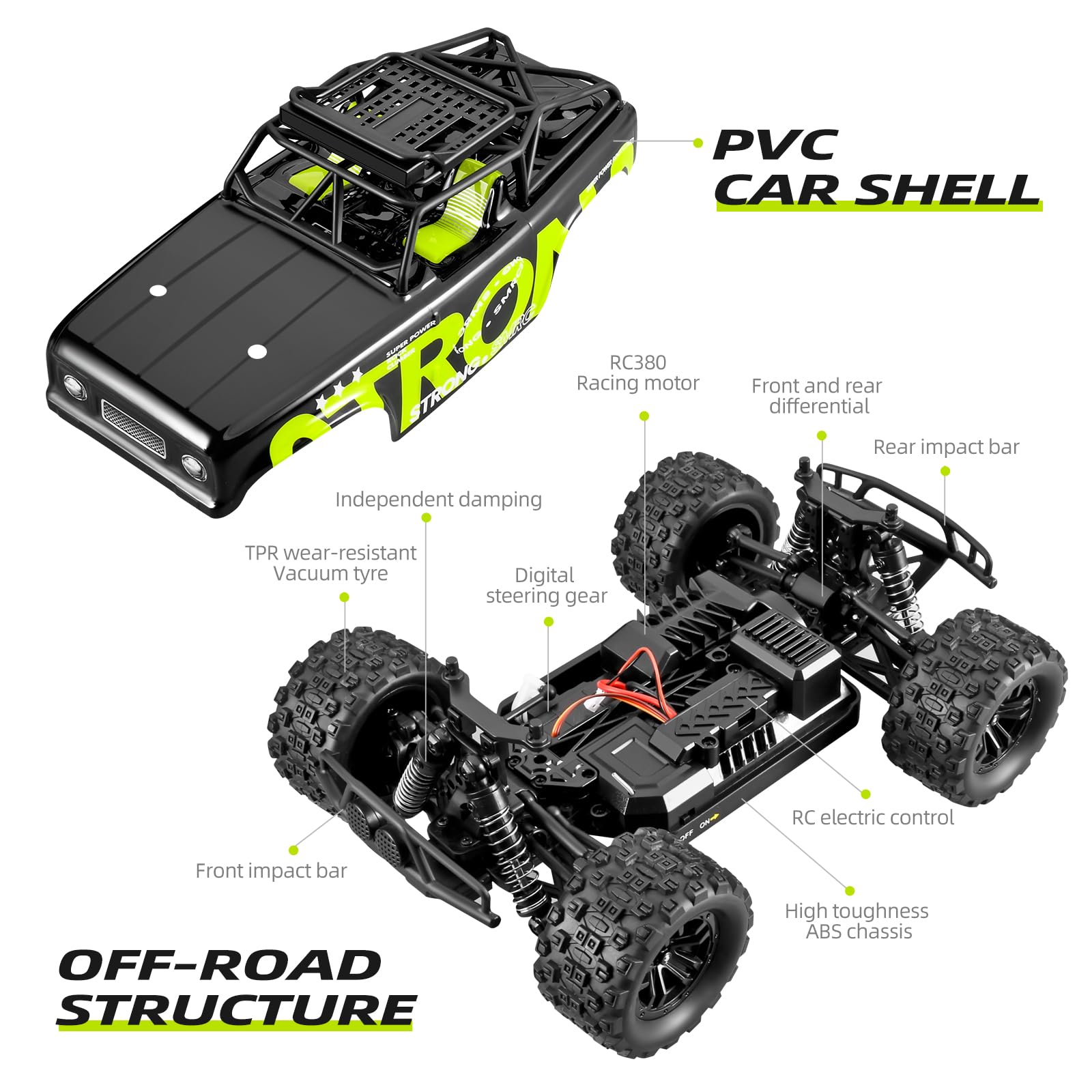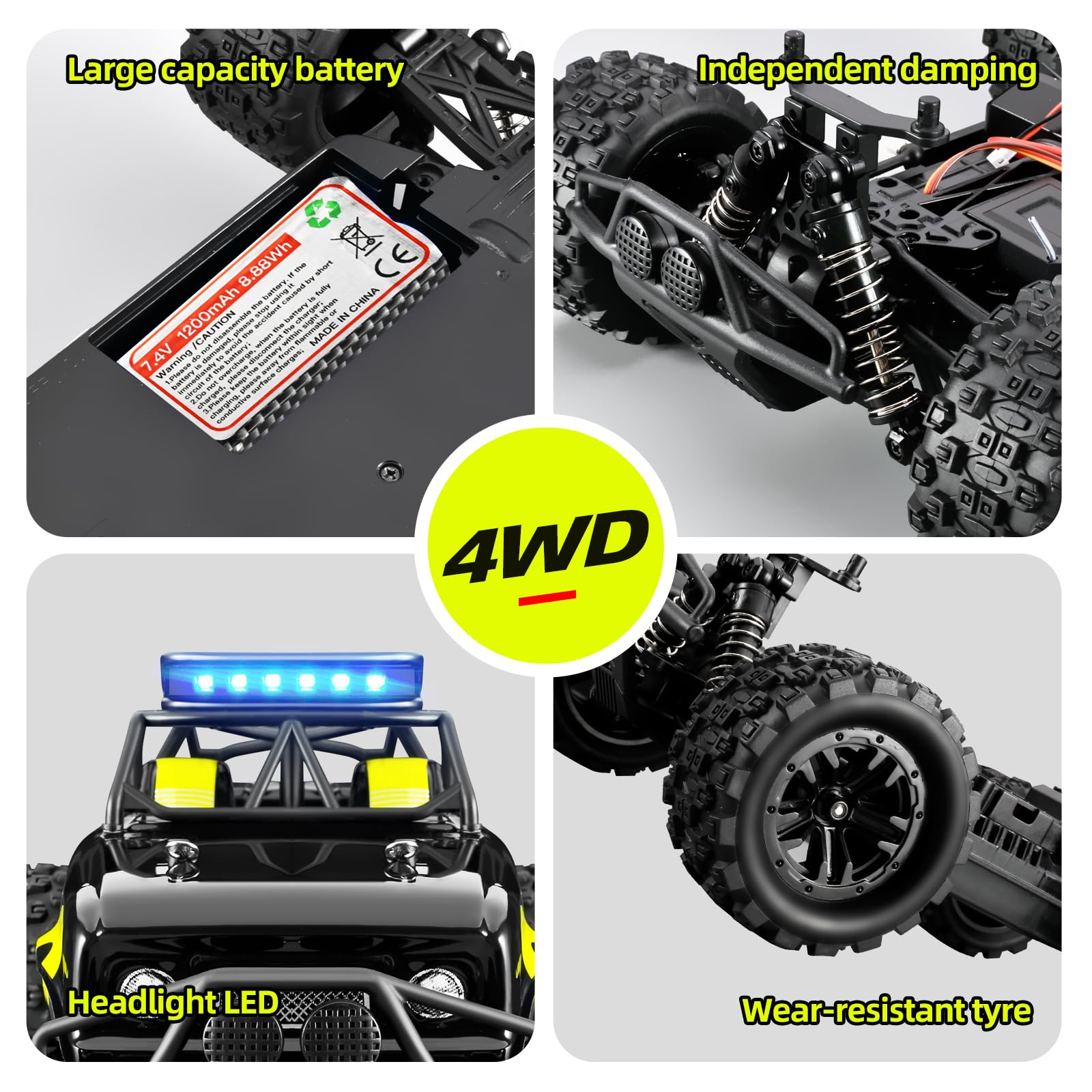 ["Powerful Motor: Equipped with a 380 motor that generates strong power, the remote-controlled truck with four-wheel drive can quickly accelerate and reach a high speed of up to 40 km/h.","Cross All Terrains: 4-wheel drive, independent suspension, front and rear double differentials, complete transmission package, and reinforced chassis provide support for unexpected potholes and uneven terrain. This 1:18 scale buggy excels in off-road performance and various terrains (mud, sand, grass, etc.).","60 Minutes of Fun: Packed with 2 pieces of 7.4V 1200mAh batteries, the continuous playtime is around 30 + 30 minutes. Enjoy double non-stop racing fun.","Multiplayer Game: The built-in 2.4GHz radio technology allows multiple RC cars to race simultaneously without interference, with a maximum control range of up to 80m.","Easy Control: Fully proportional throttle and steering controls ensure smooth speed and direction changes, allowing the vehicle to easily navigate various winding and complex tracks.","Sufficient Accessories: All accessories for this remote-controlled car are available in our shop, so you can play with the car worry-free. Please visit our shop link www.amazon.de/supkonxi"]