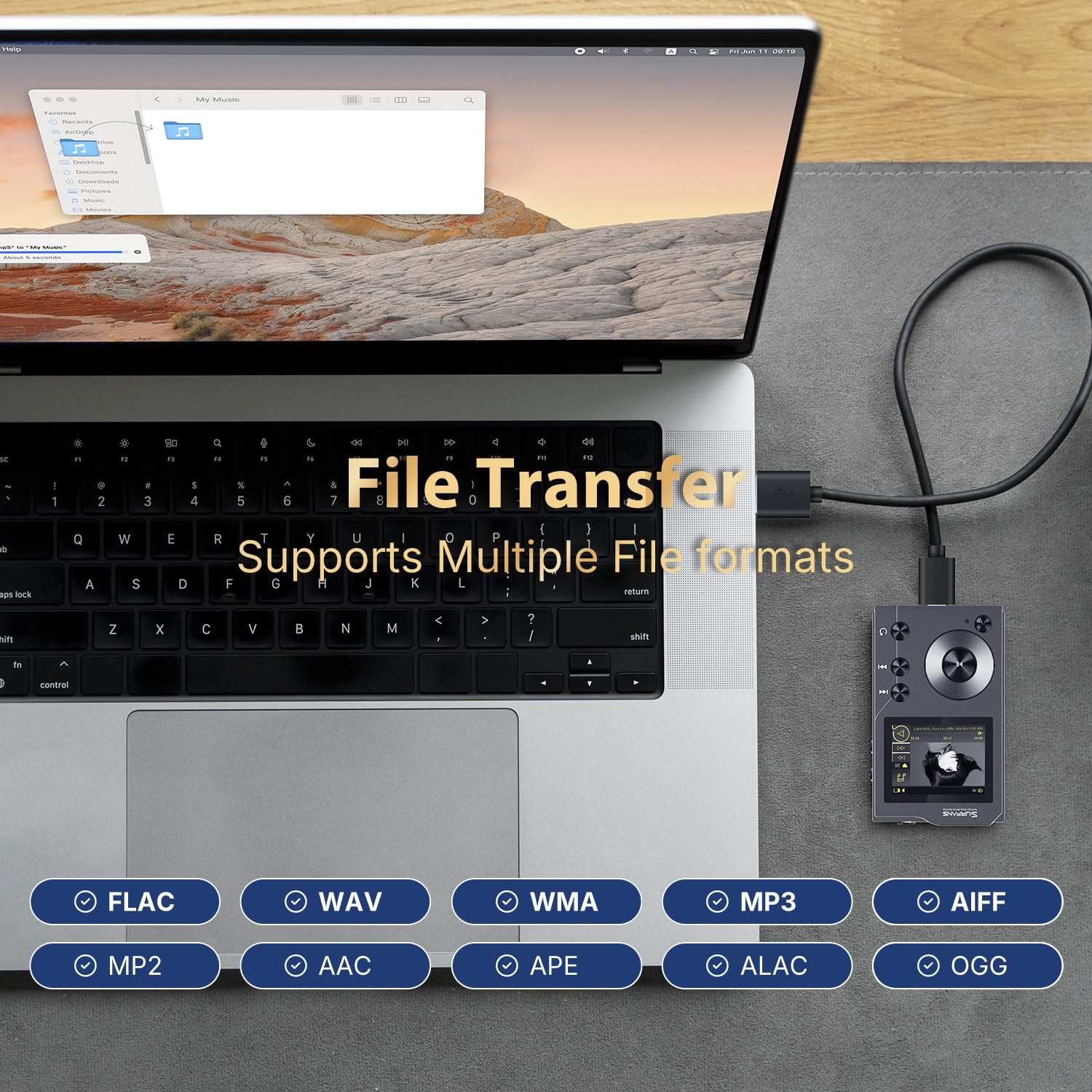 ["High-resolution Music Player: This Bluetooth MP3 player features excellent audio quality and advanced DSD decoding technology to reduce distortion. The high-resolution audio player can capture the depth and breadth of every note. Ideal for audiophiles to enjoy live music","Lossless Audio: Lossless music player uses advanced PCM510xA 2.1 VRMS, 112/106/100 dB audio stereo DAC chip with a maximum sampling rate of 44.1 ° C384 kHz / 32 bit. Supports all common lossless music formats: FLAC, WAV, WMA, M4A, MP3, MP2, AAC, APE, ALAC, OGG, AIFF, DFF, native DSD64 (2.8 MHz) DSD 128 (5.6 MHz), etc","Humanization Design: This digital music player features a 2.0-inch HD screen. The distinctive ALPS scroll wheel allows for smooth operation. A high-quality zinc alloy chassis provides a comfortable and durable feel, not to mention robust protection for a longer lifespan","Bidirectional Bluetooth 5.2: This high-resolution audio player features Bluetooth 5.2 for communication that will change your life. Lossless wireless Bluetooth transmission in two directions with the APT-X protocol. The music player can send to Bluetooth-enabled devices such as headphones, speakers, etc. and can also be a Bluetooth receiver","Excellent Battery. Expandable Memory: Enjoy up to 10 hours of uninterrupted high-resolution audio via headphones or Bluetooth. We have included a 64GB SD card, but you can expand storage up to 256GB via SD card or USB OTG (not included) to enjoy music with a length of up to 14,000 songs."]