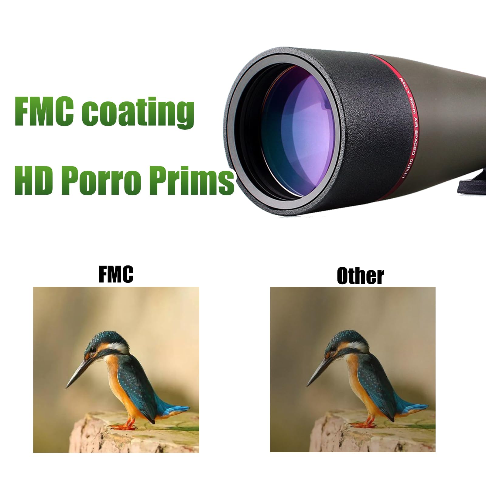 ["Powerful spotting scope; Variable 20-60x zoom magnification and 80mm objective; makes it easy to focus on near and far targets; Perfect for target shooting; Hunting; Bird watching; Hiking; Moon","Optical HD elements; All lenses and prisms are fully multi-coated to ensure excellent light transmission; Silver coated prism ensures brightness and color reproducibility","IPX7 waterproof and fog-proof; O-ring seals prevent moisture from entering the scope providing reliable performance; Filled with gas for additional waterproof performance","Portable tripod; Lightweight aluminum alloy tripod is easy to carry for outdoor use; Adjustable height from 40 to 138 cm meets your observation needs; 1/4-20 interface is also compatible with other tripods","Ergonomic design; Angled eyepiece provides comfortable viewing for long-term use; Twist-up eyecup is friendly for eyeglass wearers; Rotatable tripod ring for optimal viewing angle"]