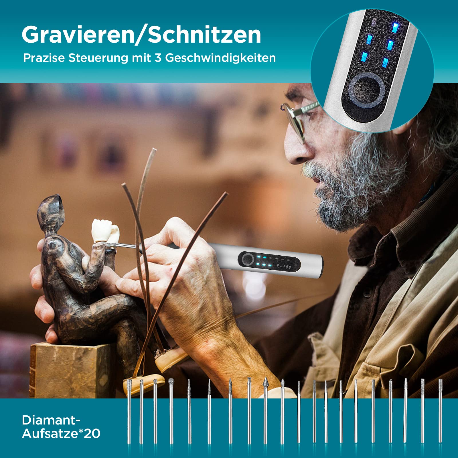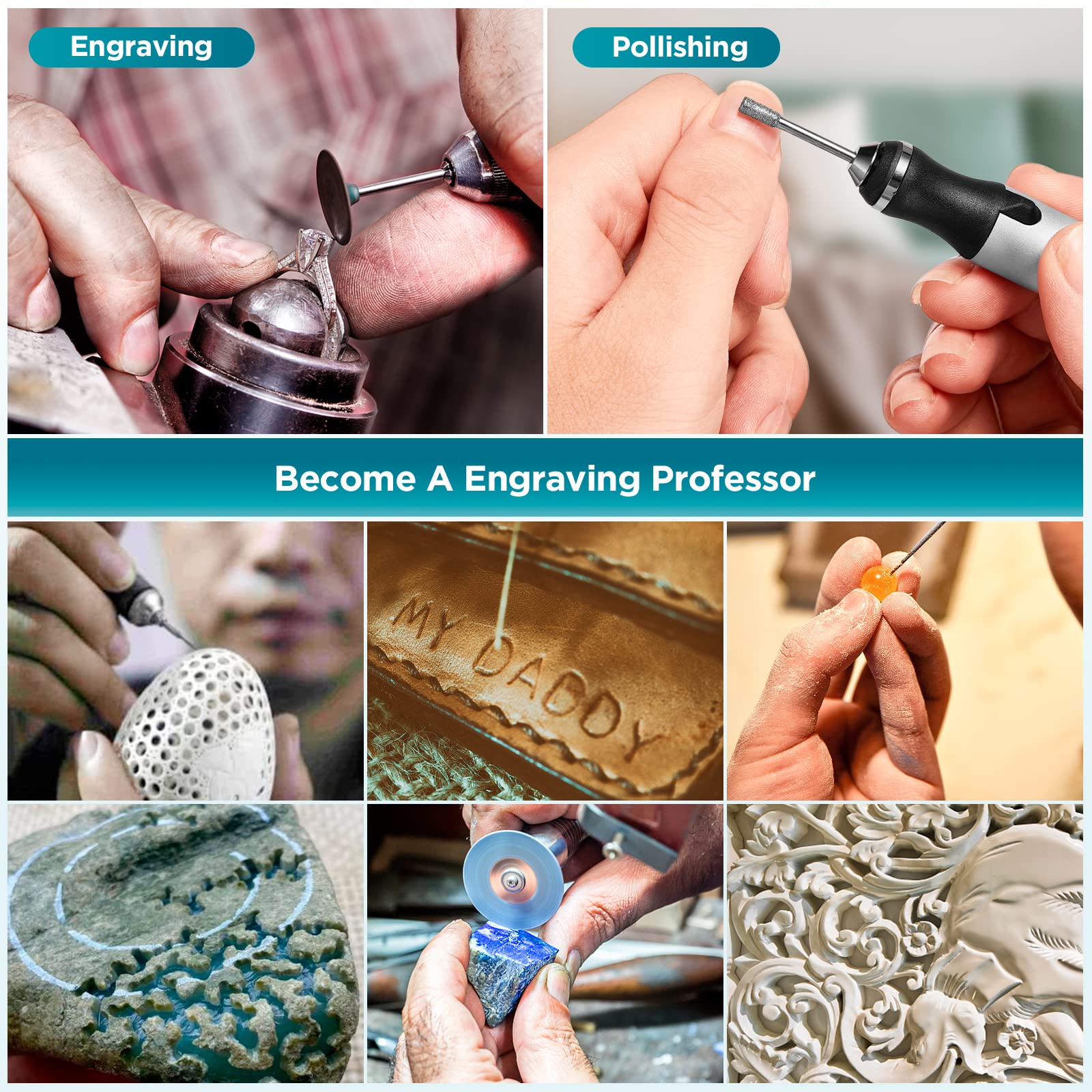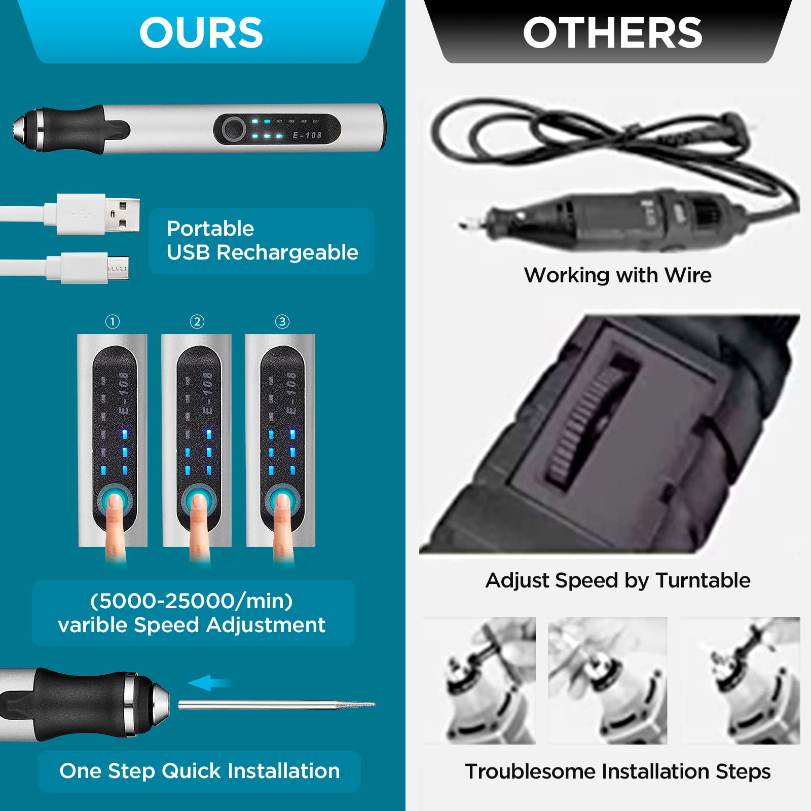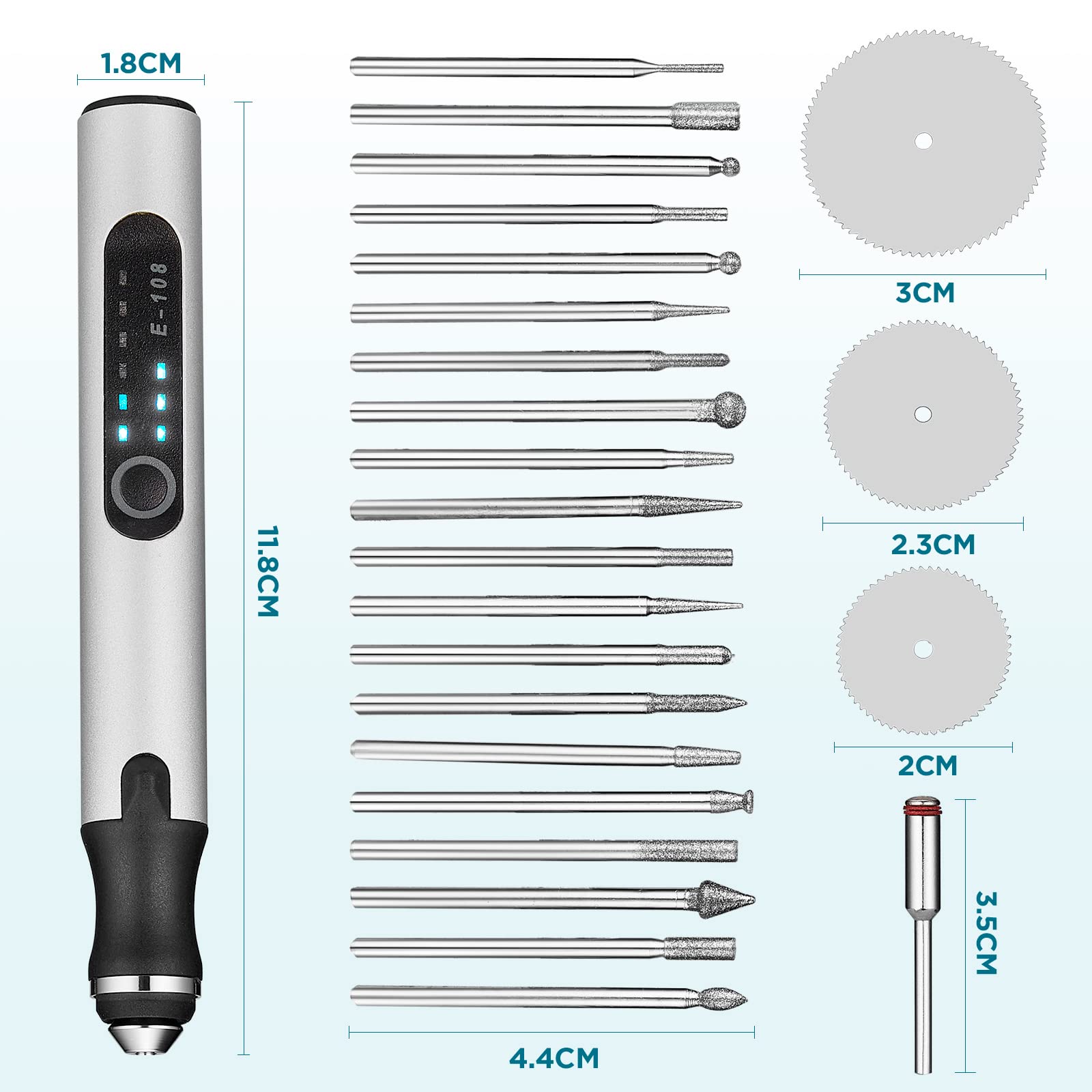 ["Wireless Engraving Pen with USB Charging: This wireless engraving pen is rechargeable and equipped with a strong battery that provides enough energy for continuous operation for up to 1 hour after full charge. Our engraving pen comes with a Type-C charging cable that ensures fast charging speed. The wireless design makes your engraving work more flexible and much easier."]