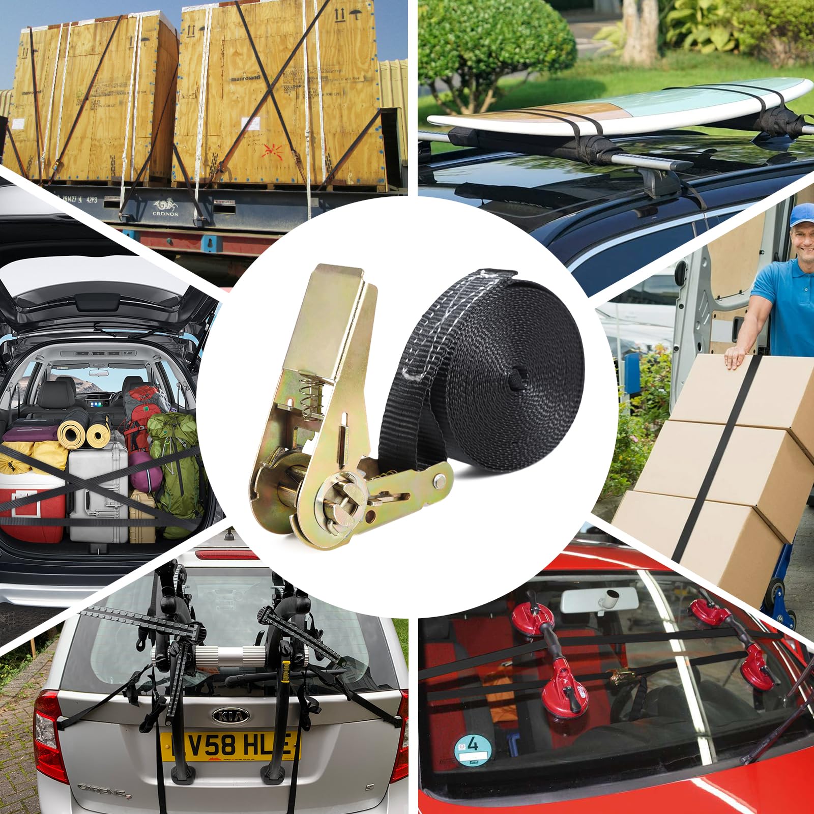 "Robust and durable: The ratchet straps are made of high-quality polyester fiber and are equipped with stainless steel and stable metal buckles. They have a capacity of up to 2200 lbs and have excellent wear, deformation, and aging resistance. It can withstand long-term use and repeated stretching, ensuring long-term and stable handling effects. Strap width 1 inch: The lengths of the ratchet straps are 6.6ft*2, 13.1ft*2, and 16.4ft*2, and the 0.1 inch width of the fine seams and the wave-like texture of the straps provide more friction and ensure sufficient strength and stability. Whether for bikes, motorcycles, luggage, or camping gear, ratchet straps are ideal for almost any application. Practical set: This set consists of 6 ratchet straps of different lengths to meet the requirements of goods of different sizes, and it is flexible and suitable for various handling scenarios, whether for small items or large goods. This ratchet strap complete set can meet all your needs. A must-have for transportation and cargo securing. Easy to use: Tightening and loosening the straps with the ratchet is quick and easy thanks to the intuitive ratchet mechanism. Ratchet straps must be hooked at the left and right ends, pull the strap through the metal ratchet, then tighten with the lever. The adjustable length is flexible and secures your load reliably without slipping. You can quickly adjust the length and fixation of the goods, saving time and labor costs. Black ratchet straps: Whether it's sunny, rainy, or snowy, the ratchet strap can maintain excellent performance and is not affected by the weather, ensuring that the load is safe and stable, which also ensures longer durability and reliability. It is made of environmentally friendly materials, so you can buy and use with confidence."
