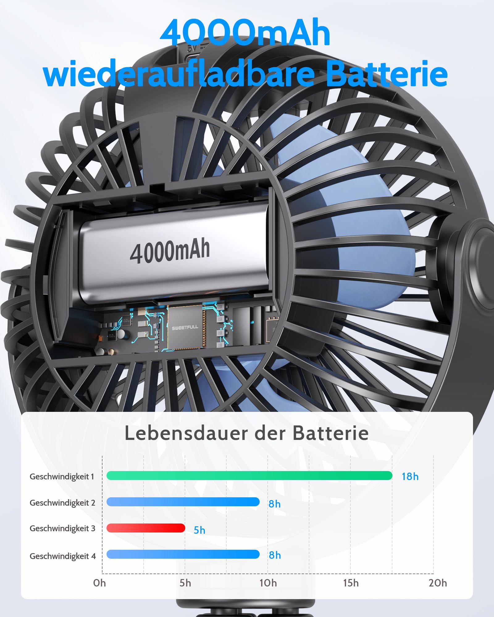 ["New Improvements: a. LED display for power and wind speed; b. Removable fan cover for cleaning; c. 360° freedom of positioning horizontally/vertically; d. Food-grade silicone used.","4000mAh integrated rechargeable battery: portable fan, Size: 34*14*6 cm, Weight: 0.36 kg. Charging time 3.5 hours; after full charge: 4-20 hours of operation (depending on wind speed).","Practical and durable: Fixing screw between fan head and tripod prevents detachment. The fan head and tripod are detachable, so only the fan head needs to be removed during charging.","Easy to carry: The quiet fan is suitable for various situations such as zoo, park, birth, sleep, table, stroller, camping, car seat, crib, and travel.","High-quality service: Thank you for choosing SWEETFULL. If you have any questions during use, please contact us. Our customer service team is available 24/7."]