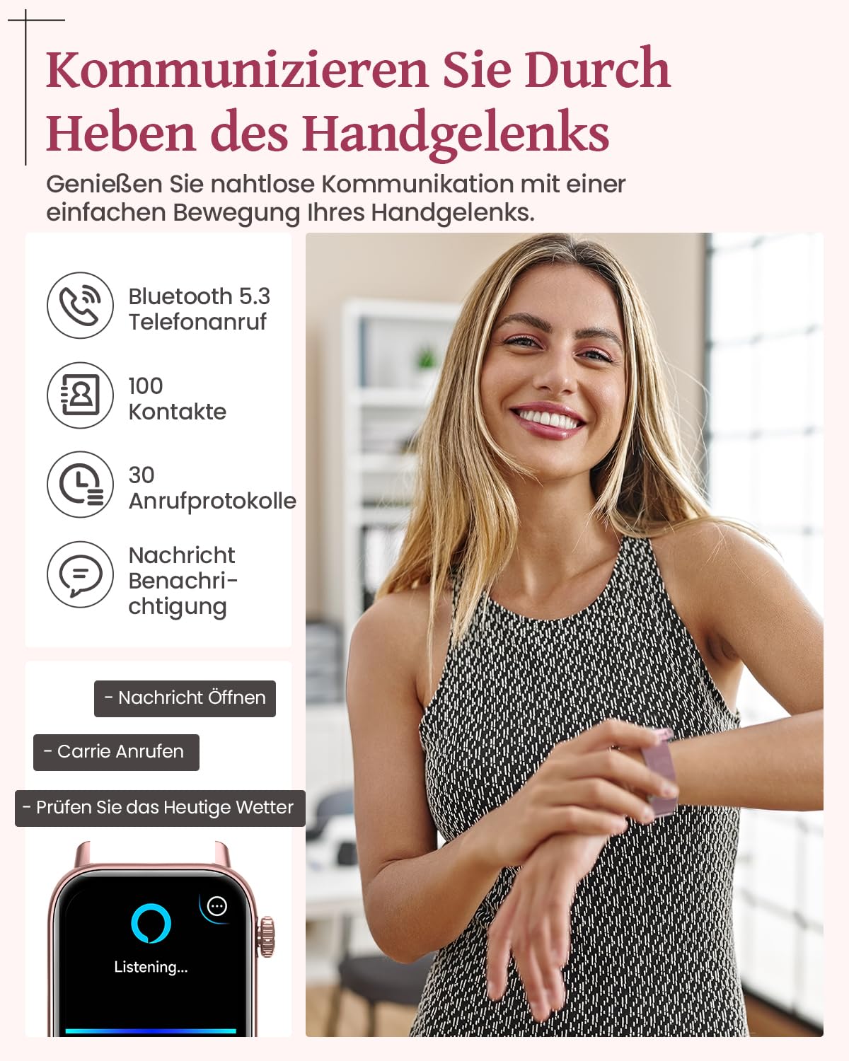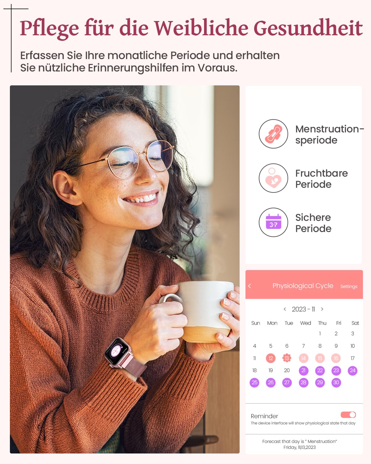 ["đăFashionable and ElegantăSWGOTA Fashion Smartwatch for women features a high-resolution 1.83-inch touchscreen with 240 x 280 pixels and an anti-fingerprint coating, providing a clearer viewing experience and protecting your eyes. With 3 interchangeable straps, including 1 Milanese band and 2 silicone bands, the comfortable, stylish, and durable design is suitable for all-day wear and easily adapts to different occasions and styles.","đ©ăFemale AssistantăSmartwatch for women can monitor the menstrual cycle, ovulation, etc., helping women better understand and track their menstrual cycle. The smartwatch can also send personalized reminders for upcoming menstrual periods and ovulation days, allowing women to plan their activities and life and better manage their health.","đăCalls & NotificationsăSmartwatch for women with phone function can make and receive calls via Bluetooth, as well as receive notifications from SMS, Facebook, WhatsApp, Instagram, Twitter, and others. Equipped with a low-power consumption chip and a built-in 300mAh battery, the smartwatch can be used normally for 5-7 days and has a standby time of 30 days. Whether you are working or exercising, you won't miss anything important.","đăHealth MonitorăThis smartwatch is equipped with the LC11S heart rate sensor, allowing for 24-hour heart rate monitoring. It alerts you when your heart rate is too high or too low. Additionally, the smartwatch for women measures blood oxygen, blood pressure, and monitors your sleep to understand your sleep status. The smartwatch always cares about your health and allows you to enjoy life without worries.","đăFor Sports EnthusiastsăFitness watch for women offers over 110 sports modes, including yoga, pilates, dancing, jump rope, skiing, and other sports. You can view calories burned, mileage, step count, and other data directly on the smartwatch, as well as view 7-day training data and professional analysis recommendations on the GloryFit app. Additionally, this sports smartwatch for women has an IP68 rating, making it water-, sweat-, and dustproof."]