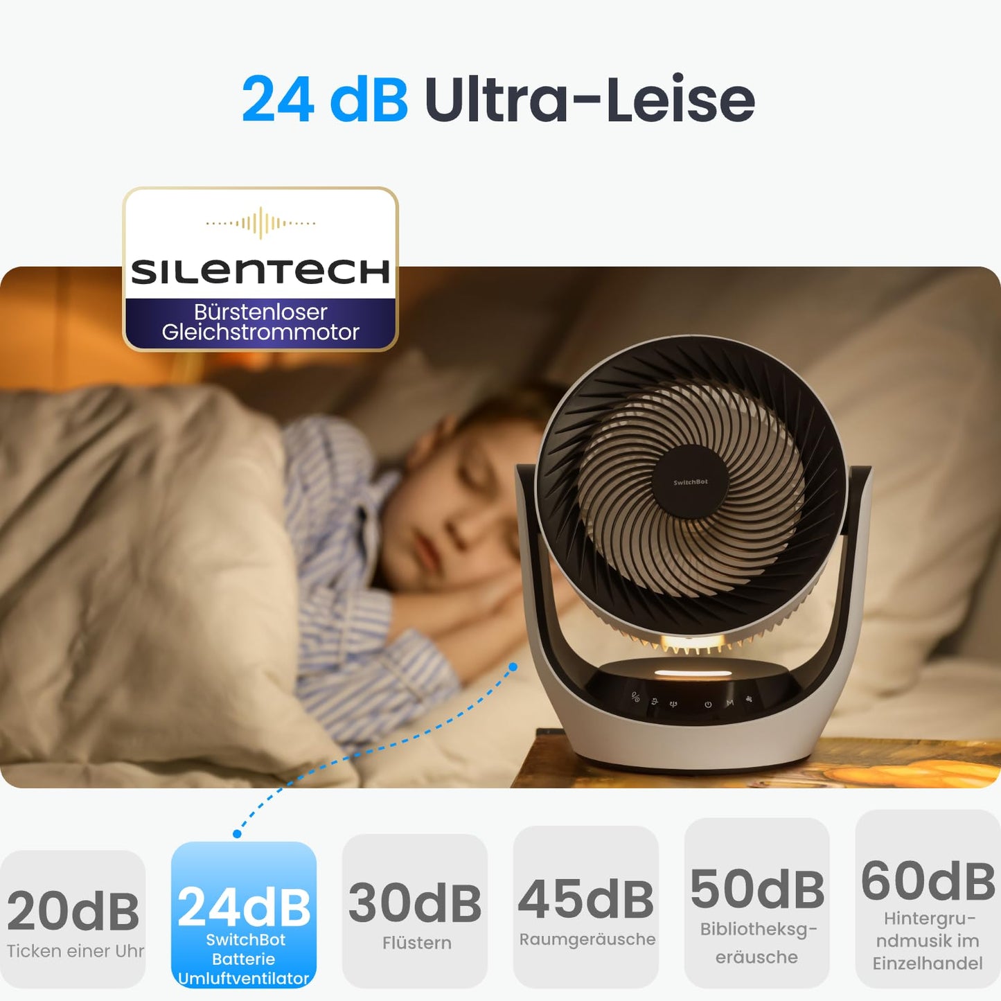 ["3D Air Circulation Cover: Adjust the fan's position horizontally and vertically up to 90° via the SwitchBot app to find your perfect angle. With large 11-inch blades for stronger airflow, it quickly circulates cold or warm air and helps lower energy costs when used with air conditioners or heaters.","Rechargeable Design: The SwitchBot Battery-Powered Air Circulator Fan supports both AC power and charging via USB Type-C. Its 3600mAh battery can power the fan for hours after a full charge.","Portable Design: Perfect for various environments like bathrooms, balconies, and even outdoor camping sites. Free yourself from power limitations and enjoy a natural breeze anywhere.","24 dB Quiet Cooling: Powered by SilenTech technology and a brushless DC motor, our smart table fan operates at only 24 dB. Enjoy peaceful, undisturbed work times or restful sleep at night.","Multiple Control Methods: Easily control the SwitchBot Battery-Powered Air Circulator Fan through touchscreen buttons, the included remote control, or SwitchBot Remote. You can also adjust settings via the SwitchBot app or manually change the oscillation direction. Pair it with the SwitchBot Hub to unlock voice control through Alexa, Google Assistant, and more."]