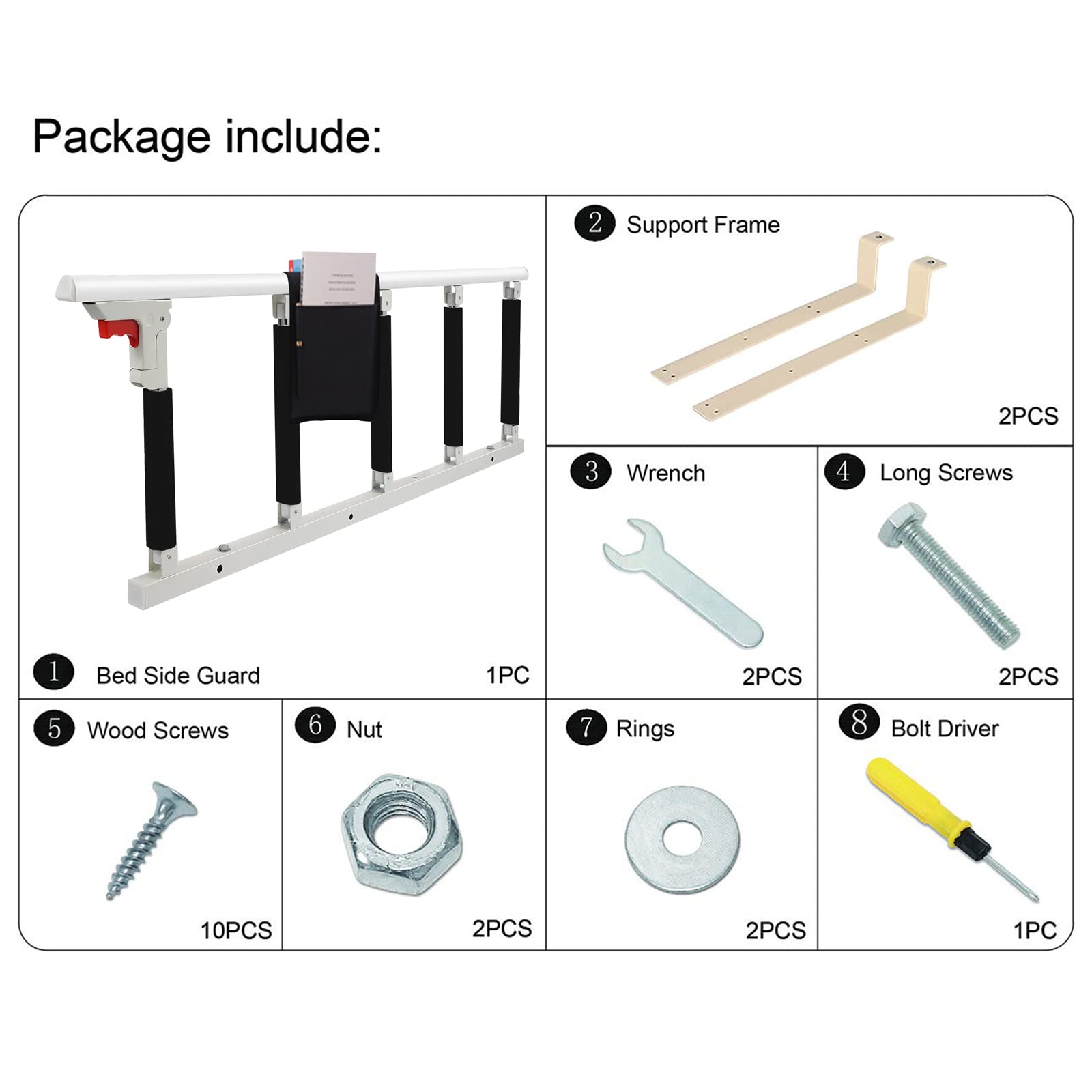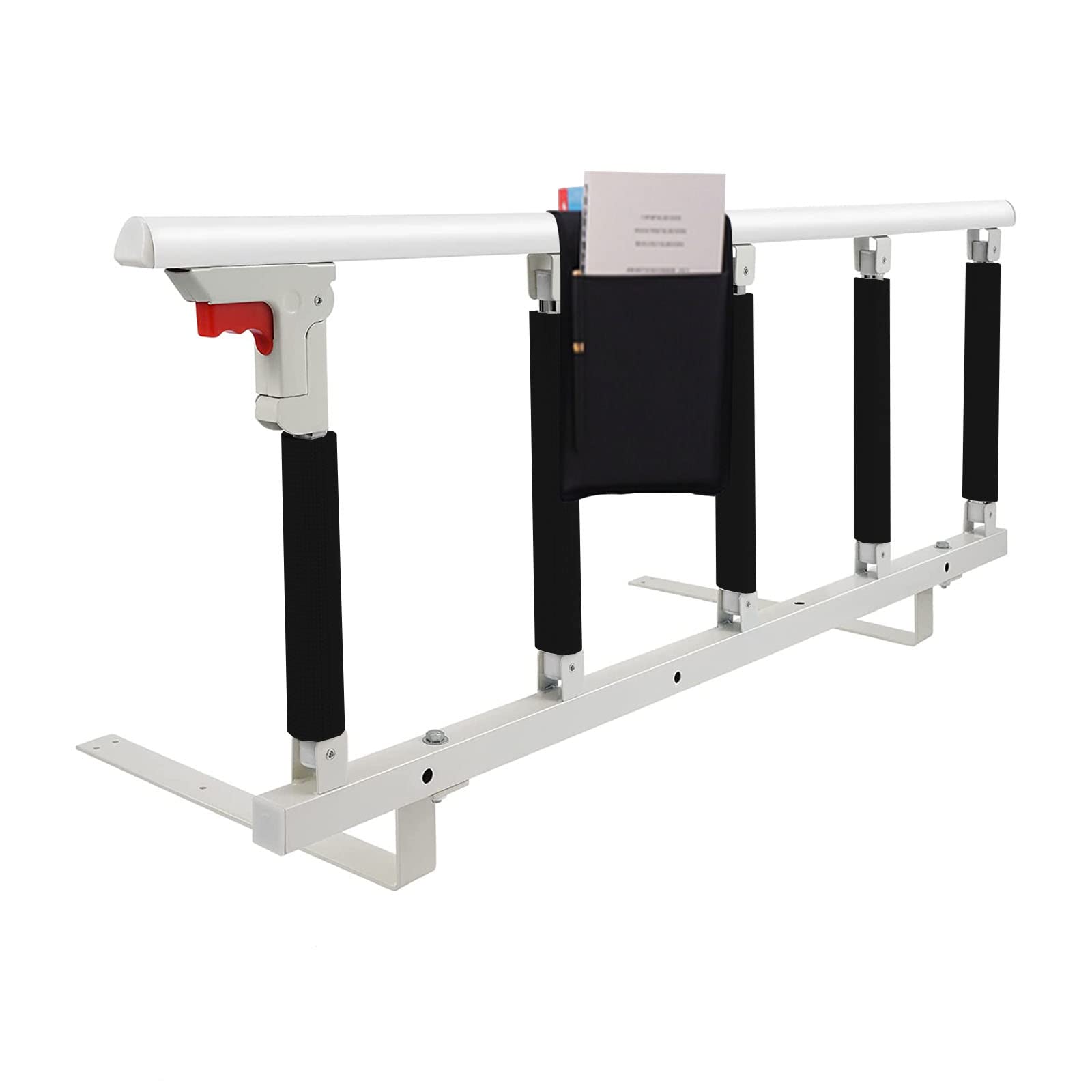 ["Comfort: Aluminum crossbars, stainless steel posts, thickened base, very stable, with a storage bag on one side of the railing for easy access to magazines or cell phones, the posts are covered with black foam, non-slip and shockproof, greatly improving comfort and convenience.","Foldable: the folded railing is lower than the surface of the bed and does not affect getting in and out of bed, ideal for elderly people and pregnant women, it can be used as a handrail to assist and prevent falling out of bed.","Easy assembly: L-shaped (8cm) simple mounting part, no drilling required, simply screw in self-tapping screws with a screwdriver. Of course, this product can also be installed by drilling holes, so you can choose between the two installation methods.","Versatile: Our bed rails are suitable for most beds on the market, whether it's a double bed, a bunk bed, a low or high bed, or a professional care bed, all can be equipped with this railing, suitable for home bedroom accessories, nursing homes, and hospitals.","Note: Please read the product manual before installation. Please pay attention to safety when using the handrail, it is only suitable for adults"]