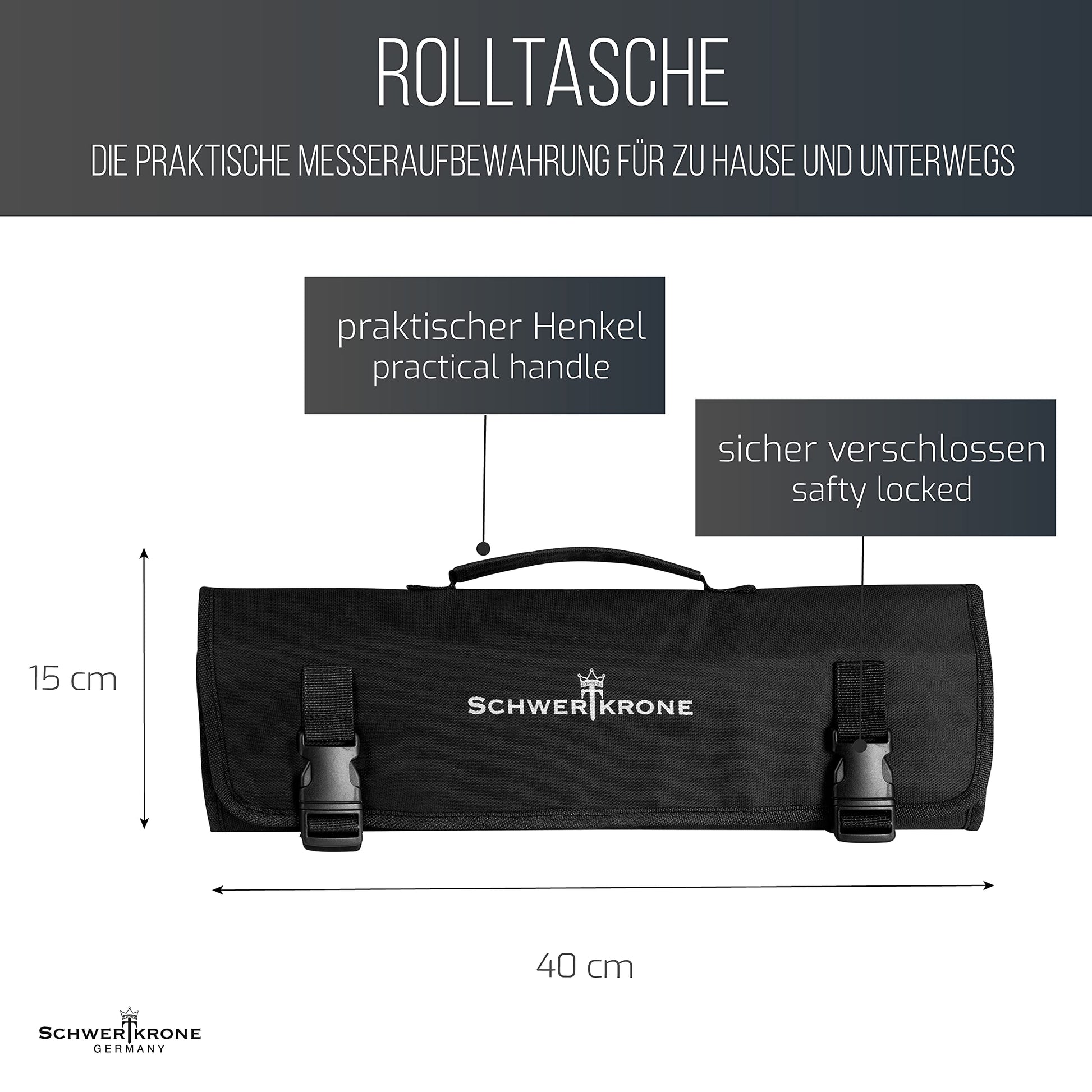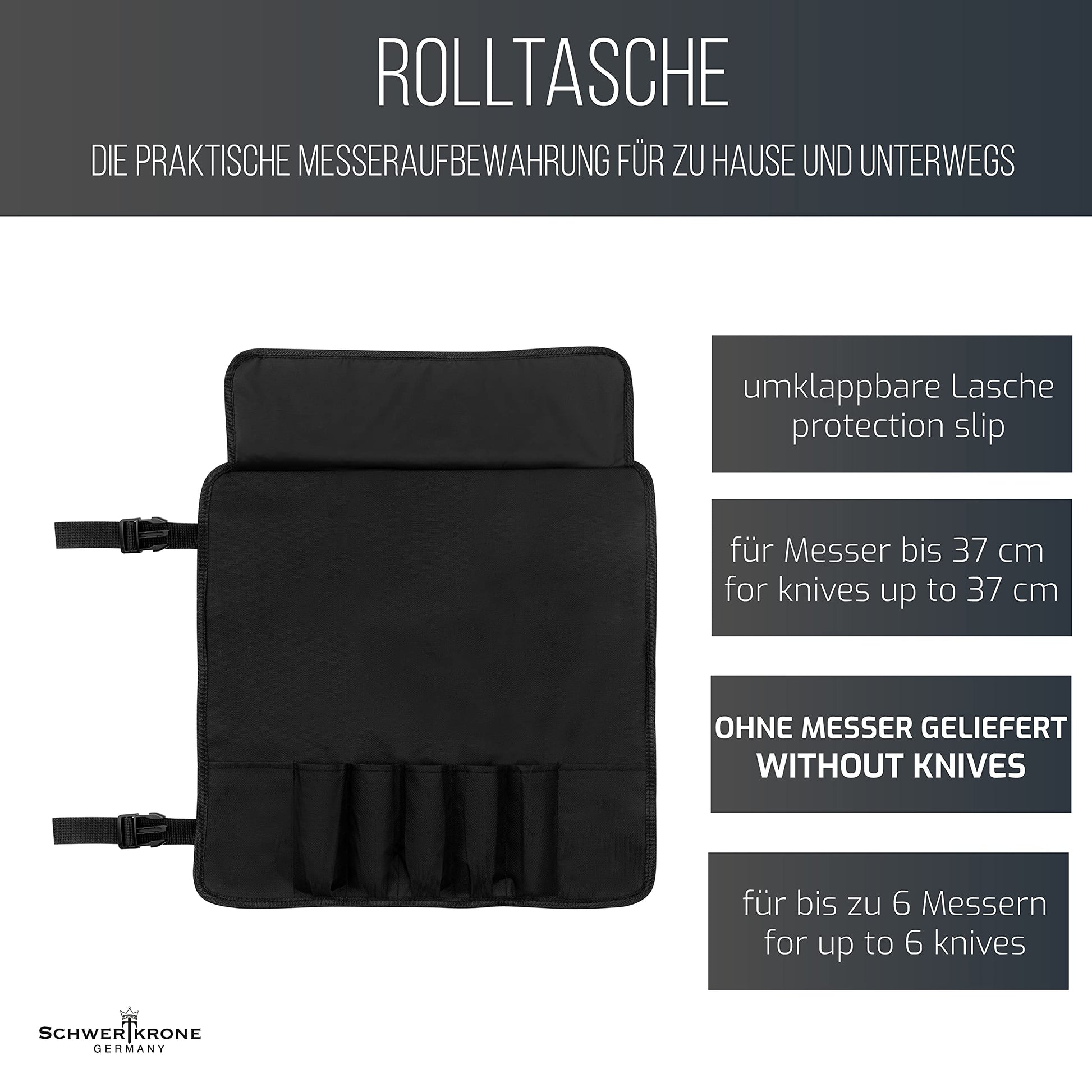 ["Practical: Knife bag / roll bag for kitchen knives, chef knife bag, kitchen tool bag made of sturdy textured fabric", "Spacious: with 6 slots, you can store and transport a lot of knives safely", "Always with you: the sturdy knife storage can be easily rolled up and securely closed thanks to the practical fasteners - easy transport with the handle", "The bag is delivered without knives!", "Quality from Schwertkrone - Products for a lifetime"]
