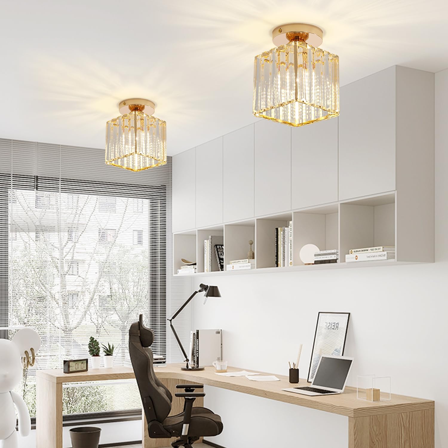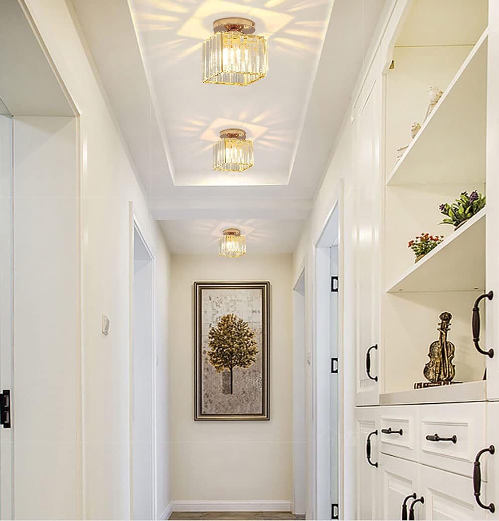 Sxtiger Modern Crystal Ceiling Light, Mini Golden Crystal Ceiling Lamp E27 Square Lampshade Crystal Chandelier, For Hallway Entrance Kitchen Bedroom Living Room Light (Gold)