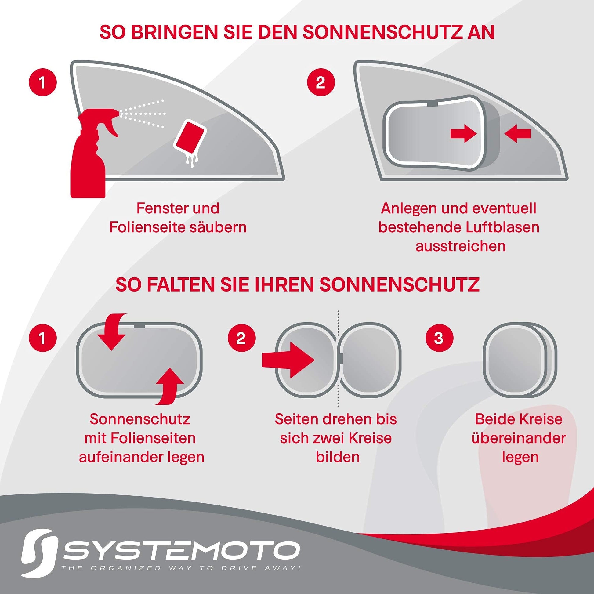 NO MORE SUCTION CUPS - Our sunshades are self-adhesive and do not require suction cups & Co. for installation. The universal size 48 x 32.5 cm fits perfectly on most car windows.