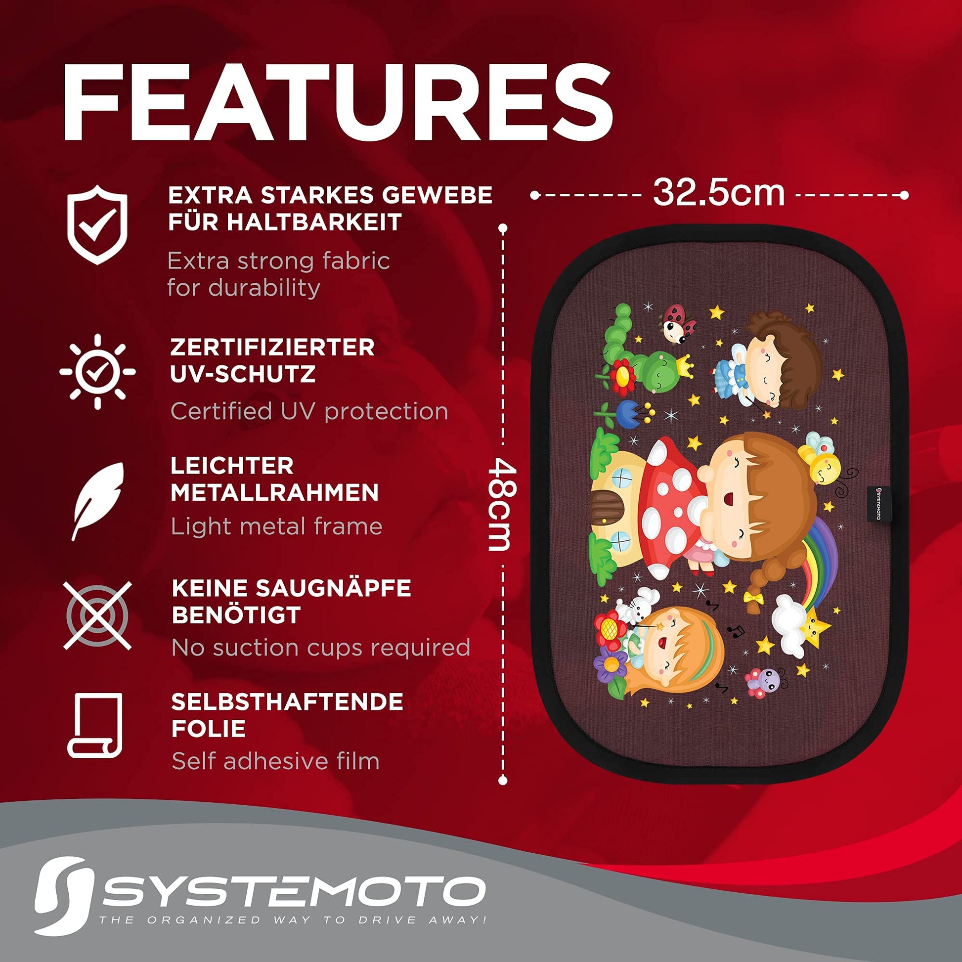 Systemoto Baby Car Sun Shades with Certified UV Protection (2 Pack) - Self-Adhesive Sunshades for Children with cute Animal Designs (Fairy Tales)