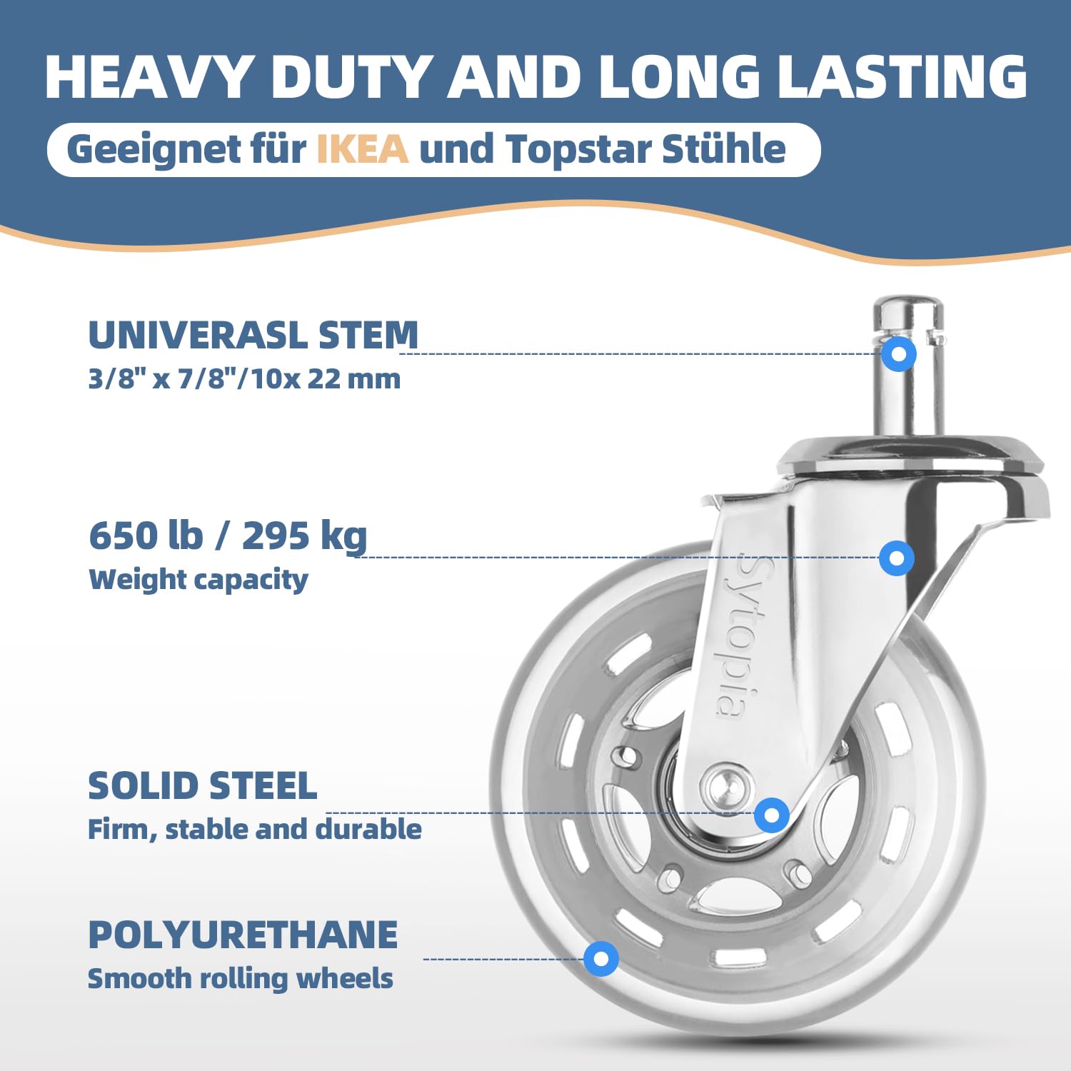 ["👍Office Chair Casters 10mm - The 10 mm x 22 mm size of the office chair casters is compatible with almost all 1KEA chairs. (Please check the size of your wheel stems before ordering). Rubber wheels for 1kea office chair, 90 mm height.","👍Protects hardwood floors - Rubber wheels are specially designed for wood, parquet, laminate, or tile floors. Its soft rubber surface protects the floor and leaves no scratches or damage.","👍Quiet and smooth gliding - The design of the wheels on the Sytopia office chair allows for quiet and smooth gliding, without disturbing the work environment. They enable relaxed and comfortable movement in your office chair.","👍Load capacity up to 700 lbs - The durable office chair casters have a standard diameter of 75 mm, providing more stability and better rolling performance. Its load capacity is over 700 kg, an ideal option for replacing old wheels.","👍Easy installation - Replacing the Sytopia wheels is quick and easy. Simply remove the old wheels and insert the metal pin of the Sytopia wheels to immediately experience noiseless gliding and 360° rotation of your office chair."]