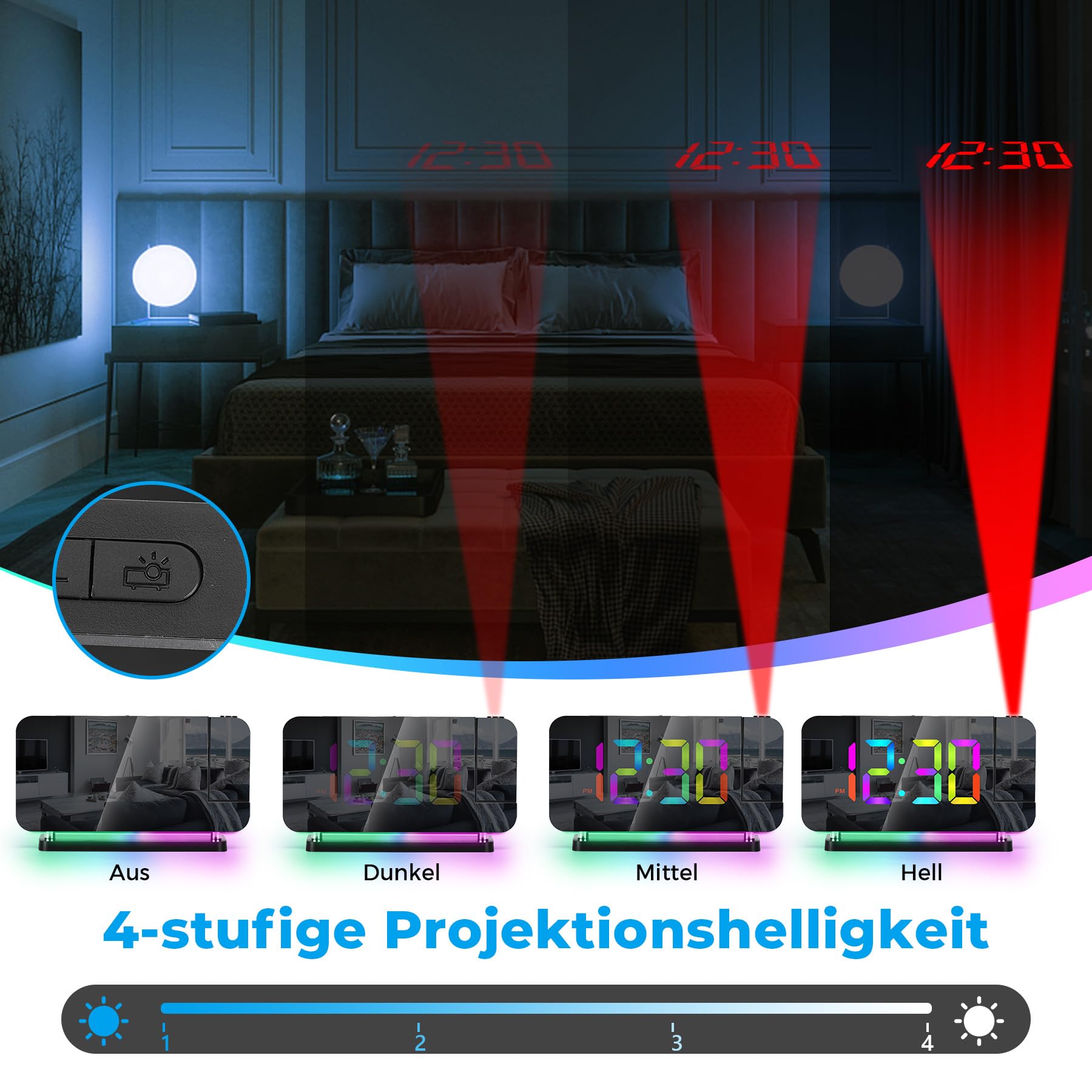 SZELAM Digital Alarm Clock, Radio Alarm Clock with Projection, 7.4" LED Radio Alarm Clock with Sleep Timer, 180° Rotatable Projector, 10-Color Nightlight, 11 RGB Color Digital Display, Digital Table Clock for Kids, Girls
