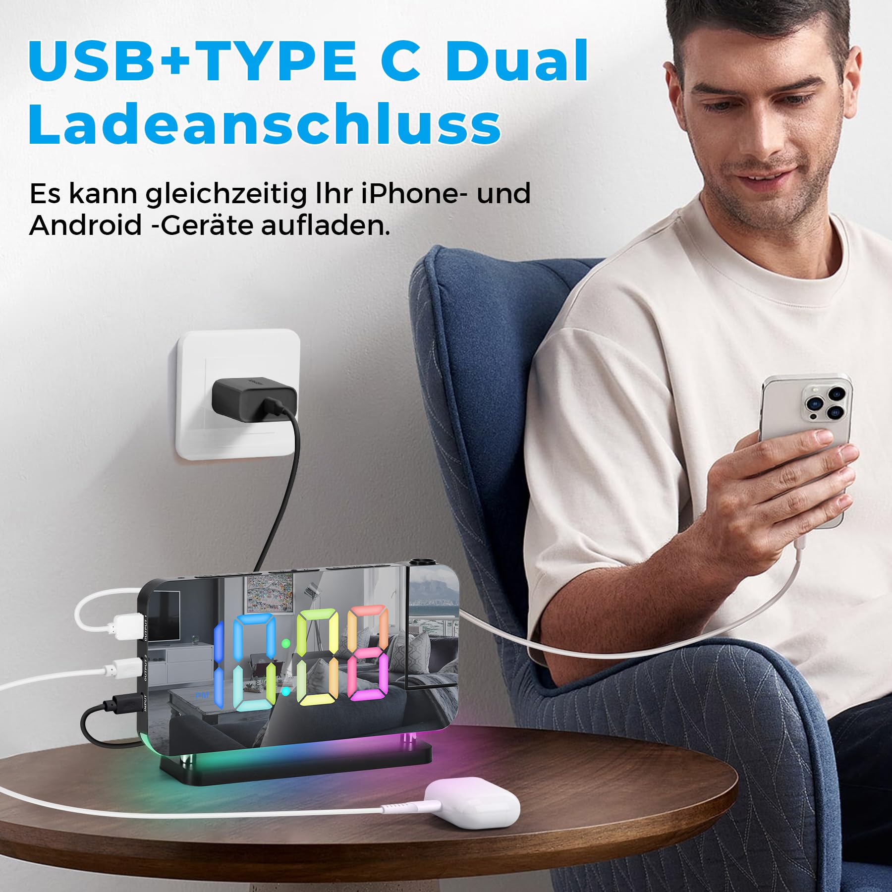 ["【FM Radio and Sleep Timer】The SZELAM alarm clock with projection can store up to 30 FM radio stations (76.0 MHz - 108.0 MHz). With the Sleep function, you can easily fall asleep while listening to the radio. The radio will automatically turn off after a set time (5-60 minutes). With 15 volume levels, you can choose the suitable volume according to your needs. You don't have to worry about it being too loud and affecting your sleep. It's the best gift for adults, teenagers, kids, boys, and girls.","【Projection Alarm Clock】The SZELAM alarm clock can be rotated by 180° to flip the clock display. The projection distance is 5m (best at 2-3m), with 4 levels of projection brightness settings, allowing the time to be clearly projected to the best position on the wall or ceiling for convenient time viewing. Ideal for kids, boys, girls, and children's rooms.","Projection clock with large display: The SZELAM digital table clock is equipped with a 7.4-inch HD LED display and large digital fonts, visible day and night from a distance of at least 20 feet. The large size of the numbers is a blessing for people with visual impairment.","【11-Color RGB Digital Display】The SZELAM digital alarm clock features a color-changing LED display with 4 dynamic RGB colors + 7 solid color modes, allowing you to adjust the screen brightness from 0 to 100% to customize the screen display according to your needs. Comfort level for your needs. Provides you with a different visual experience and you can choose your favorite font color.","【10 Color Night Light Modes】The SZELAM projection alarm clock has 10 night light modes and 5 adjustable brightness levels. Ideal for bedside table, bedroom, or home decoration. The light provides uniform colors and dynamic RGB color variations, providing night lighting and creating an incredible atmosphere in your room. A great gift for seniors, kids, and parents.","【Dual USB Charging Ports】The bedside alarm clock has a USB Type-C output port and a USB-A output port, allowing you to conveniently charge your phone and other devices overnight. Very practical and convenient to solve your charging problems.","【Snooze Function and Alarm Function】The RGB LED radio clock is equipped with a snooze button on top, which can be turned off as desired, allowing you to easily get 5-60 minutes of snooze time; BuOne &rd Alarm with two modes, \"rd\" alarm mode, when the alarm time expires, it automatically switches to radio mode, alarm/radio mode, to meet the needs of your different hobbies ys just","You will receive: 1 x SZELAM Digital Alarm Clock + 1 x Power Adapter + 1 x USB Charging Cable + 1 x Product Manual + 30 days unconditional refund/replacement + 1 year warranty. (If you are not satisfied with the SZELAM large display alarm clock, please contact us.)"]