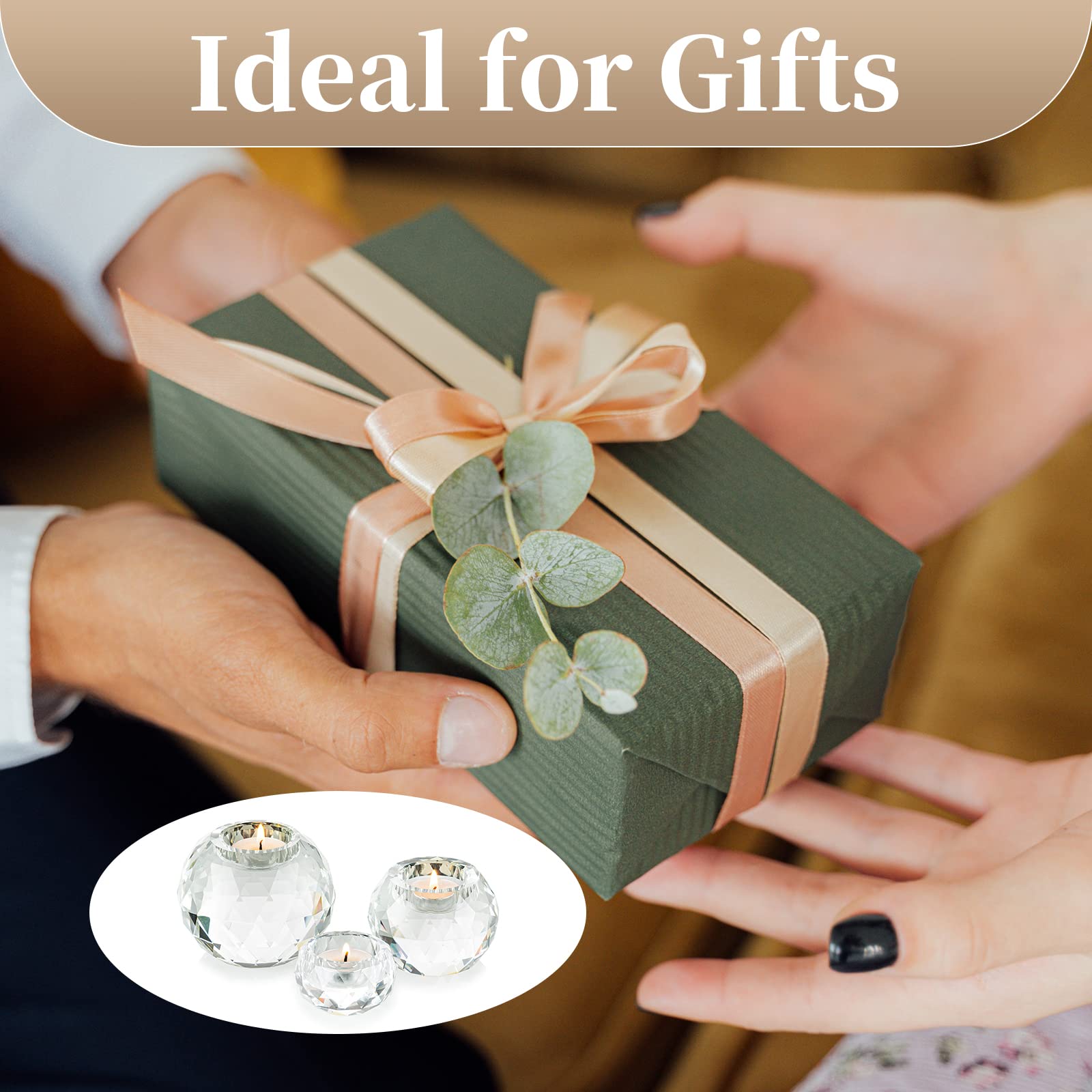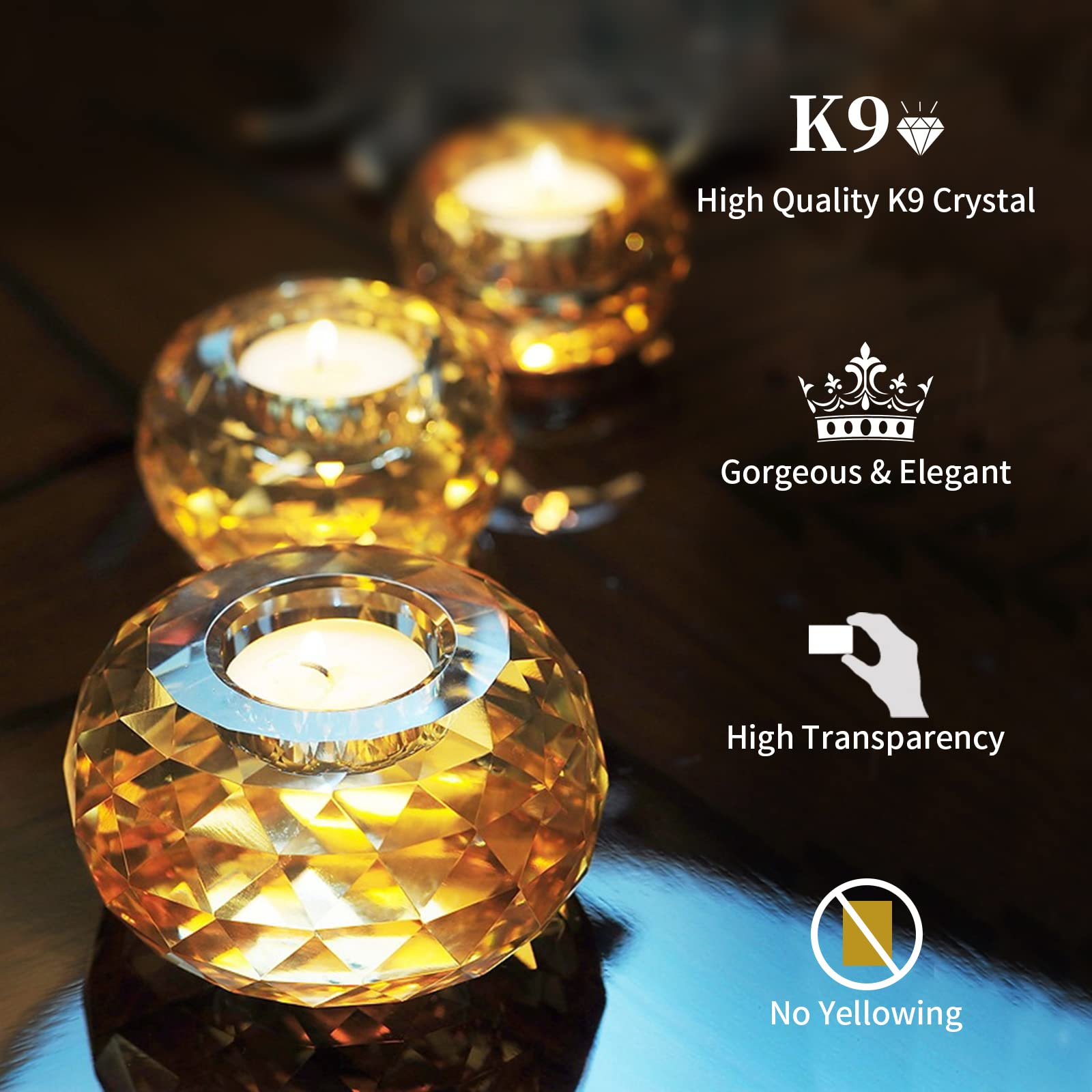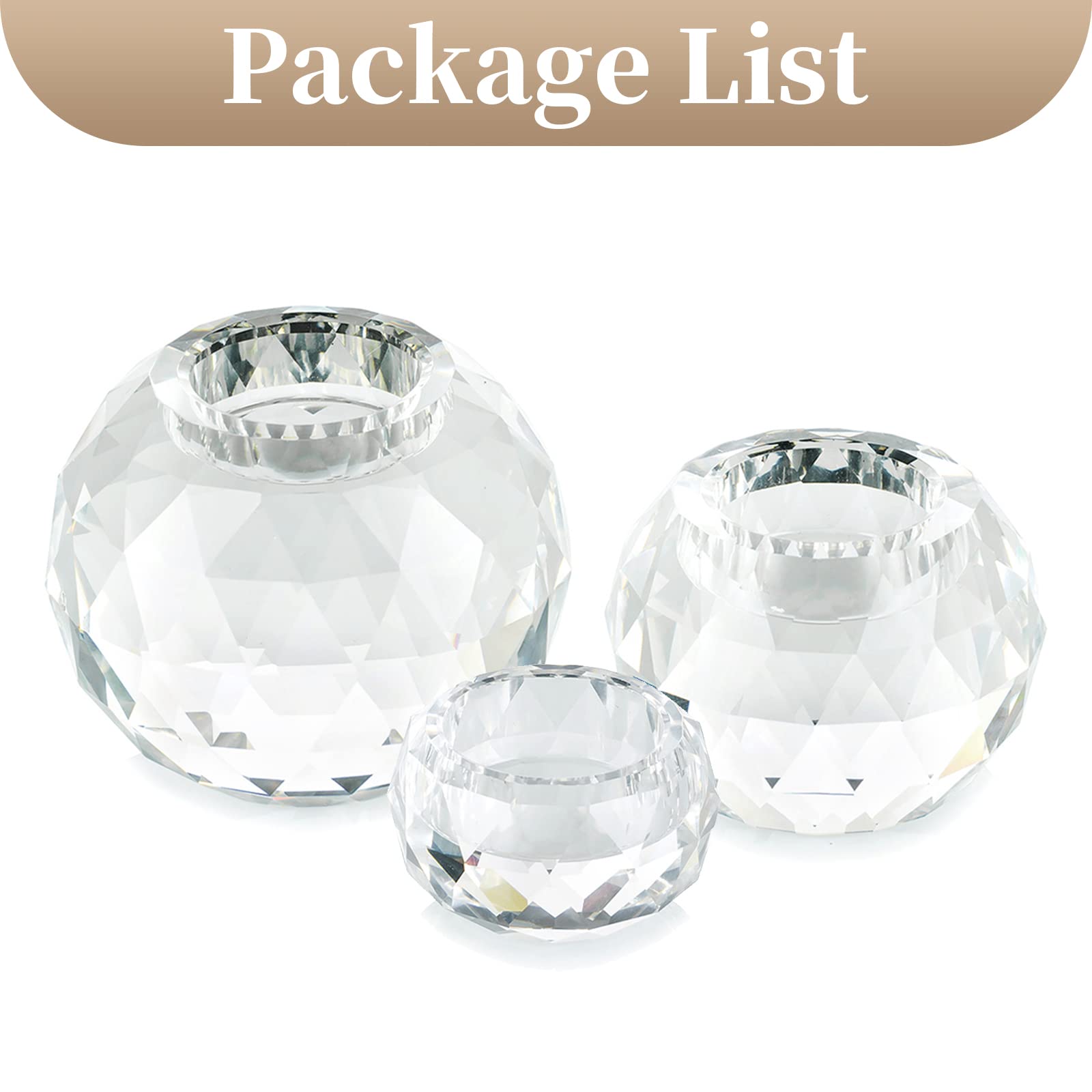 ["[Premium Material] - The K9 crystal is selected as the material, transparent, heat-resistant, flawless, and durable. With a good solid weight, the crystal ball tea light candle holders stand more stable on the table.","[Polyhedral Surface] - The candle holder sets are professionally hand-polished, making the crystal as bright as diamonds. The polyhedral glass ball is designed to reflect the surrounding colors and bring you dreamy visual effects.","[Wide Application] - Our modern tea light holders are ideal for a variety of design settings or home decors. It will be a great centerpiece for tray, living room, desert table, cocktail table, dining table, restaurant, hotel, bedroom, and study room. Perfect for daily use and various special occasions such as meditation, celebrations, fancy dinner parties, or holidays, etc.","[Ideal Gift] - A perfect gift for your loved ones, friends, or families for Christmas, wedding, Thanksgiving, Valentine's Day, Halloween, birthday, New Year, Mother's Day, anniversary, or other holidays or special occasions. Perfect as a housewarming or wedding gift.","[Package Includes:] - You will receive 3 pieces of tea light holders in different sizes. SMALL: 6 cm wide, 3.5 cm high, with a candle hole of 4 cm diameter; MEDIUM: 8 cm wide, 5.5 cm high, with a candle hole of 4 cm diameter; LARGE: 10 cm wide, 8 cm high, with a candle hole of 4 cm diameter. (Candles not included)"]