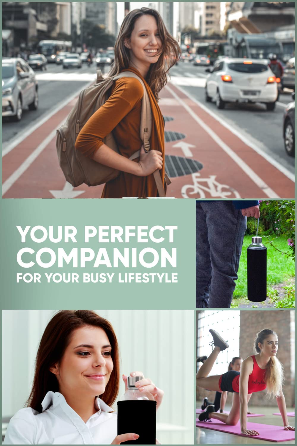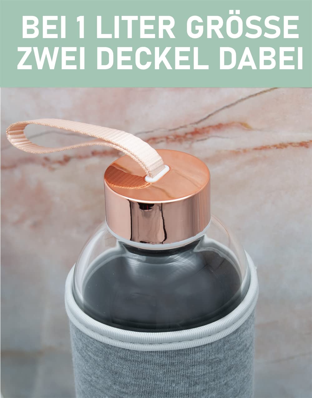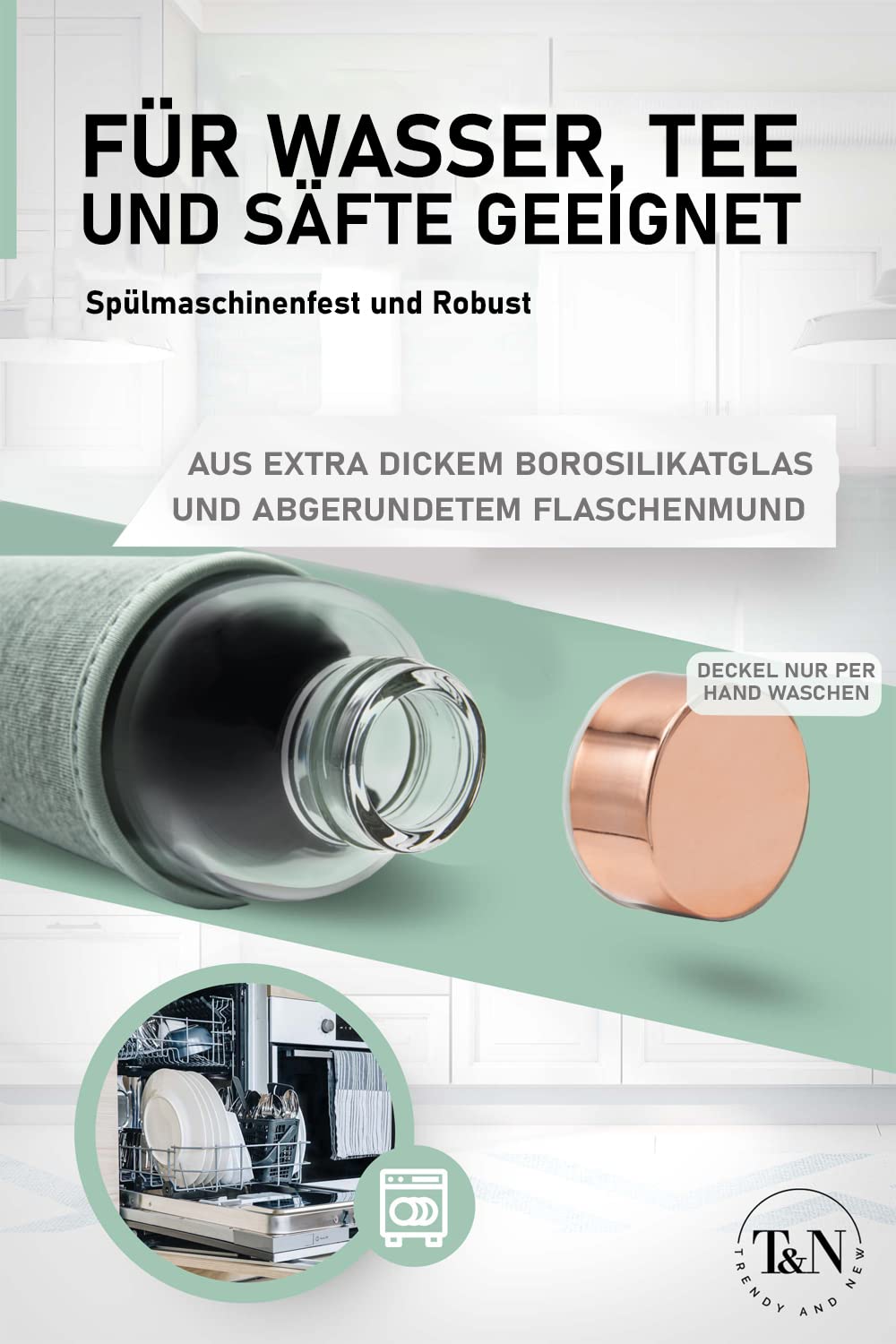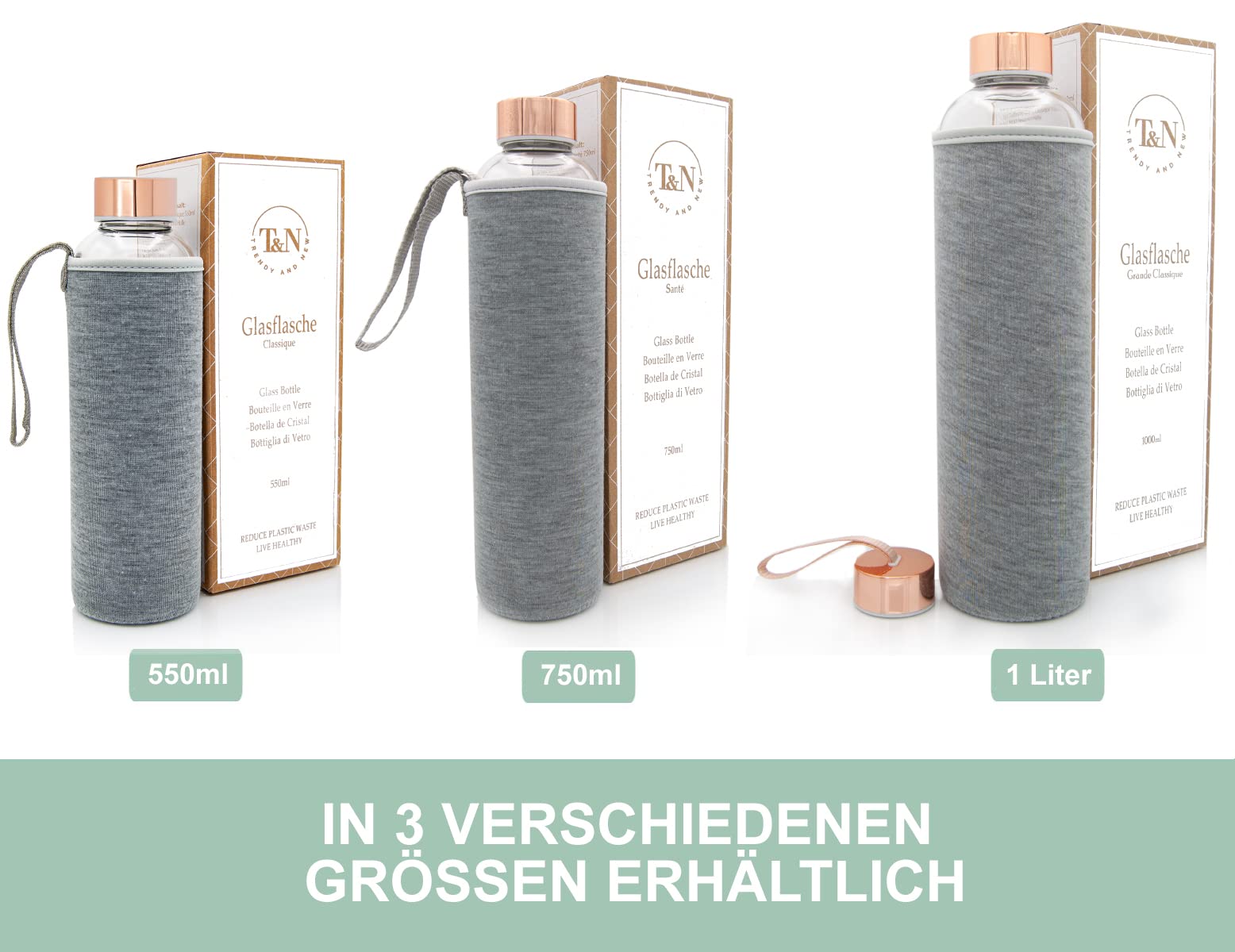 ["Want to drink more for a healthier life? - The high-quality and guaranteed pollutant-free glass drinking bottles from TRENDY AND NEW are the perfect solution for you! Enjoy the pure taste of your favorite beverage. Whether it's water, tea, or juices. Here you will definitely find the right glass bottle for you, just like our 40,000 satisfied customers. Available in 18.6oz, 25.4oz, or 33.8oz capacity.", "Do you love water, tea, or juices? - Then order the new 1-liter T&N glass bottles made of extra thick borosilicate glass and guaranteed to be 100% free of BPA and PVC. Also suitable as a carafe.", "Easy cleaning - To clean the glass bottle, remove the lid and the neoprene sleeve. You can either wash the bottle in the dishwasher or by hand. The neoprene sleeve can be washed in the washing machine on the gentle cycle. Please do not wring out the sleeve to optimize longevity. Please hand wash the lid.", "Textured neoprene sleeve - The sleeve protects the bottle from wear and can be easily removed according to your preference. The protective sleeve is particularly ideal for on-the-go in your handbag or backpack.", "ORDER NOW - 100% Satisfaction or Money Back. If you are not completely satisfied, simply return the T&N drinking bottle within 30 days. CUSTOMER SERVICE IN BERLIN is here for you! Thousands of customers trust our products. Add your new T&N glass drinking bottle to your cart NOW."]