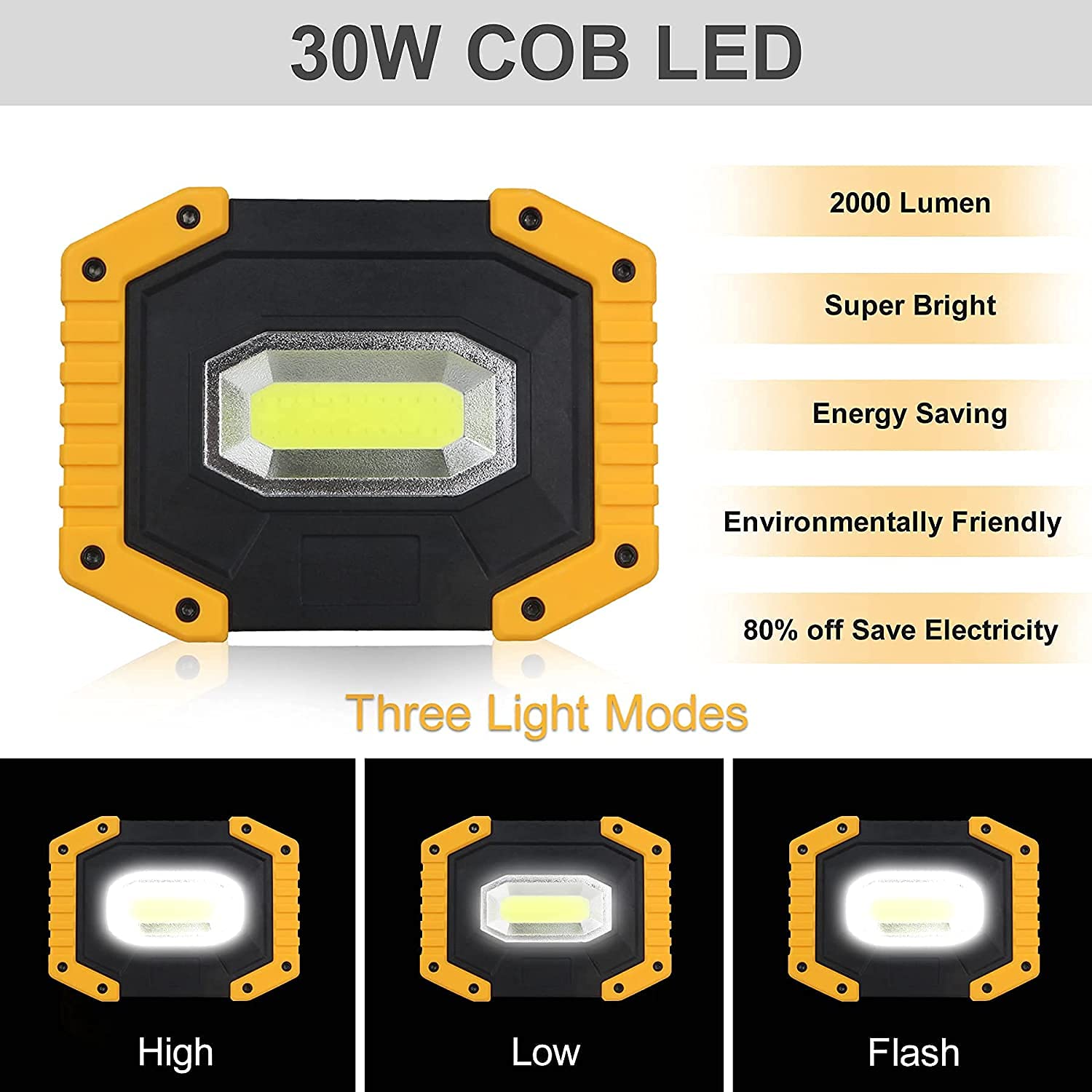 ["đ«ăSuper Brightă T-SUN portable work light provides at least 2000 lumens to ensure high brightness in darkness.","đ«ăDurable Material and Waterproofă Made of high-quality plastic shell, anti-aging, anti-corrosion, and impact resistance. IP65 waterproof to ensure the rechargeable work light works perfectly on rainy days.","đ«ăRechargeable and Battery Poweredă Supports two different types of batteries: 2 x 18650 lithium-ion batteries (included) or 4 x AA batteries (not included). A USB cable allows for fast and convenient charging. Also serves as a handy power bank for charging your phone.","đ«ă3 Modesă With 3 lighting modes: High brightness mode, Medium brightness mode, Strobe mode (white light). The work light can meet all situational needs and ensure it can handle emergencies.","đ«ăPortable Handleă With the 180-degree adjustable lamp stand, you can hang the lamp anywhere, on the truck or in your hand, etc., to easily handle different working environments."]