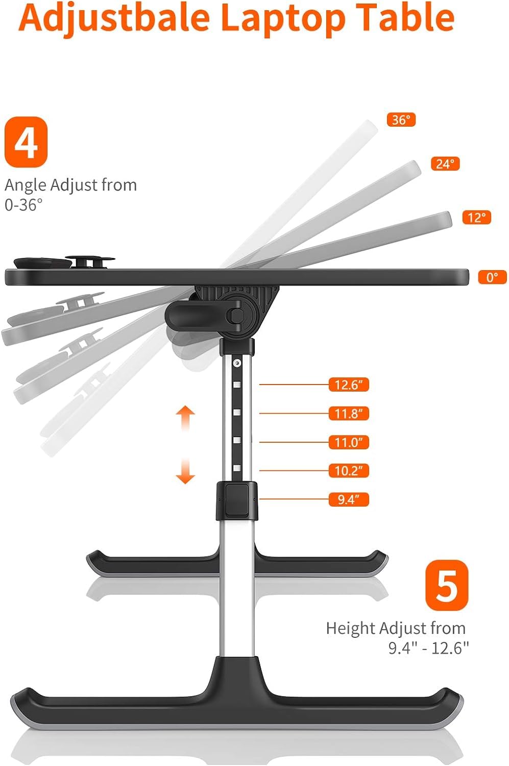 Table, Bed Table, SAIJI Laptop Stand, Breakfast Tray, 5 Heights, 4 Angles, Stable Folding Table for Bed Sofa Desk, Up to 17'' Laptop (60 * 33cm Black)