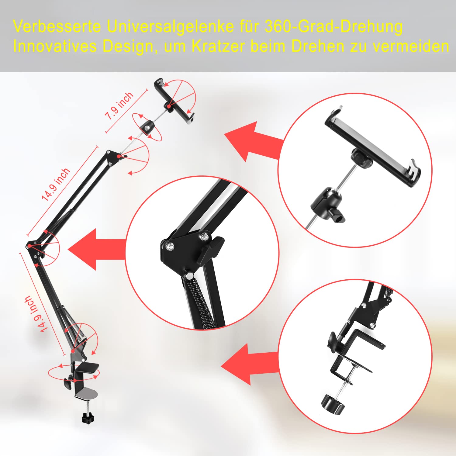 ["The partner for bed entertainment: The sturdy mechanical aluminum arm holder is equipped with 4 super strong springs to carry more weight (maximum load: 1200g), Free your hands while watching tablet or mobile phone in bed in winter.","Wide Compatibility: It is compatible with all devices between 4.5-12.9 inch screen. This mobile stand holder is compatible for mounting iPad Pro 12.9", 10.7" or 9.7"/iPad Air, iPad Mini & All Tablet & All Smart Phone.","Adjustable and Multifunctional: The worldwide tablet arm stand with 4 joints, which is completely adjustable and can rotate 360 degrees. It can be suitable for vertical surfaces like headboard, or used on horizontal surface like desk. Whether you are standing, sitting or lying in bed, bend the arm holder and rotate it to the most comfortable viewing position.","Easy to install: No tools required, it can be widely installed on bed boards, cabinets, tables, bookshelves or any surface with a thickness of more than 52mm.","Reliable Construction: We listened to the voices of many consumers and added a lot of weight to the base to make this stand more stable. The preferred double support structure is maintained for arm strength. And keep components in steel to maintain its reliability."]