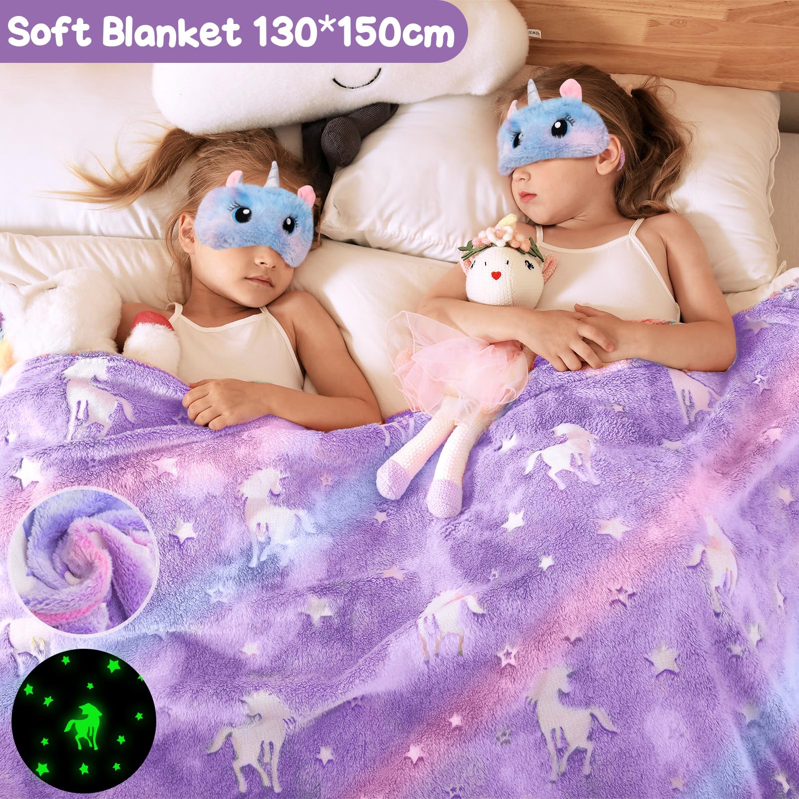 "UNICORN GIFT SET: Our unicorn gift set includes 1 glow in the dark blanket (150 x 130 cm), 1 glowing pillowcase (40 x 40 cm, pillow core not included), 1 stainless steel water bottle, 1 eye mask, 1 unicorn keychain, 1 shoulder bag, 2 bath bombs. This great gift set is suitable for any girl aged 4 to 12 who loves unicorns, and will definitely become her favorite birthday gift for Christmas.