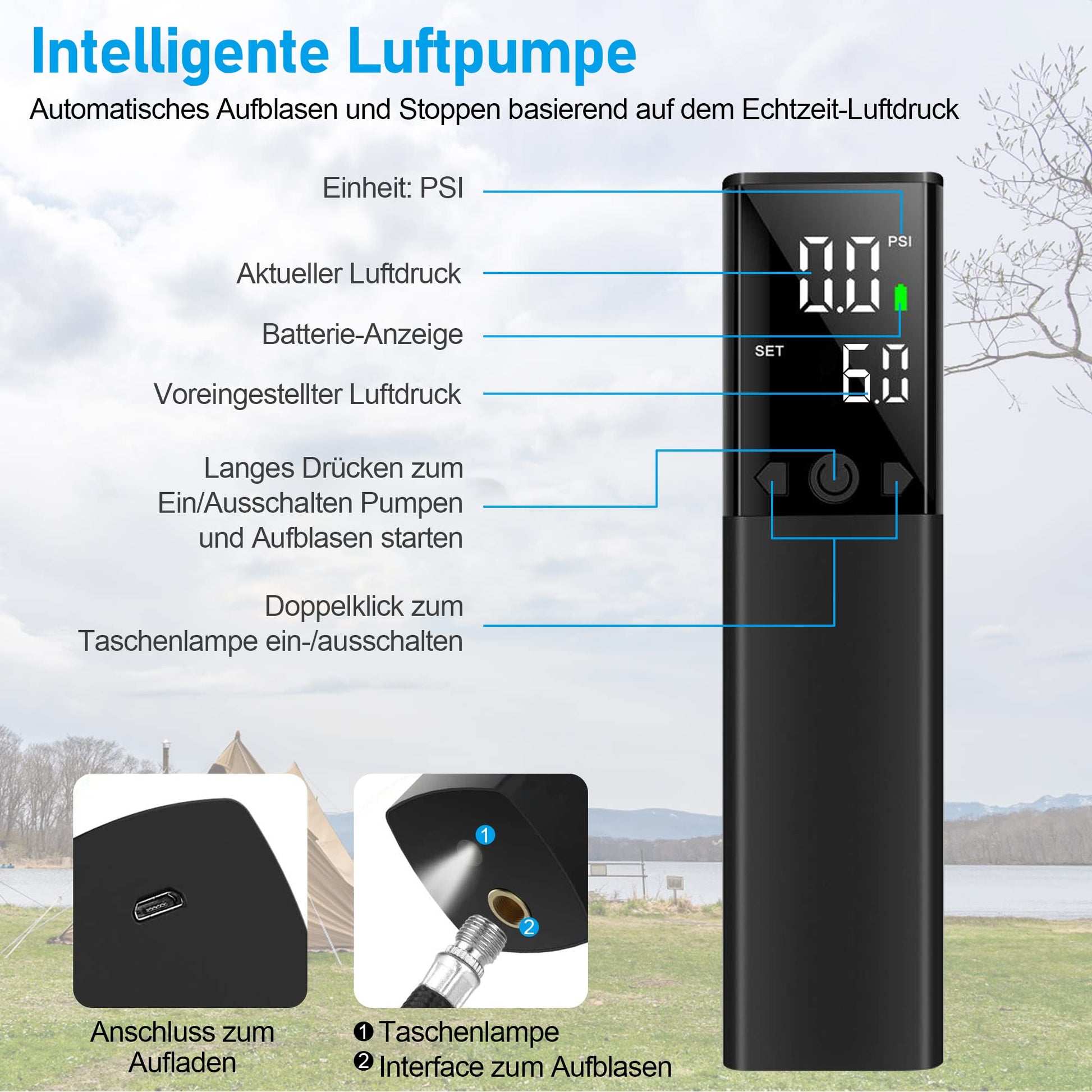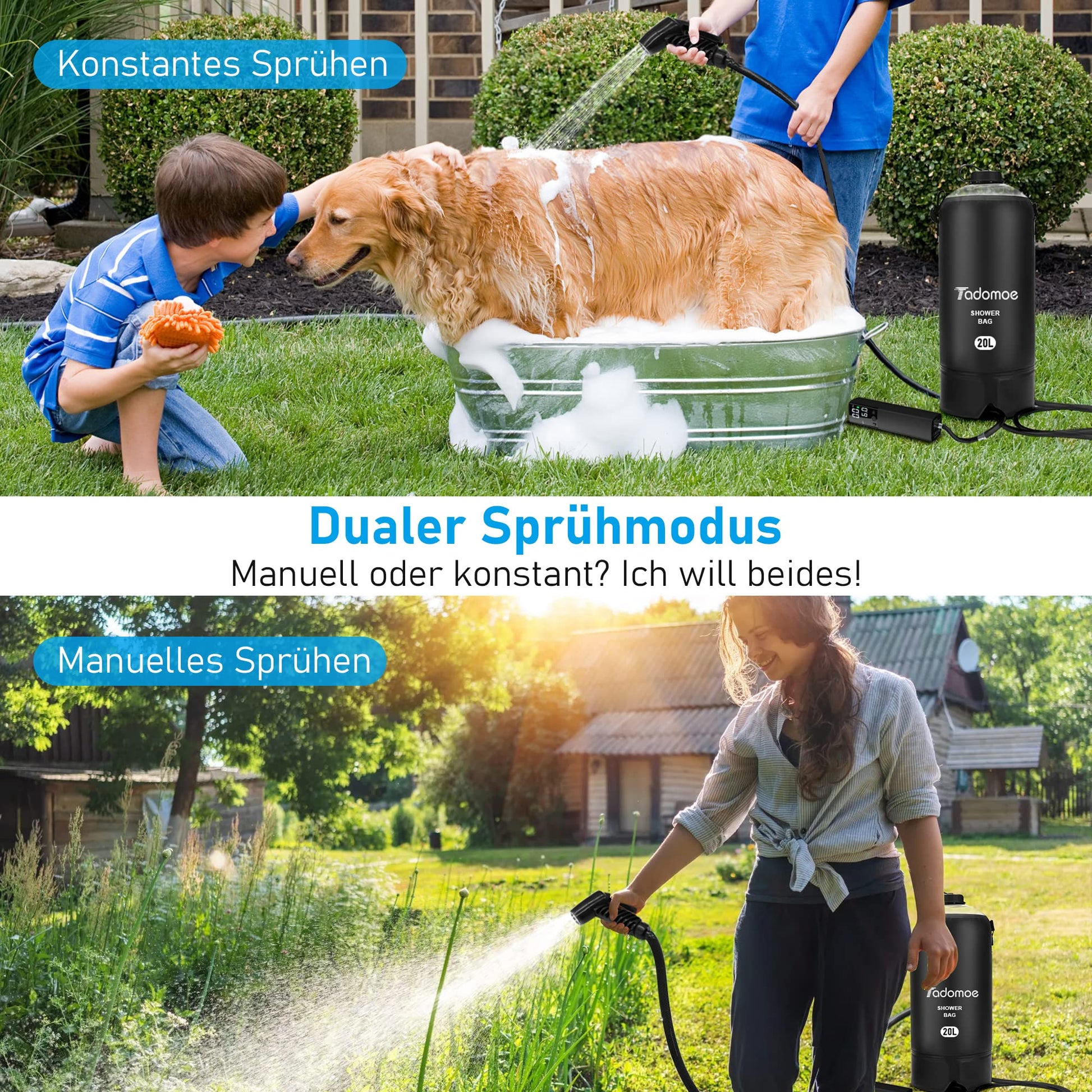["Large capacity, quick refreshment: 5 gallons/20 liters is enough for 3 quick rinses, place it in full sunlight, then enjoy a warm shower, embrace the bliss outdoors. Enjoy a refreshing shower wherever your adventures take you, such as hiking, bathing muddy pets, watering plants, washing windows, in the garden, or rinsing sand at the beach.","Rechargeable, smart shower pump - The camping shower pump with intelligent pressure detection stops working once the air pressure from the shower bag reaches 6.0 PSI and automatically starts working once the air pressure drops below 5.0 PSI. The flashlight at the bottom is suitable for emergency use.","High-quality outdoor shower bag - Portable shower head with hose, two adjustable spray settings; environmentally friendly PVC material, well cut and leak-proof; easy to fill screw cap; reinforced and durable handle strap; transparent top clearly shows the water amount.","Portable outdoor shower - approx. 25 (T) x 15 cm (H) (9.8" (D) X 5.9" (H)) compact travel case, less than 3 pounds (1.36 kg) total weight (including shower bag, spray device with hose and air pump), easy to carry, essential accessory for beach trips, camping, hiking, hunting, etc.","Pack and Go - Are you going camping, hunting, backpacking, fishing or hiking? Doing outdoor sports or a beach trip, but having warm water for showers would make your hobby even better? Then you need our outdoor shower. Perfect for quick showers, rinsing sand off your feet, washing muddy paws of pets and children, rinsing, pet care, watering flowers in the garden, etc."]