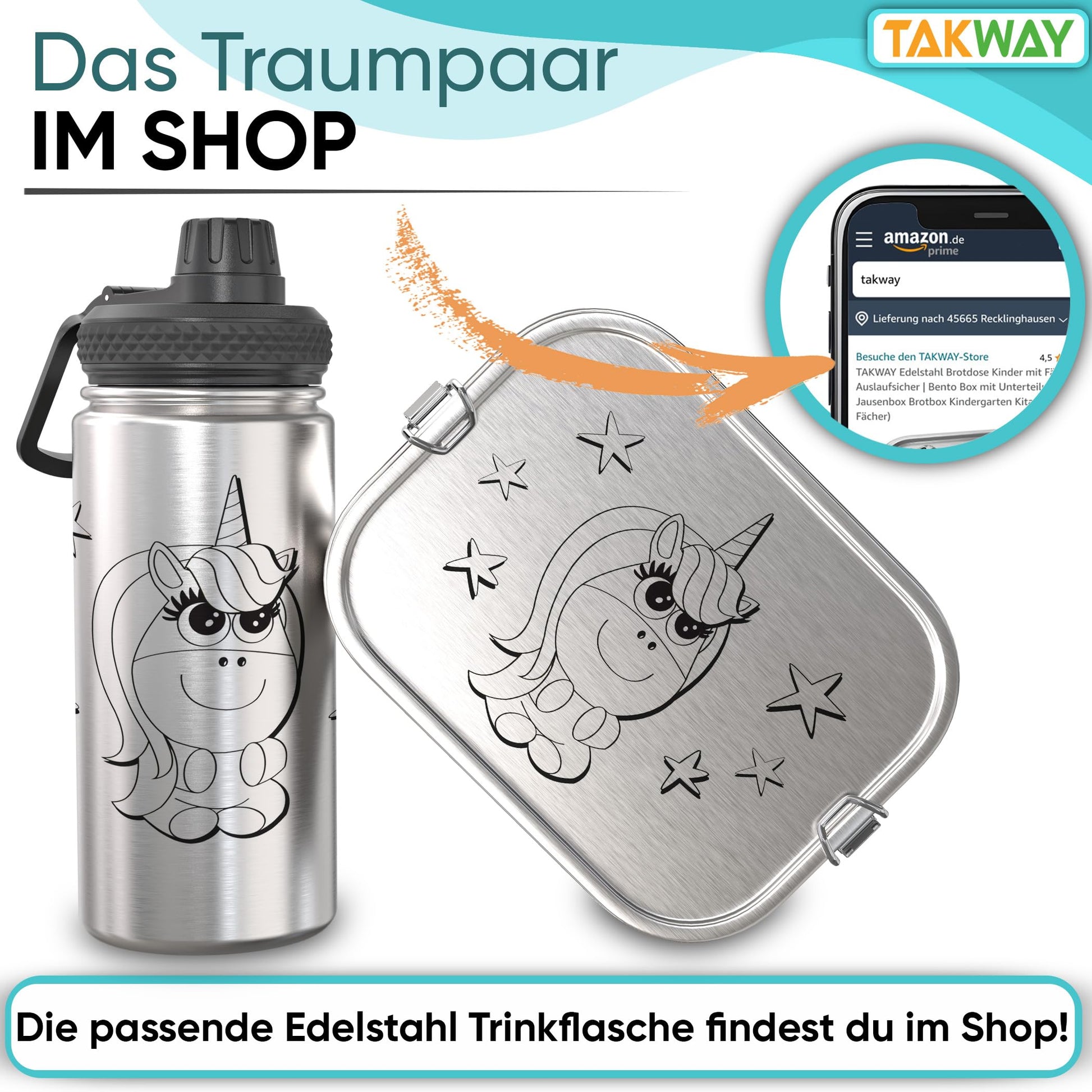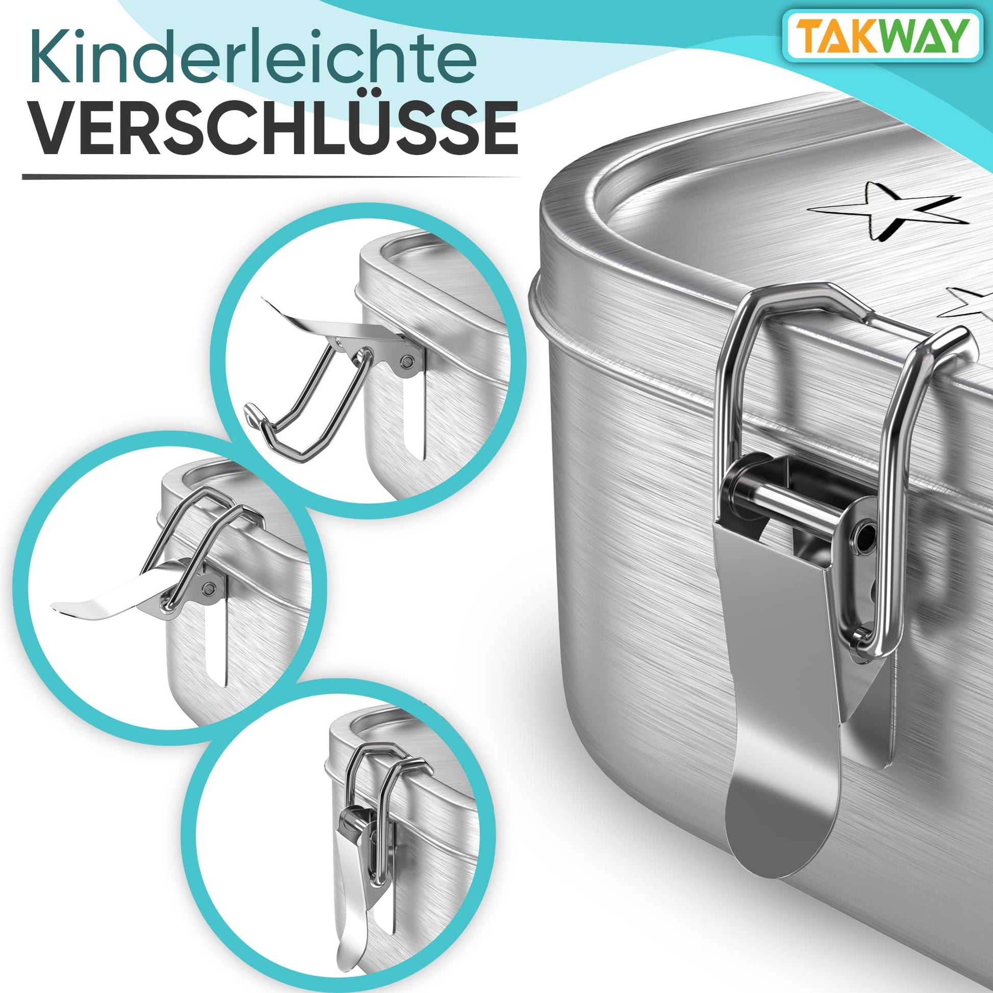 [""]"✅ROBUST & ABSOLUT SICHER - The TAKWAY lunch box with compartments is made of high-quality stainless steel 18/8 and extremely durable. Our lunch box is free of BPA or other harmful substances. All edges are carefully folded and polished, so there are no sharp edges.","✅DURABLE & DISHWASHER SAFE- The design is permanently and vividly engraved in the stainless steel and still looks perfect after years and countless trips through the dishwasher. Nothing ever peels off here!","✅LEAK-PROOF & LIGHTWEIGHT - The silicone seal in the lid of our lunch box keeps it 100% leak-proof. Whether it's fruit, muesli, or yogurt, nothing will leak out here and the bag stays clean! At 300g, it is also a real lightweight.","✅FLEXIBLE & VERSATILE - Our bento box comes in two different versions: with a movable partition or with 3 permanently welded compartments. This makes a varied diet child's play!","✅EASY TO OPEN - The secure clip closures prevent accidental opening and can be easily mastered by small kindergarten children with a little practice.","✅SUSTAINABLE - Our lunch box is plastic-free and packaging is also avoided. This way, you make a valuable contribution to environmental protection and help to avoid plastic waste from single-use items.","✅SPECIFICATIONS - Dimensions 17 x 13 x 6cm | Weight 300g | Capacity 800ml | Materials Stainless steel 18/8, Silicone | dishwasher safe"