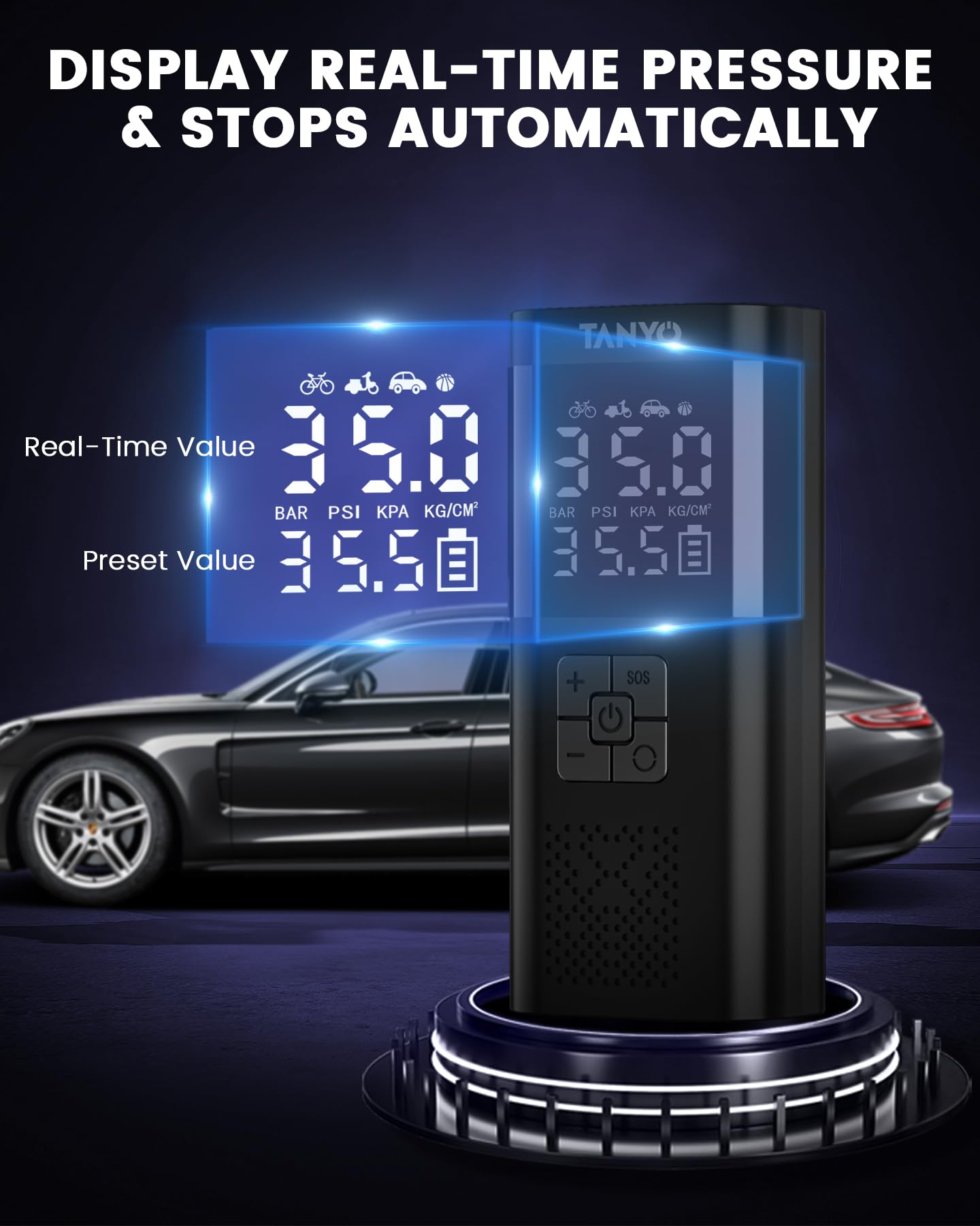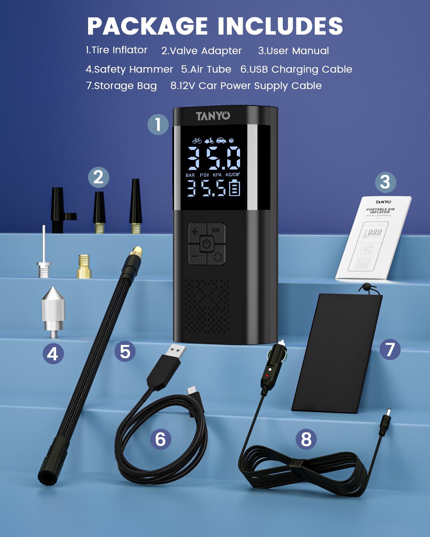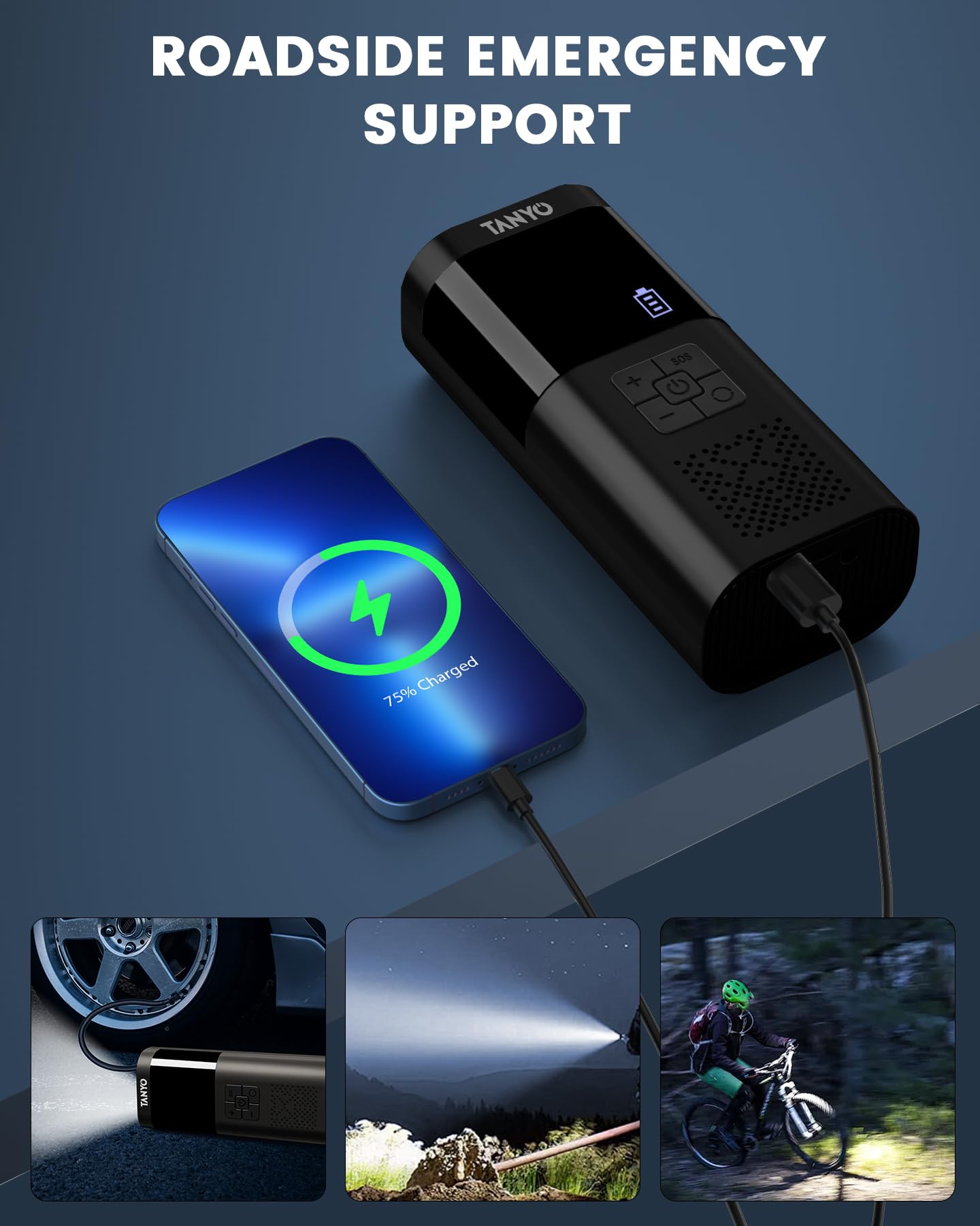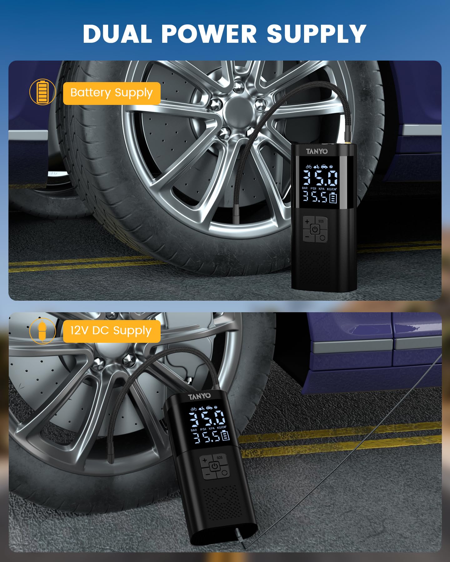 TANYO Electric Air Pump Bike Battery Compressor, 150PSI Mini Electric Bike Pump with Gauge, Portable Electric Air Pump with USB LED Light for Car, Bike, Motorcycle, Balls