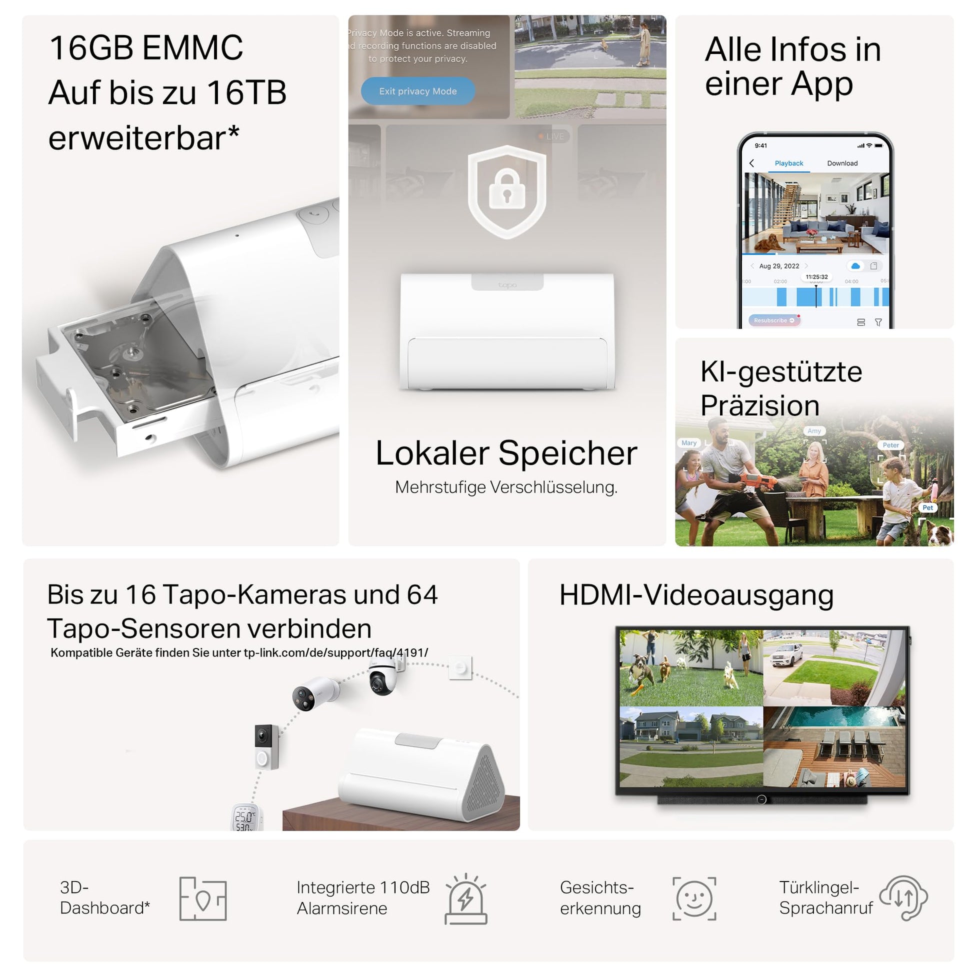 Tapo H500 HomeBase, 16GB built-in, expandable storage up to 16TB, supports 16 Tapo cameras & 64 sensors, local storage, HDMI, 5 GHz WLAN/Ethernet, built-in alarm, Matter compatible.