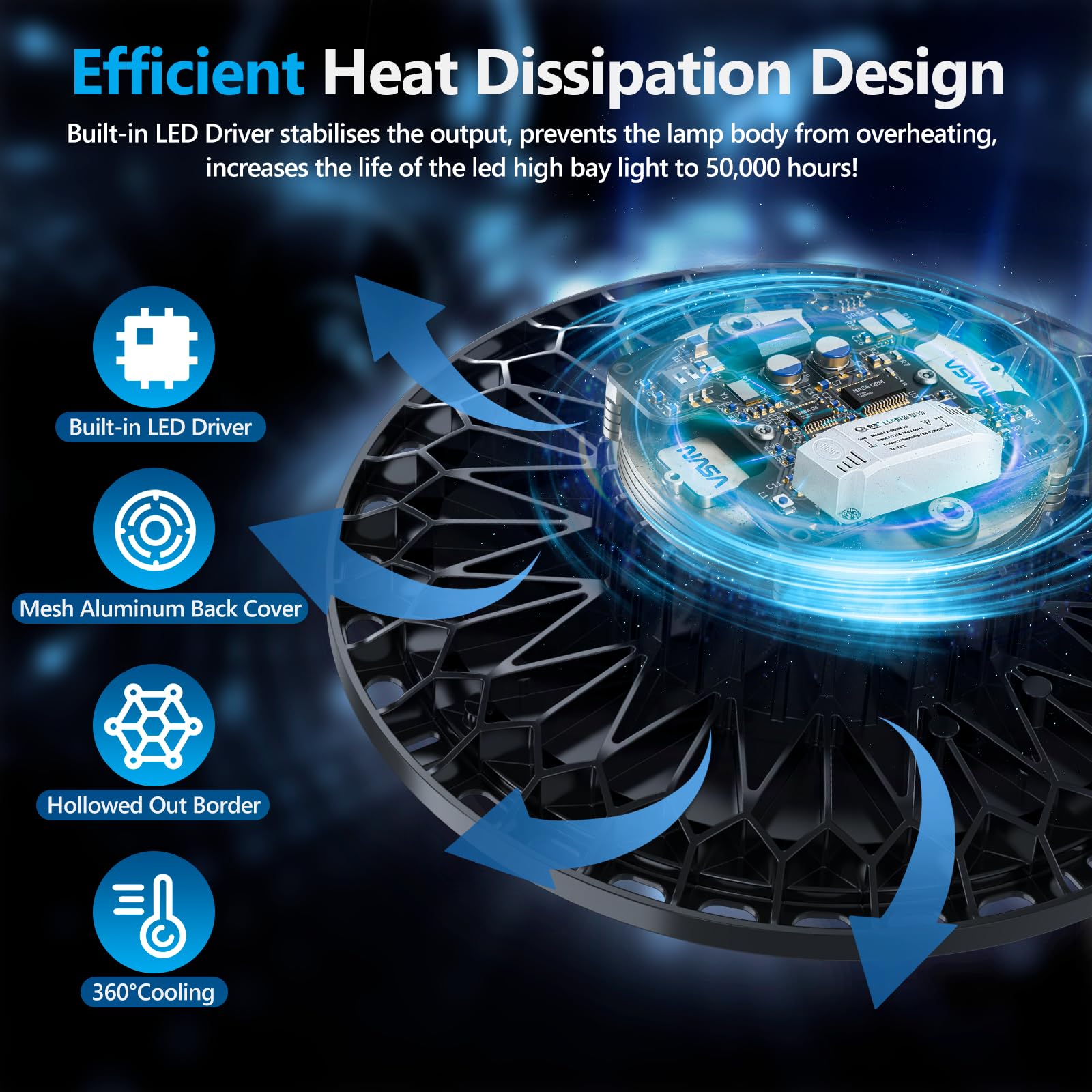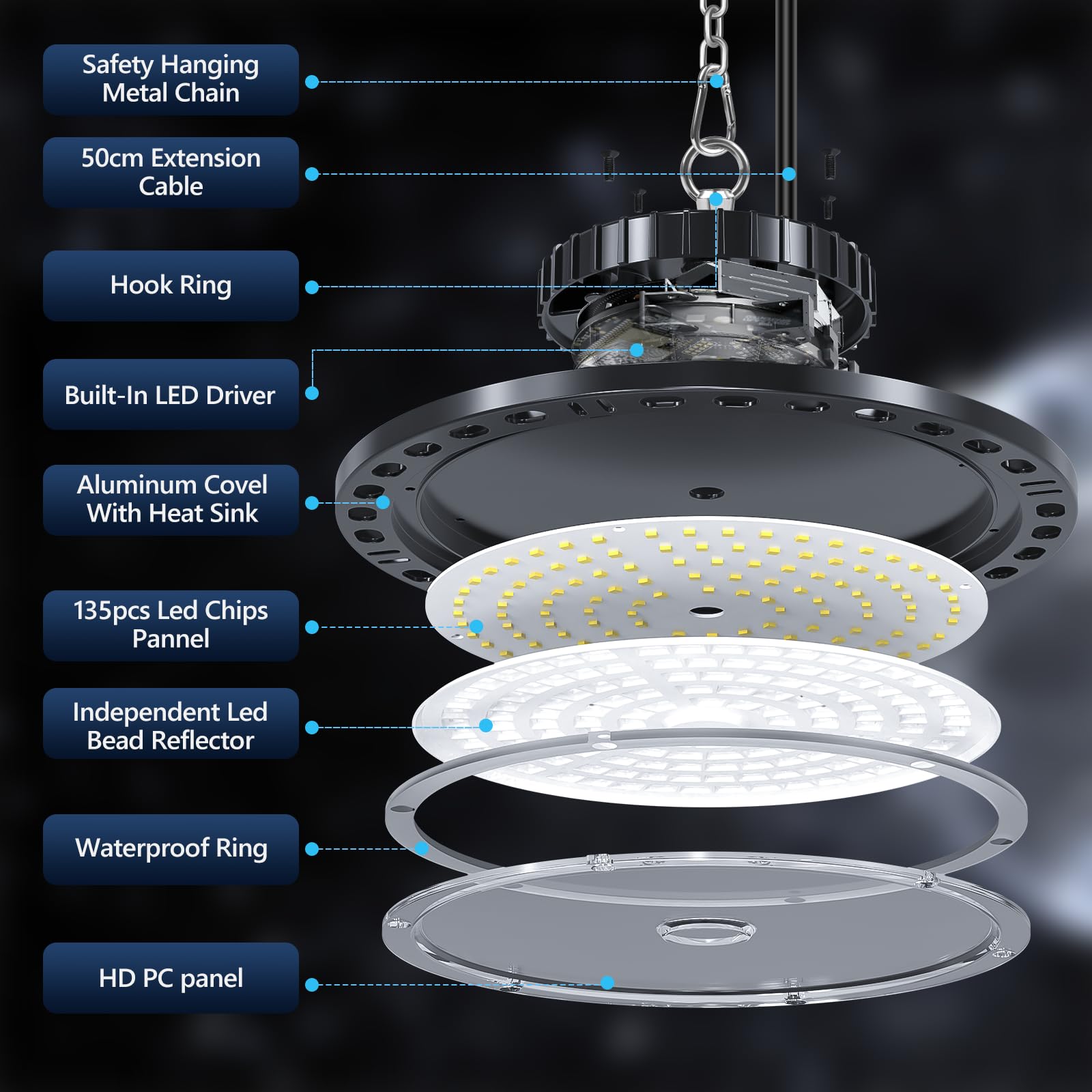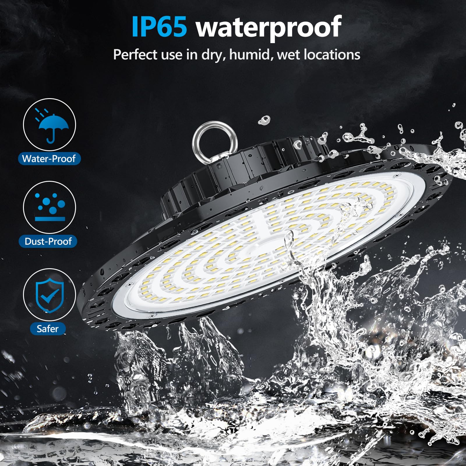 ["Stylish and Unique Design: Our high bay LED light fixture features a unique 3 blade design and 135 high quality LED chips. Each chip utilizes a fan-shaped reflector that significantly increases brightness and provides powerful lighting for all lighting needs", "Ultra Bright and Energy Efficient: UFO workshop LED light 100W, it has an extremely high brightness of 10,000 lumens and 100 lumens/watt. Saves over 85% electricity. Very suitable for large workshops, factories, warehouses, schools, supermarkets, and other spaces", "Robust and Durable Construction: The back of our UFO garage light is made of aluminum die-casting with a hollowed-out design that withstands high temperatures, corrosion and provides efficient heat dissipation. The internal LED driver ensures stable voltage and extends the life of the LED floodlight up to 50,000 hours", "IP65 Waterproof & Wide Application: This high bay LED light has an IP65 waterproof and dustproof design, no need to worry about the product being damaged by bad weather conditions! LED high bay light suitable for workshops, industrial buildings, factories, warehouses, gymnasiums, shops, garages, supermarkets, storage areas, offices, and other industrial and commercial spaces", "Easy Installation: The LED garage light is equipped with a scientifically designed hook and safety chain, providing additional protection for installation. And provides a 65cm extended cable, just need simple steps to complete the installation"]