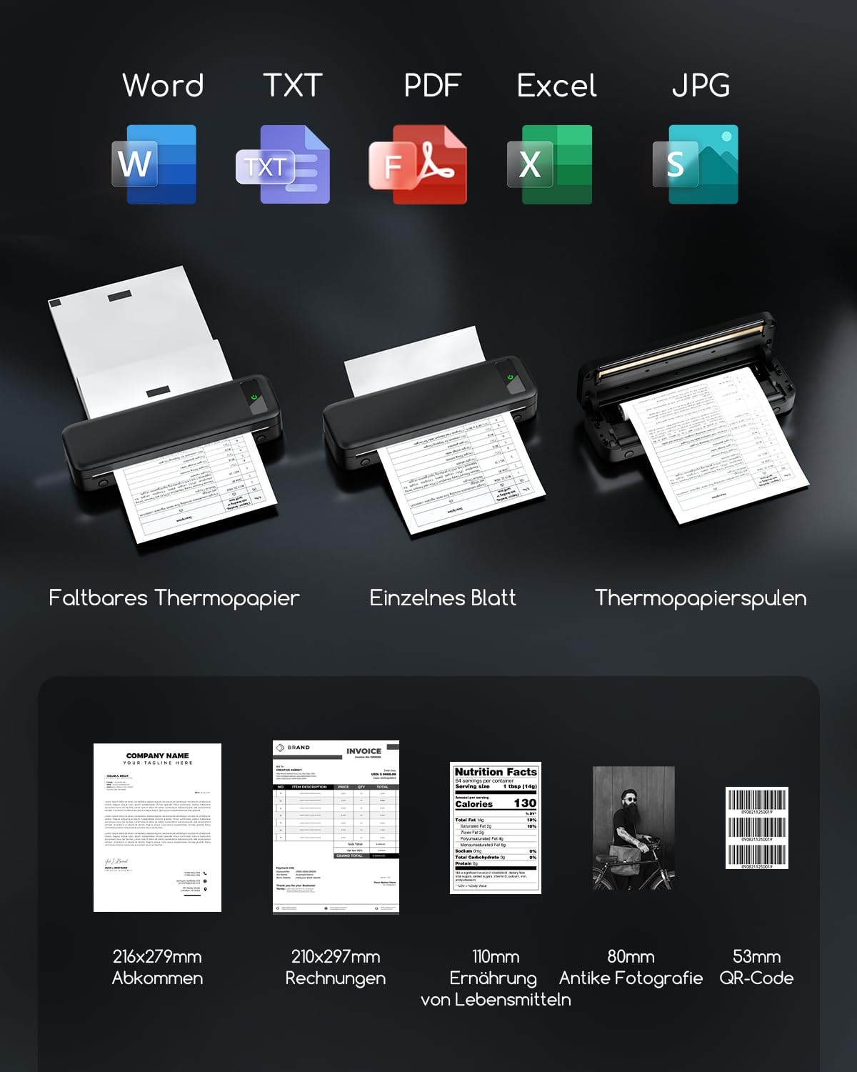 Supported Paper Types: Compatible with thermal paper in roll, continuous, single, and foldable. Five sizes for thermal sensitive printing paper with widths of 8.5/8.25/4.3/3.15/2.1 inches, exclusively uses thermal paper - not compatible with standard paper."