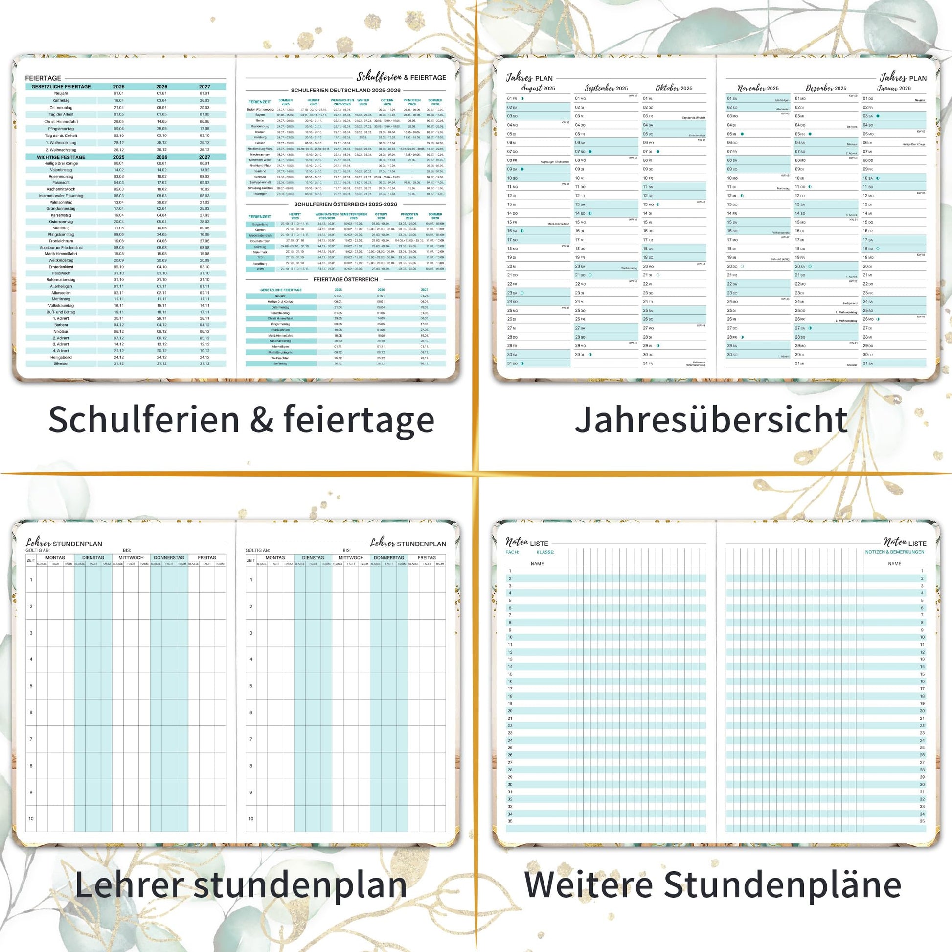 FEATURES: 2025-2026 School holidays & holidays for Germany & Austria + Monthly overviews and annual overview from August 2025 to July 2026 + Teacher timetable + Notes list + Notes + Class list and much more!